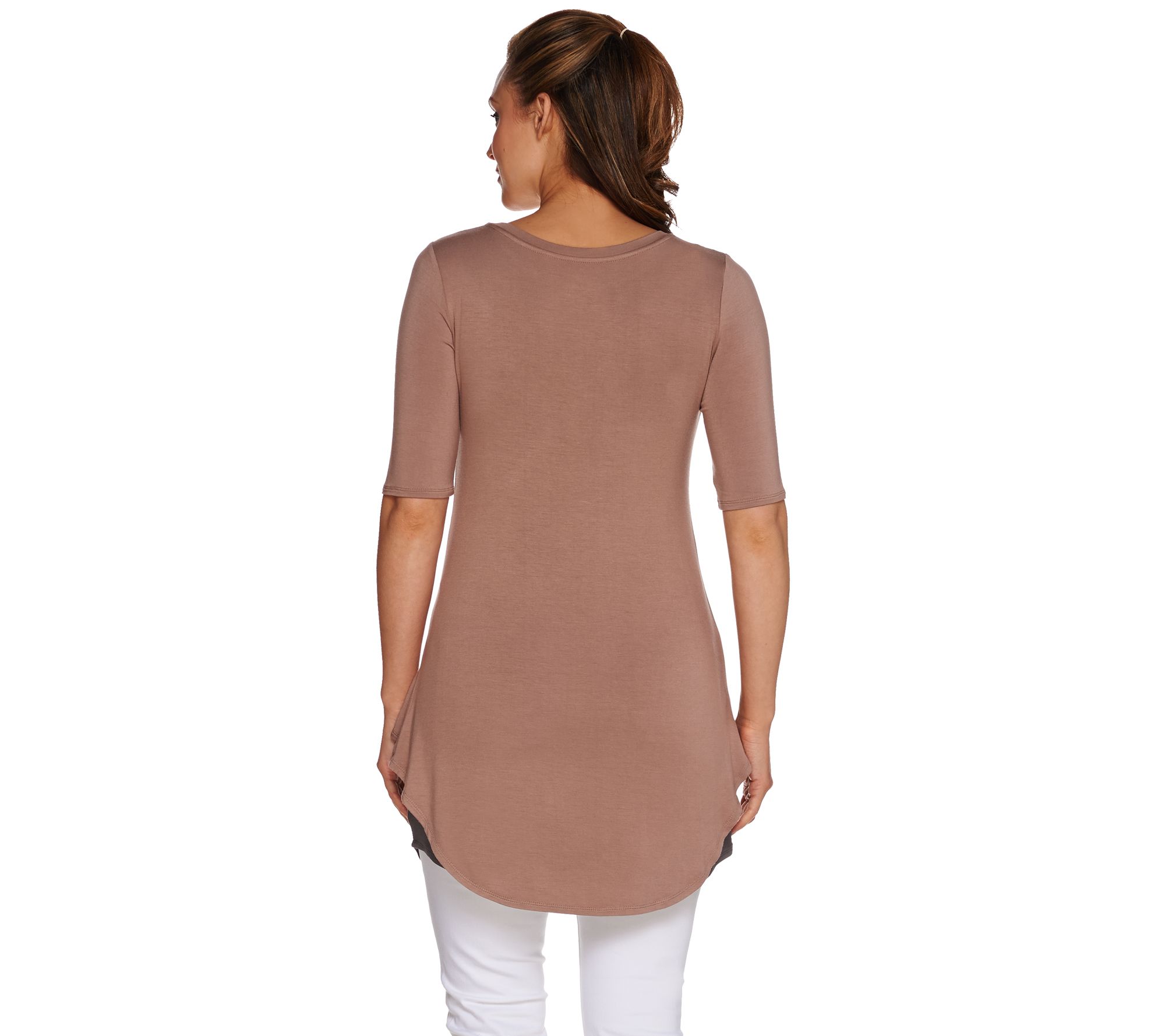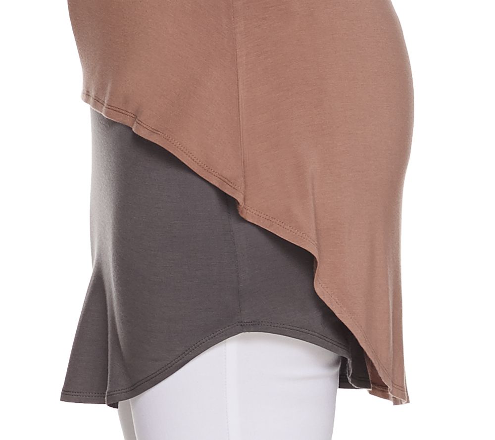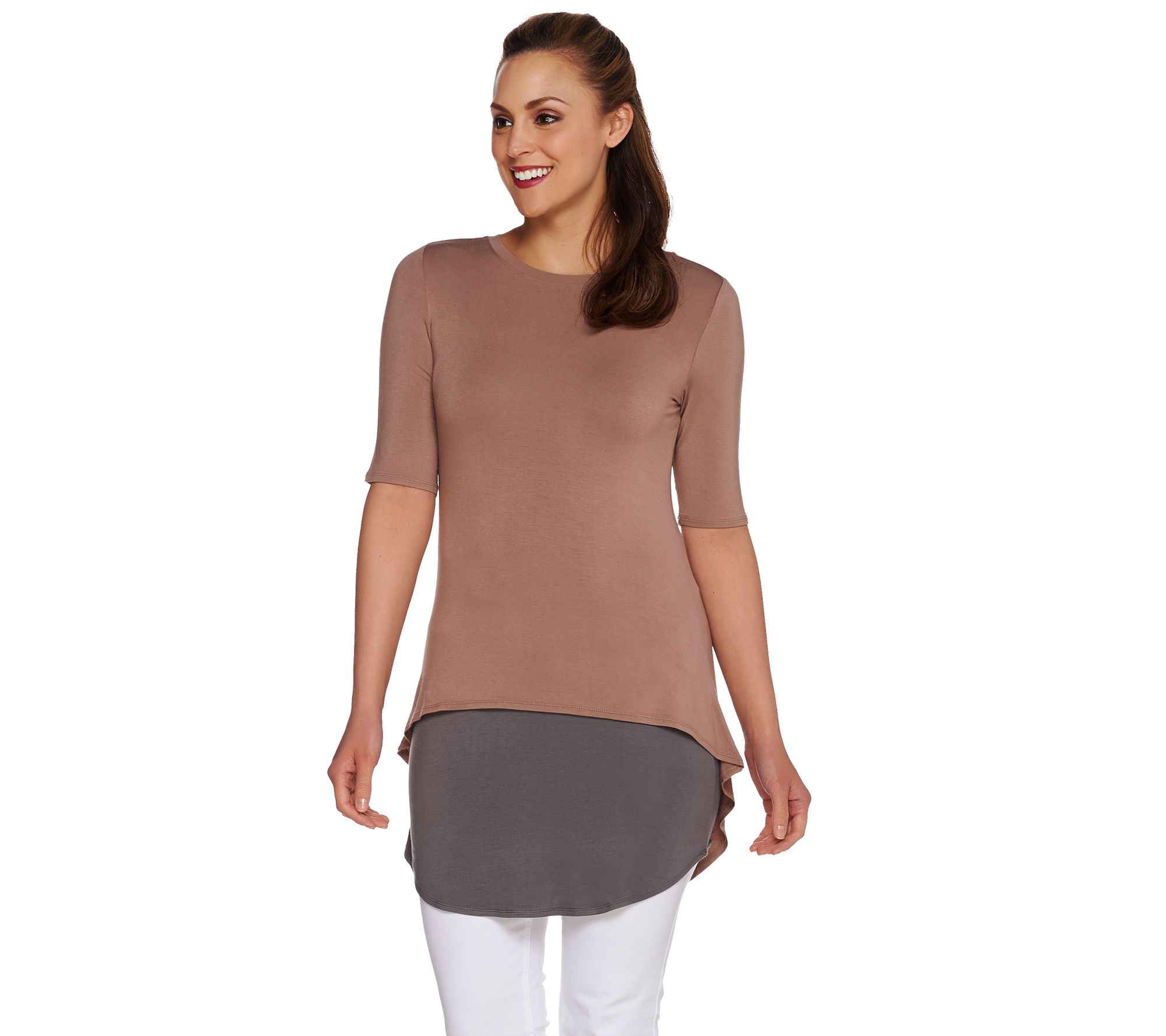 • Features: elbow-length sleeves, hi-low hem, attached tank visible at bottom hem