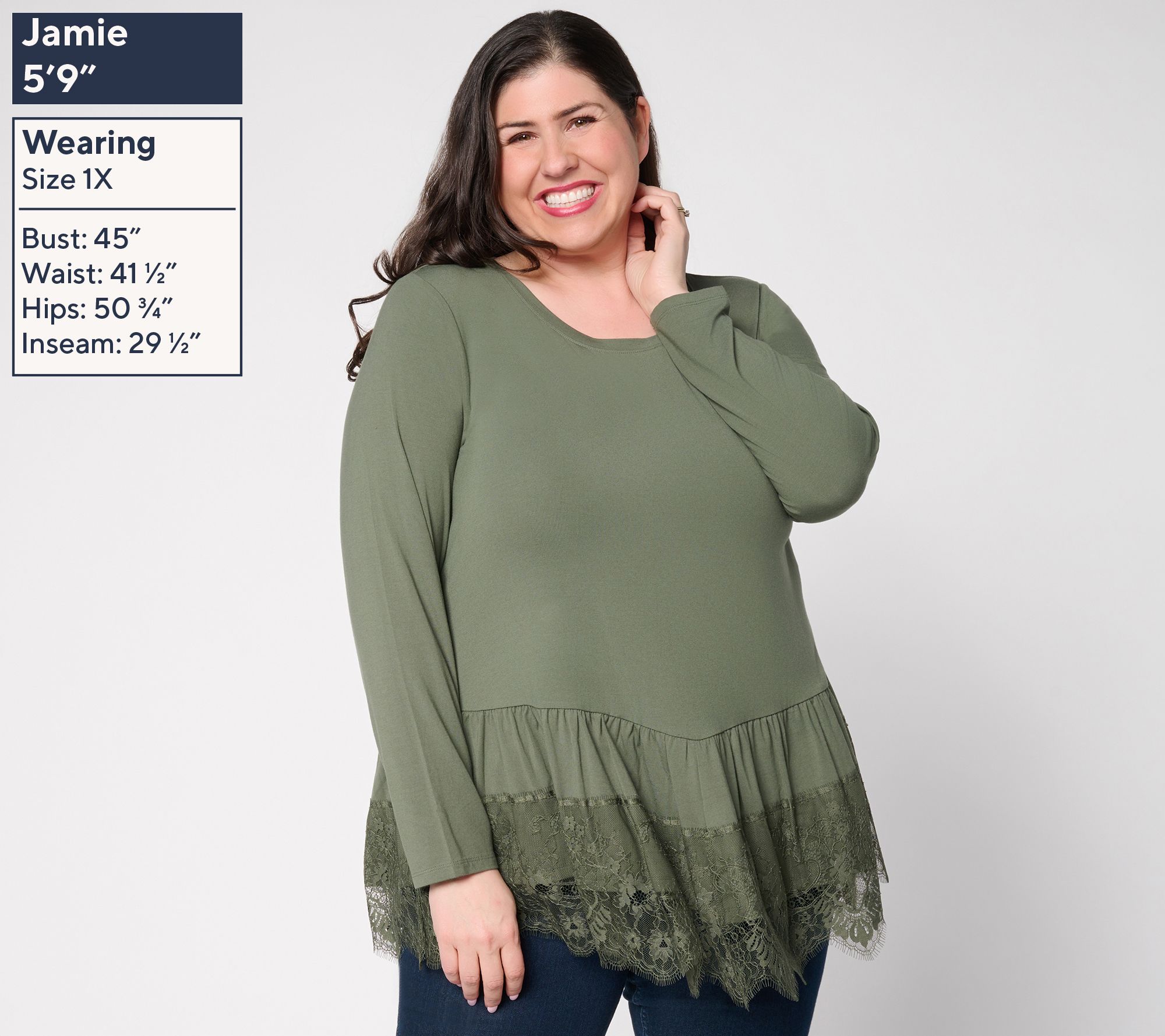 Business at the top. Party at the bottom. This ruffle-hem top -- beautifully detailed in scalloped lace -- layers effortlessly under your favorite jackets and cardis, thanks to smooth, stretch jersey fabrication. We love it for times when a tee isn't fancy enough or your celebration look requires a side of serious comfort. From LOGO by Lori Goldstein®.