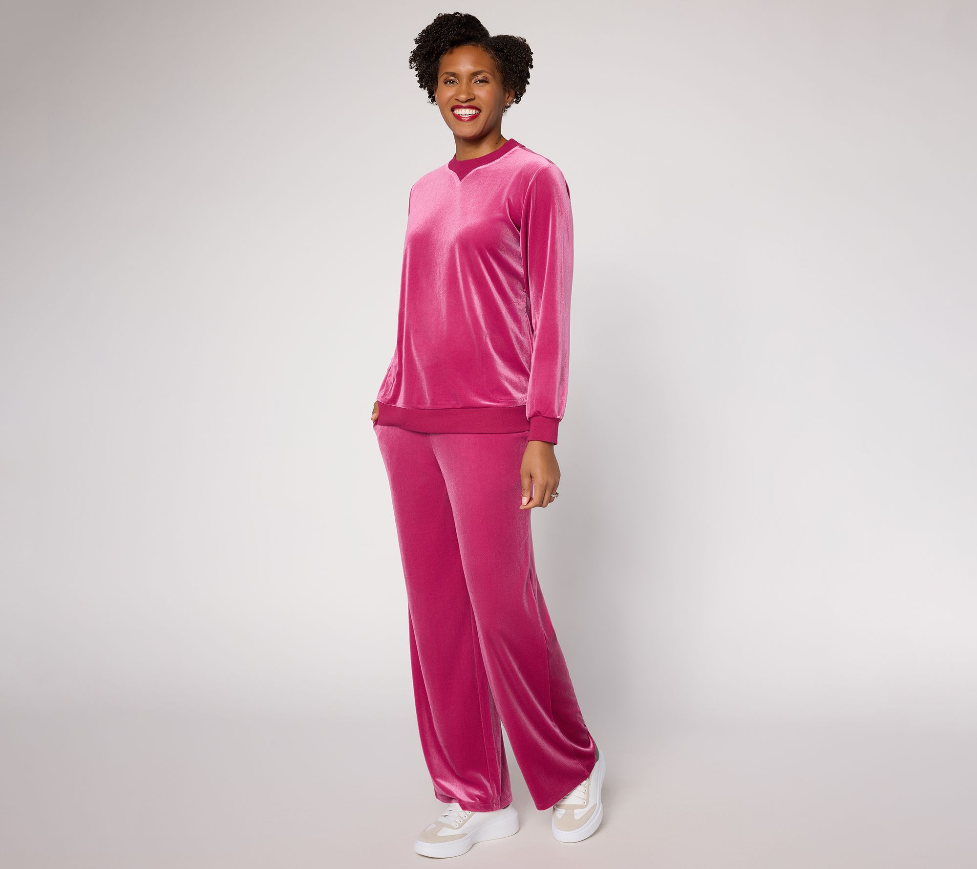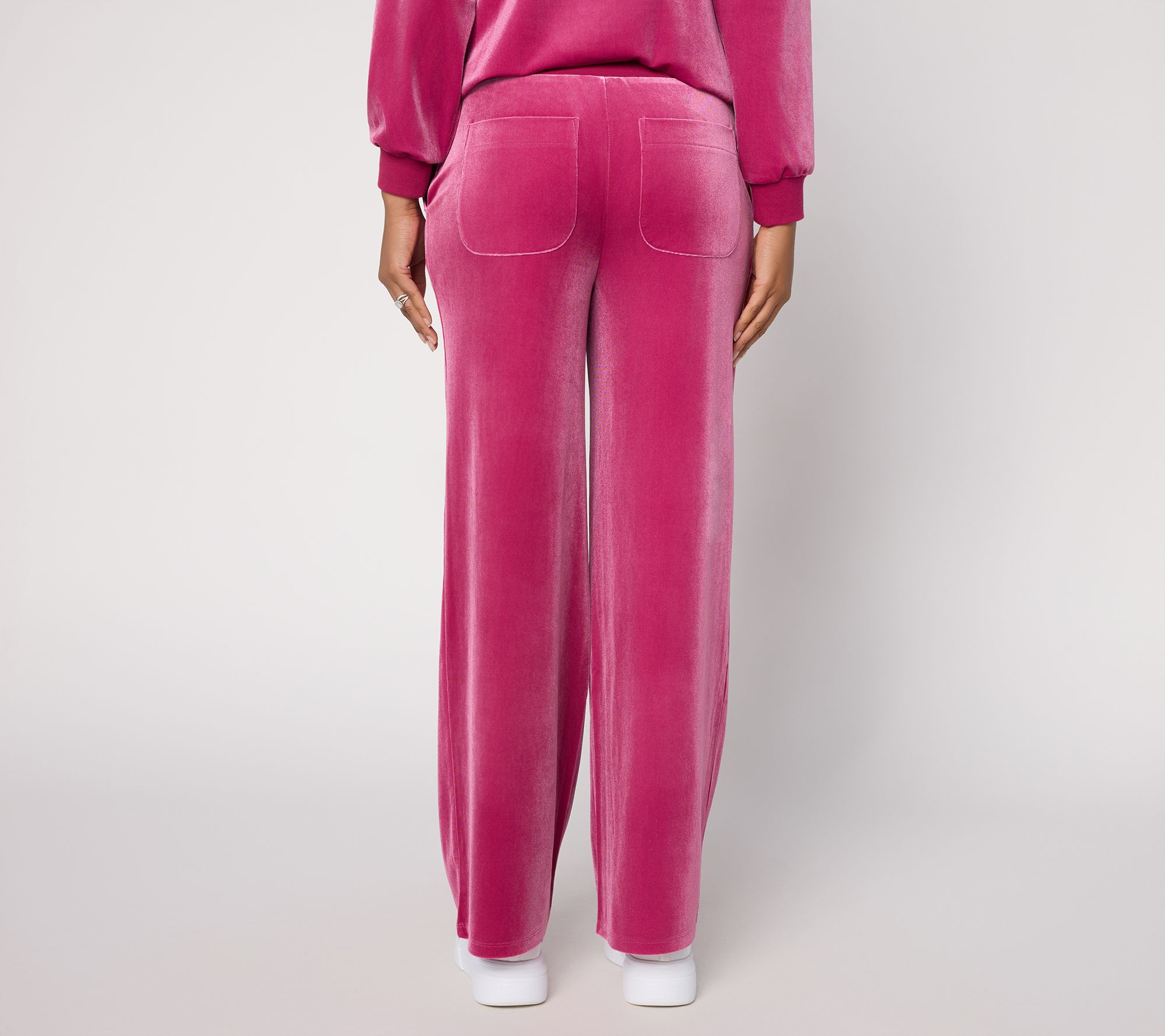 Blazer and silk blouse or hoodie and trainers? Whatever your vibe of the day, these velvet pull-on pants add subtle elegance to any 'fit. Transition from relaxing at home to meeting friends in a wide-leg silhouette that provides easy movement and plenty of pairing options. From LOGO by Lori Goldstein®.