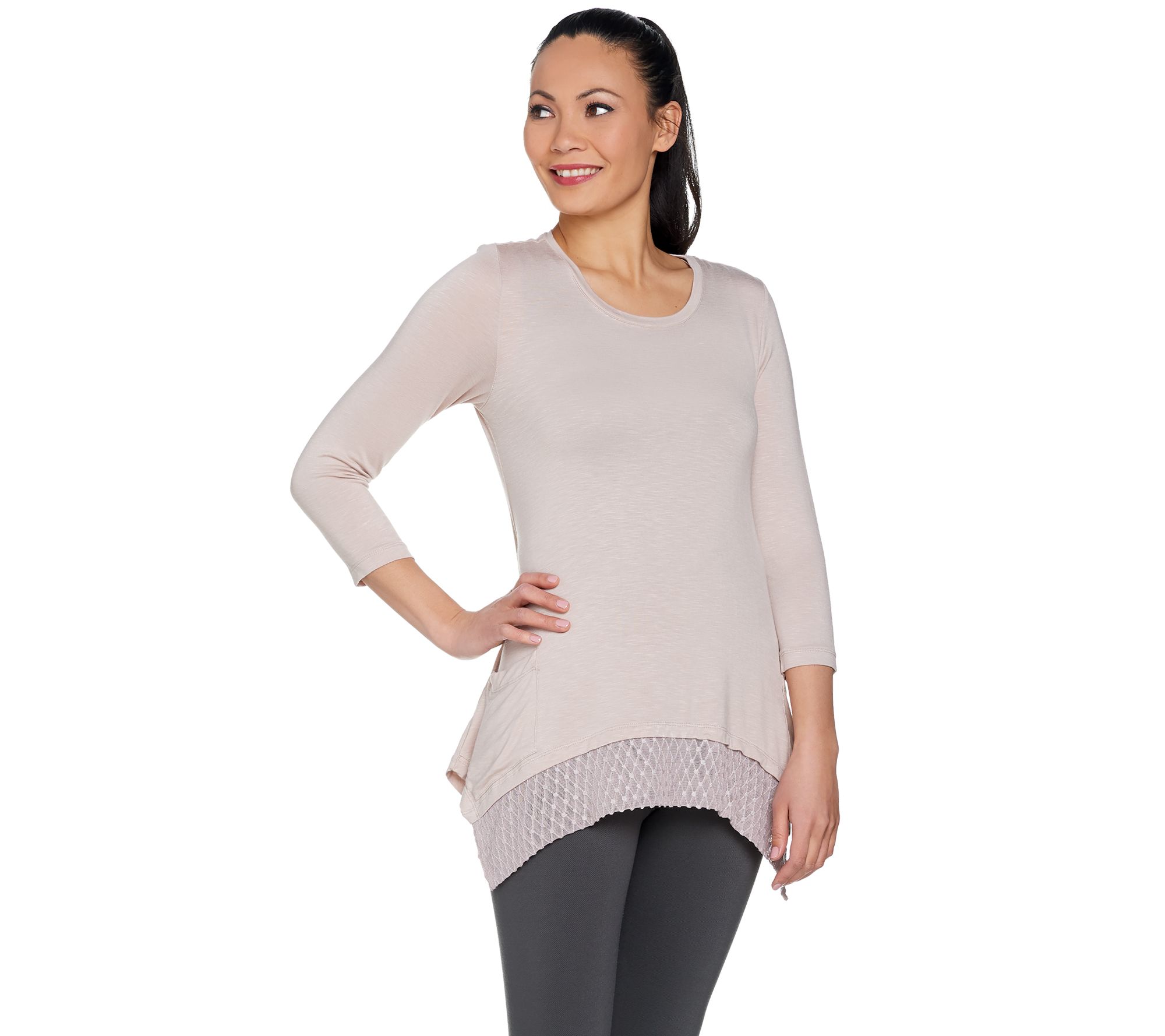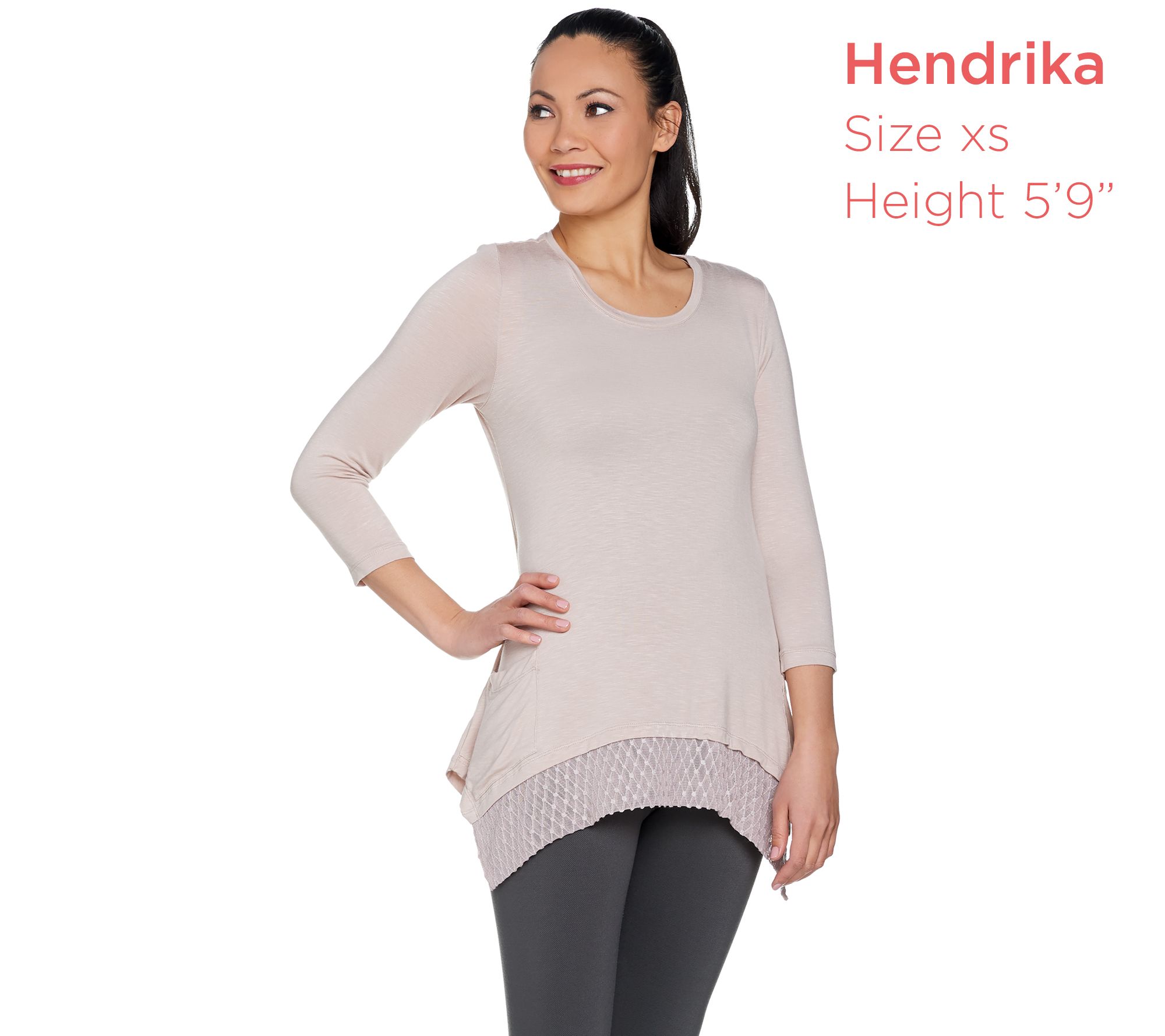 • Features: scoop neckline, 3/4-length sleeves, two front pockets, front and back embroidered angled hem
