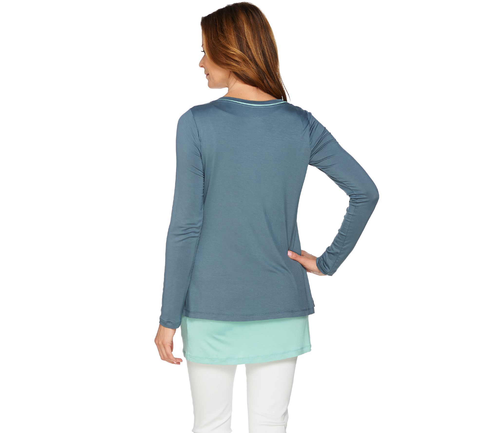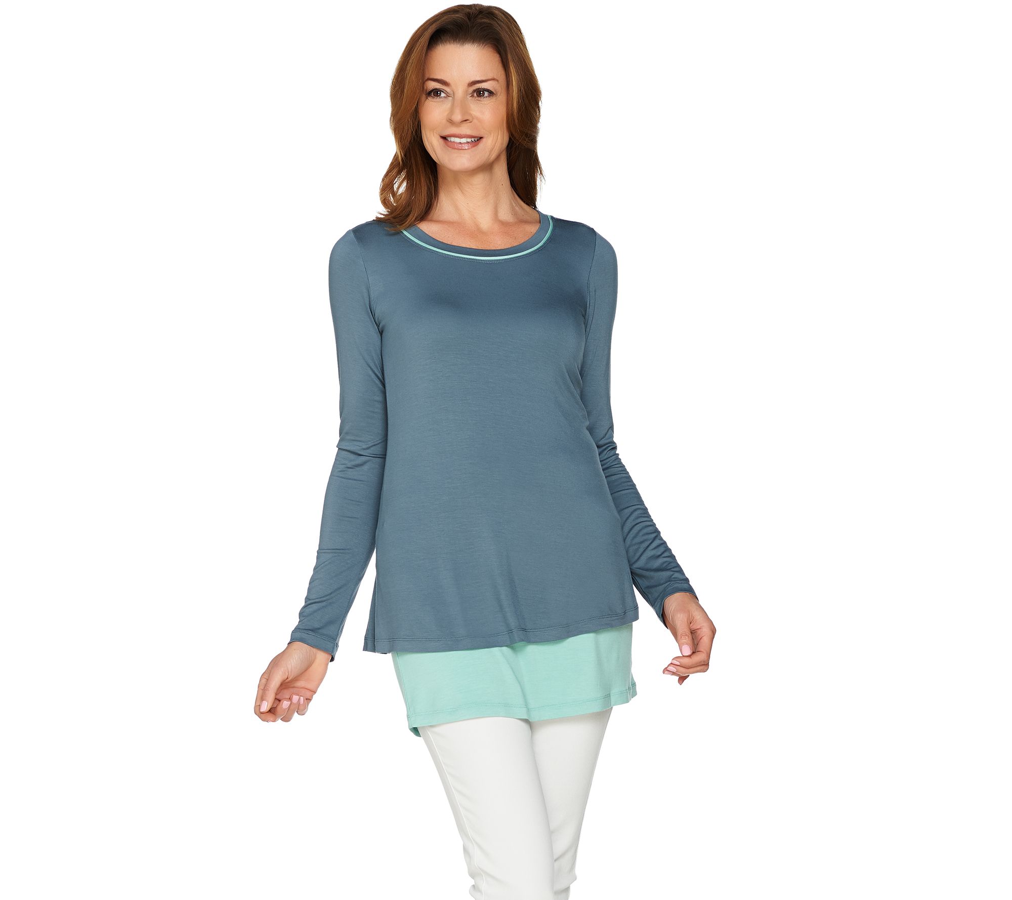 Twice as nice, this LOGO twin set is full of surprises. The scoop neck's decorated with contrast binding that coordinates with the attached contrast color tank visible beneath the bottom hem. It lets you layer up without bulk. From LOGO by Lori Goldstein(R).