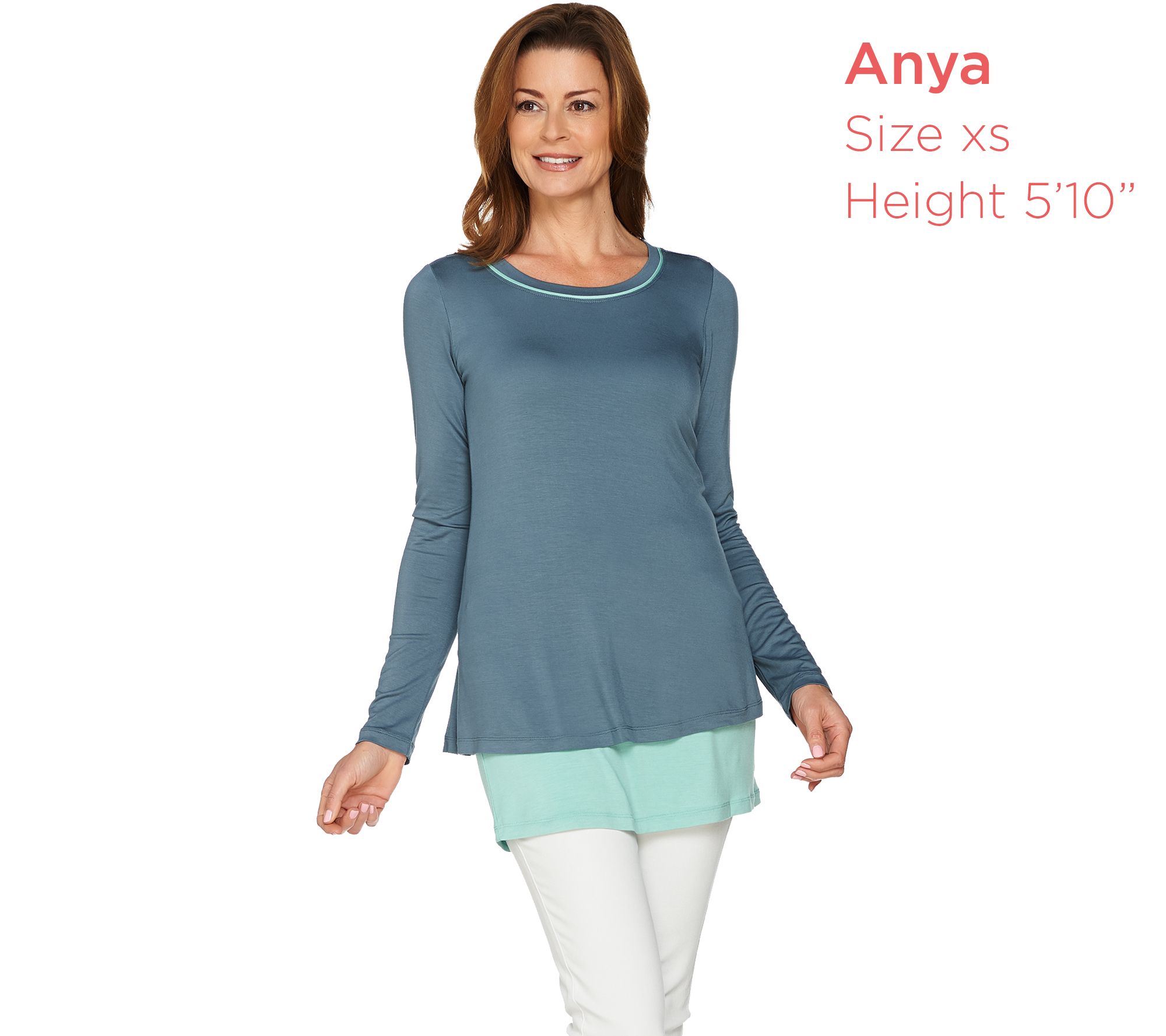 Top Features: scoop neck with contrast binding, long sleeves, straight bottom hem