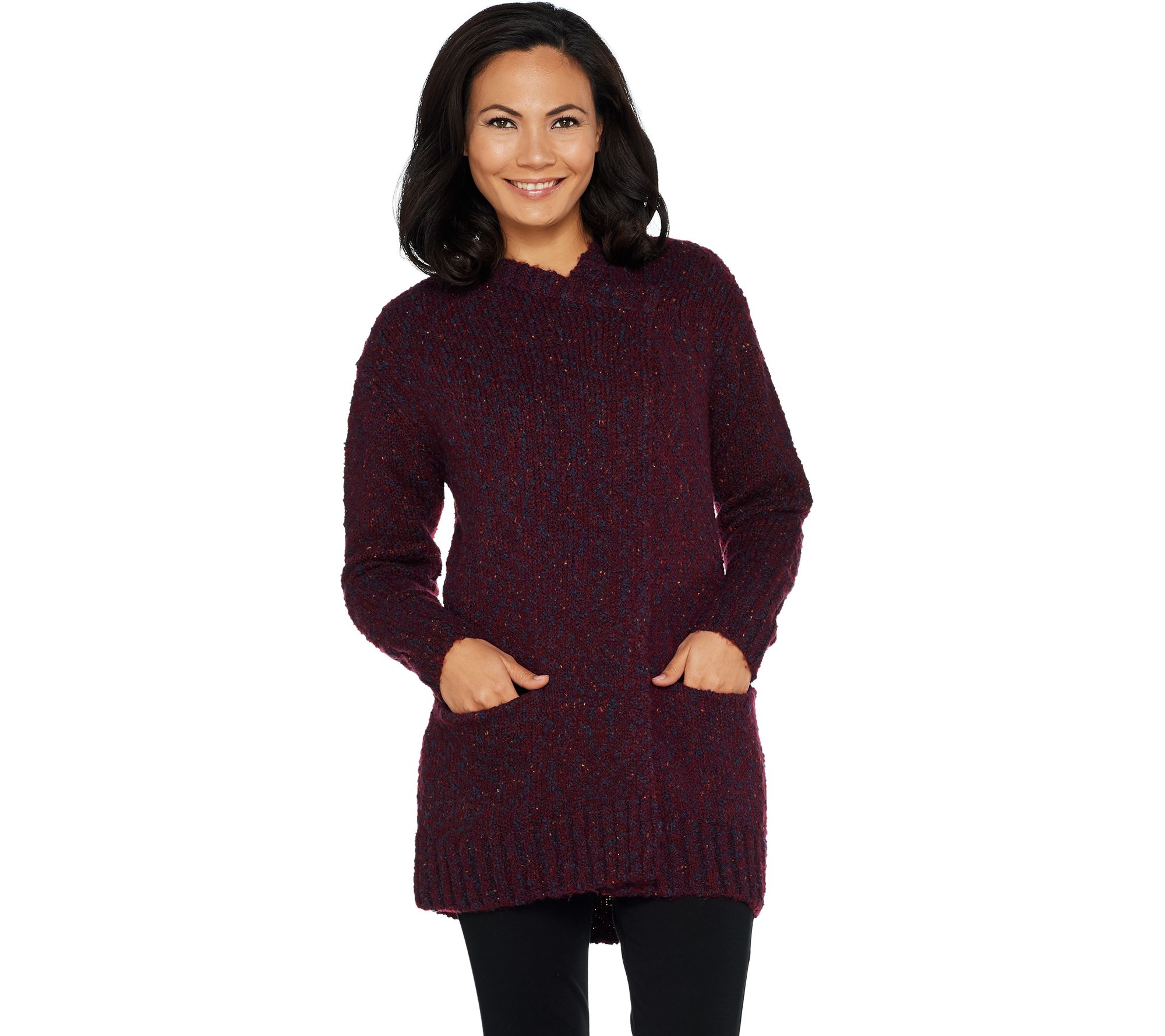 Heed the call of the crackling fire or evening outdoors wrapped up in this crossover sweater jacket with patch pockets for your essentials. From LOGO by Lori Goldstein.