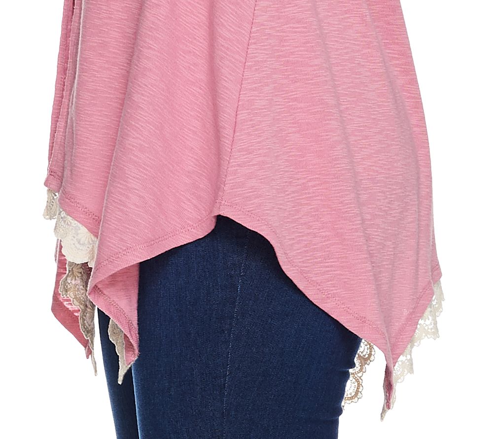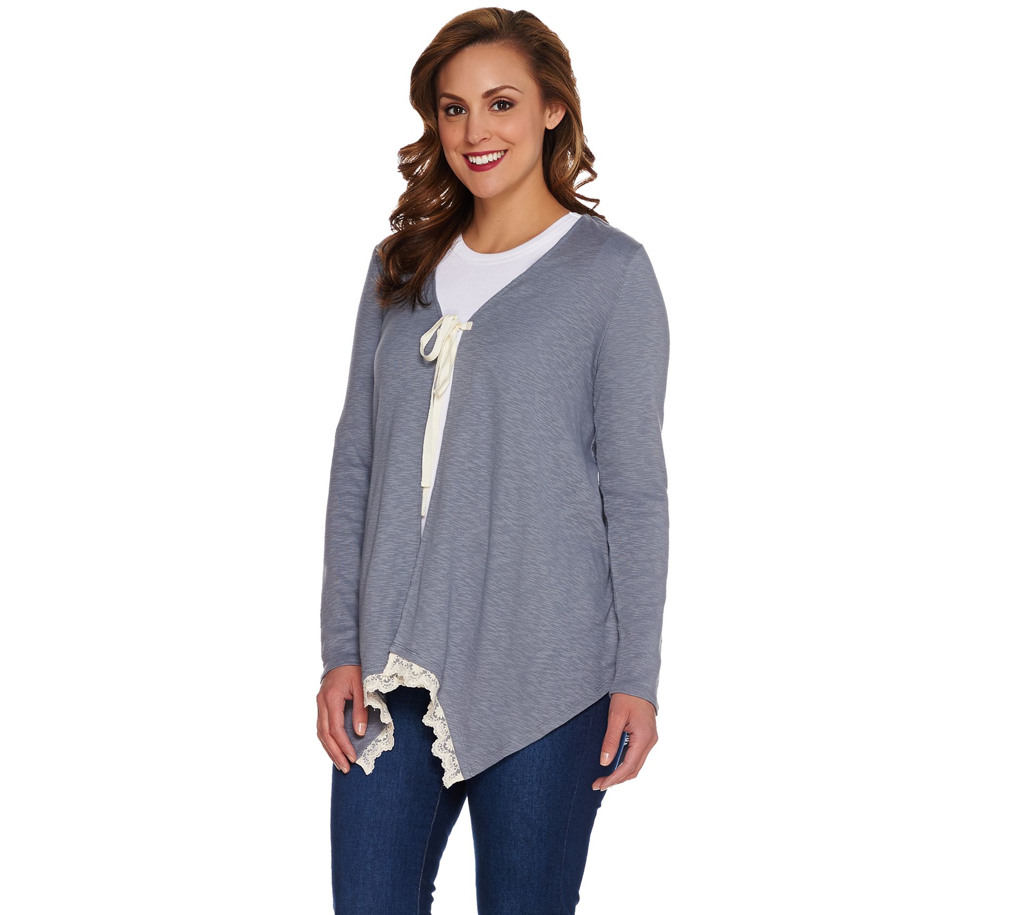 Craft your perfect look in this LOGO knit cardigan--elegantly adorned with a front tie closure and crochet details along the asymmetric hem. From LOGO by Lori Goldstein(R).