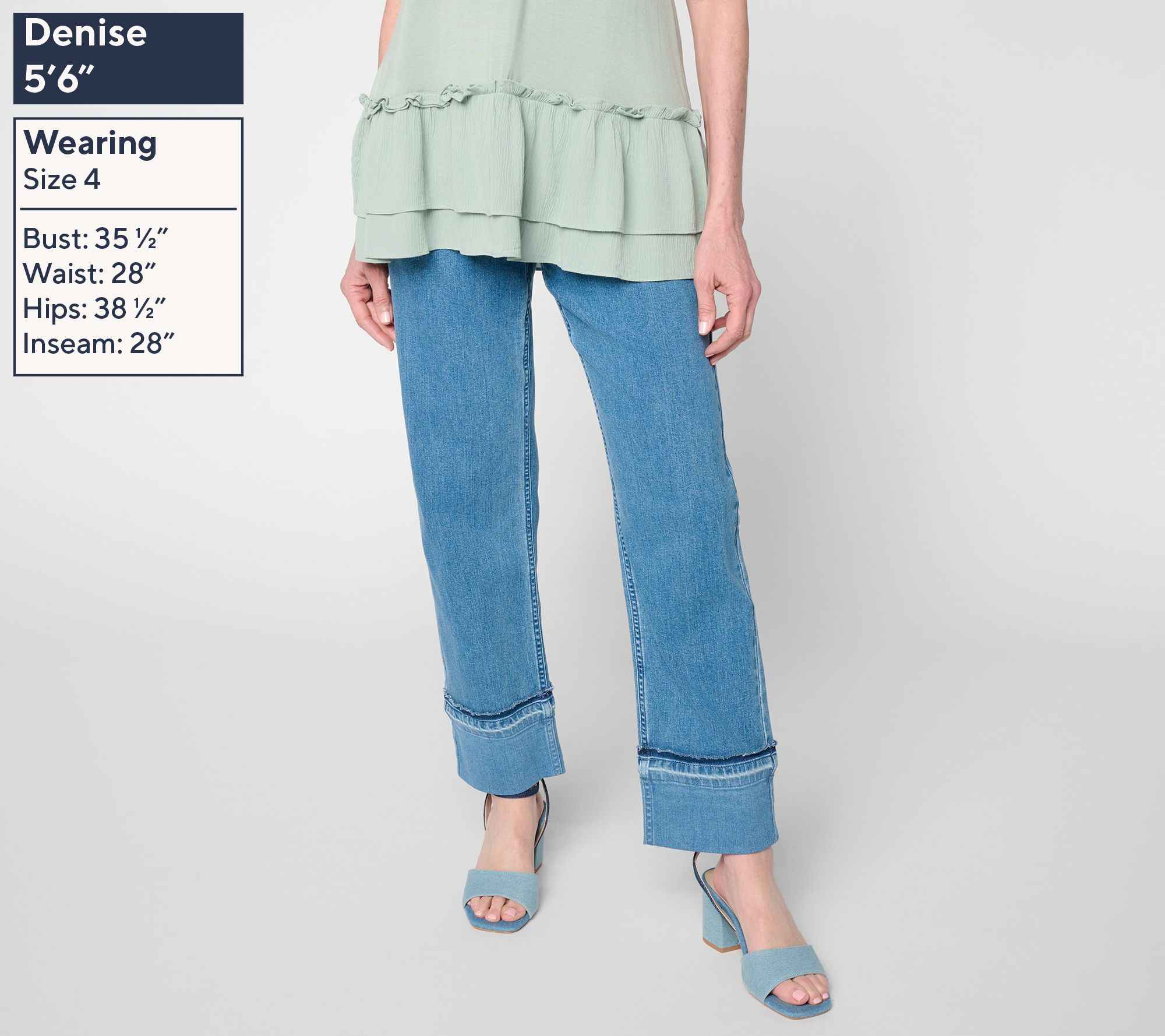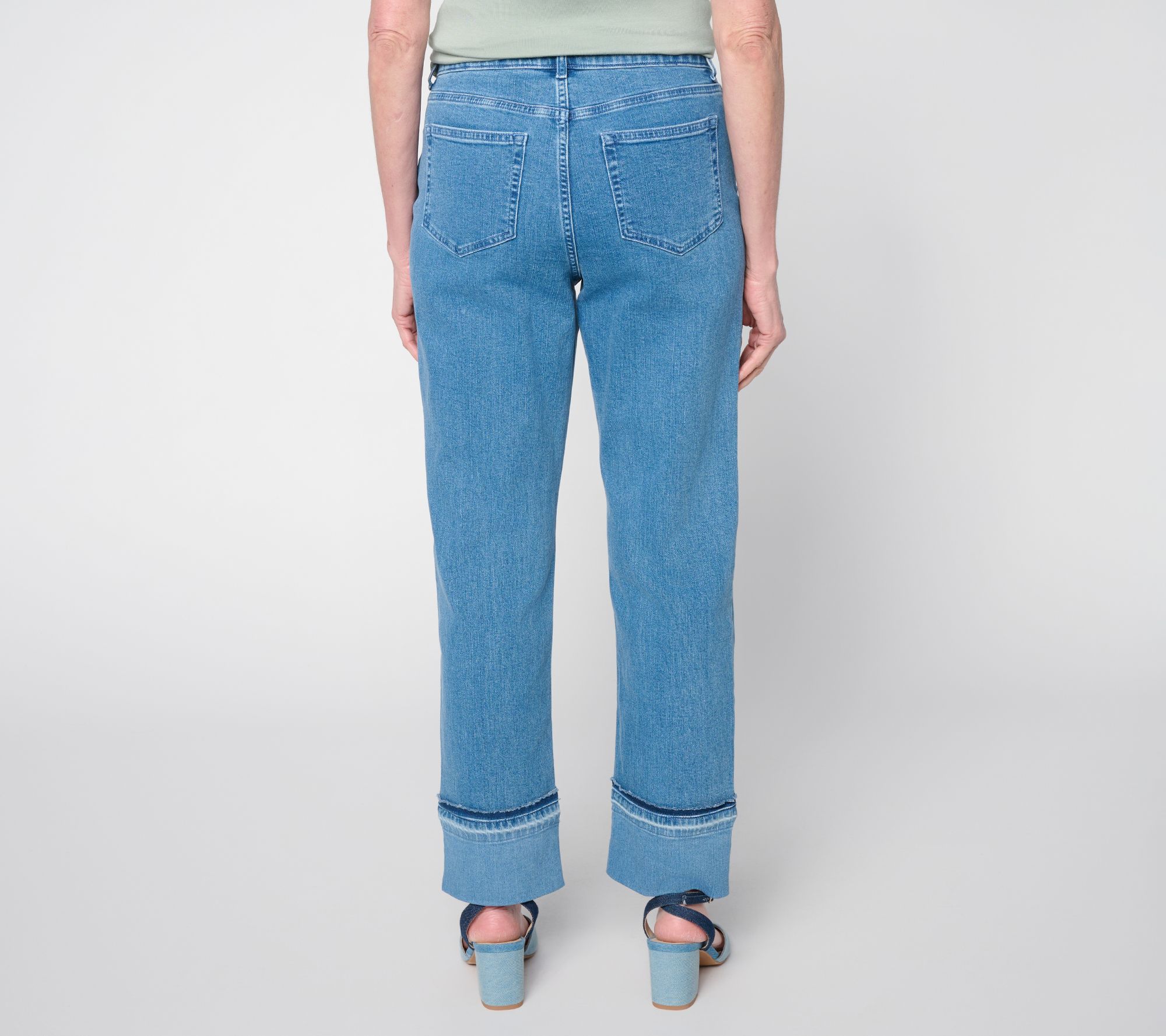 Stretch your style options with these straight-leg jeans, designed to carry you from casual afternoons to spontaneous get-togethers. Distinctive release hems and seamed details offer standout energy, while functional pockets and a branded button combine everyday utility with a fresh edge. From LOGO by Lori Goldstein®.