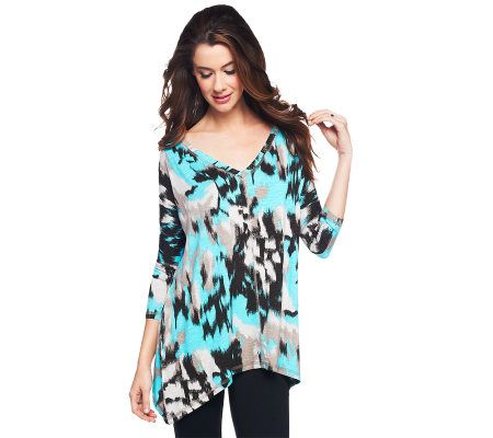 You're unique--like a work of art. Your wardrobe should reflect your distinctive personality, and this knit top does just that. The front and back V-neckline is complemented by a drop shoulder and longer side seams. An abstract print completes the masterpiece. From LOGO by Lori Goldstein.