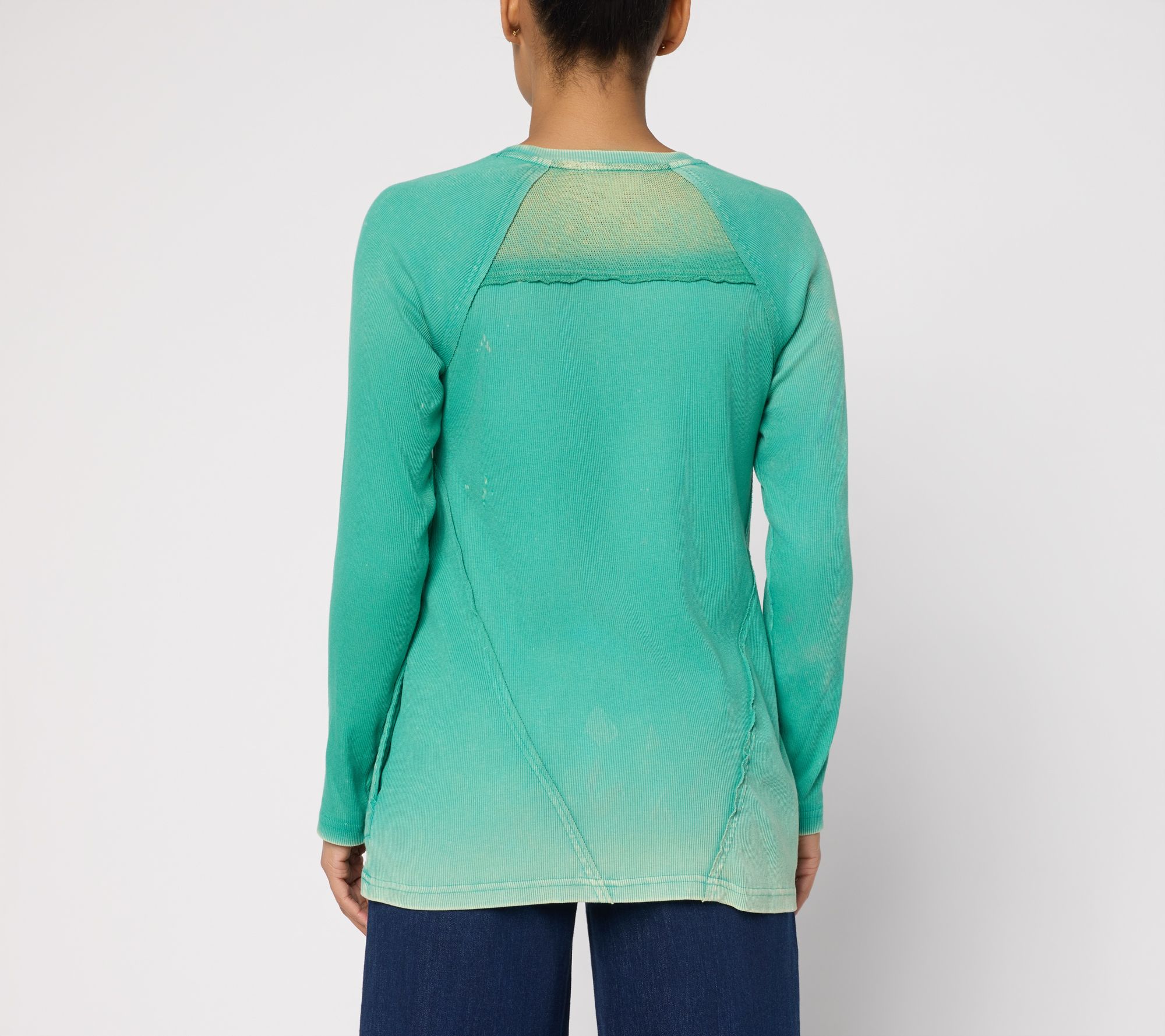 Features: long raglan sleeves, cut-and-sew seam detail, mesh at front and back, high-low hem