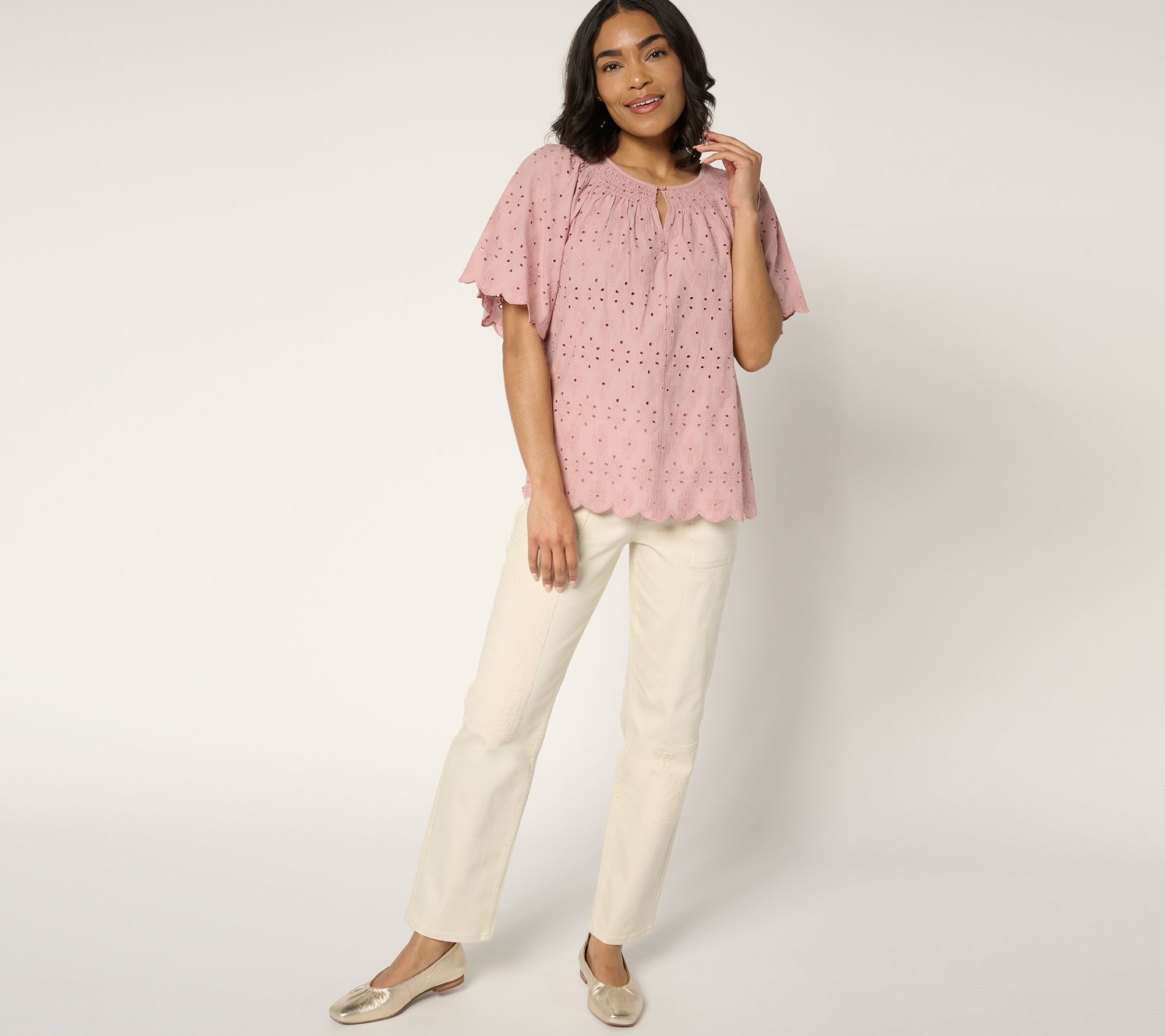 How sweet it is... to spend a family celebration or evening with friends in this charming eyelet top! The 100% cotton design's knitted back provides flexibility and comfort as you mix and mingle. From LOGO by Lori Goldstein®.