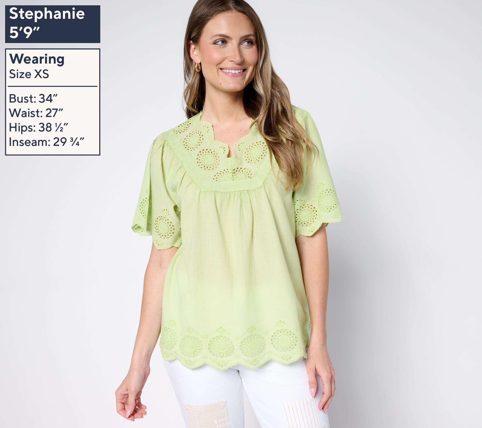 Perfect for a leisurely brunch or an afternoon garden party, this charming eyelet top pairs beautifully with your favorite jeans or a flowy skirt. From LOGO by Lori Goldstein®.