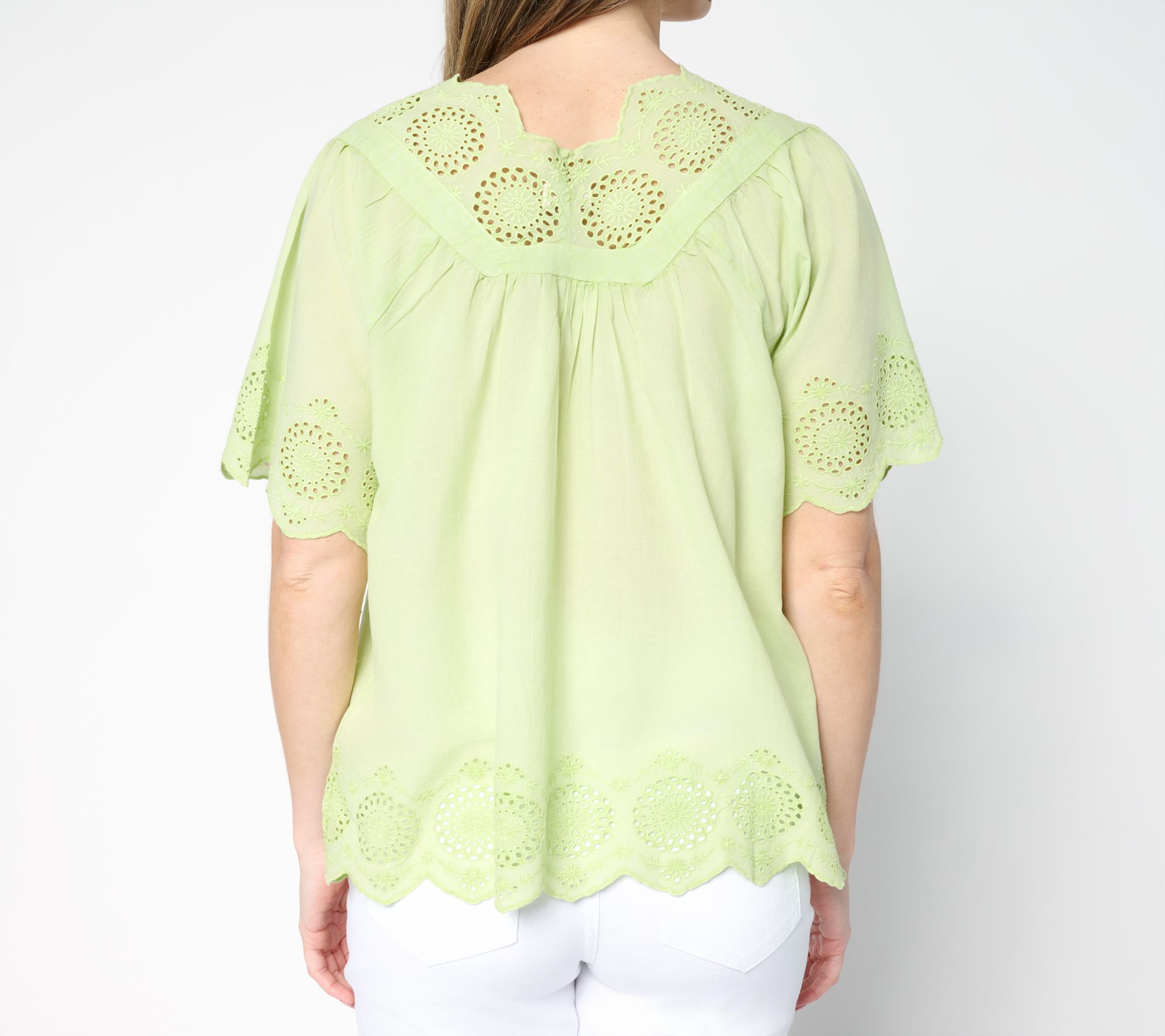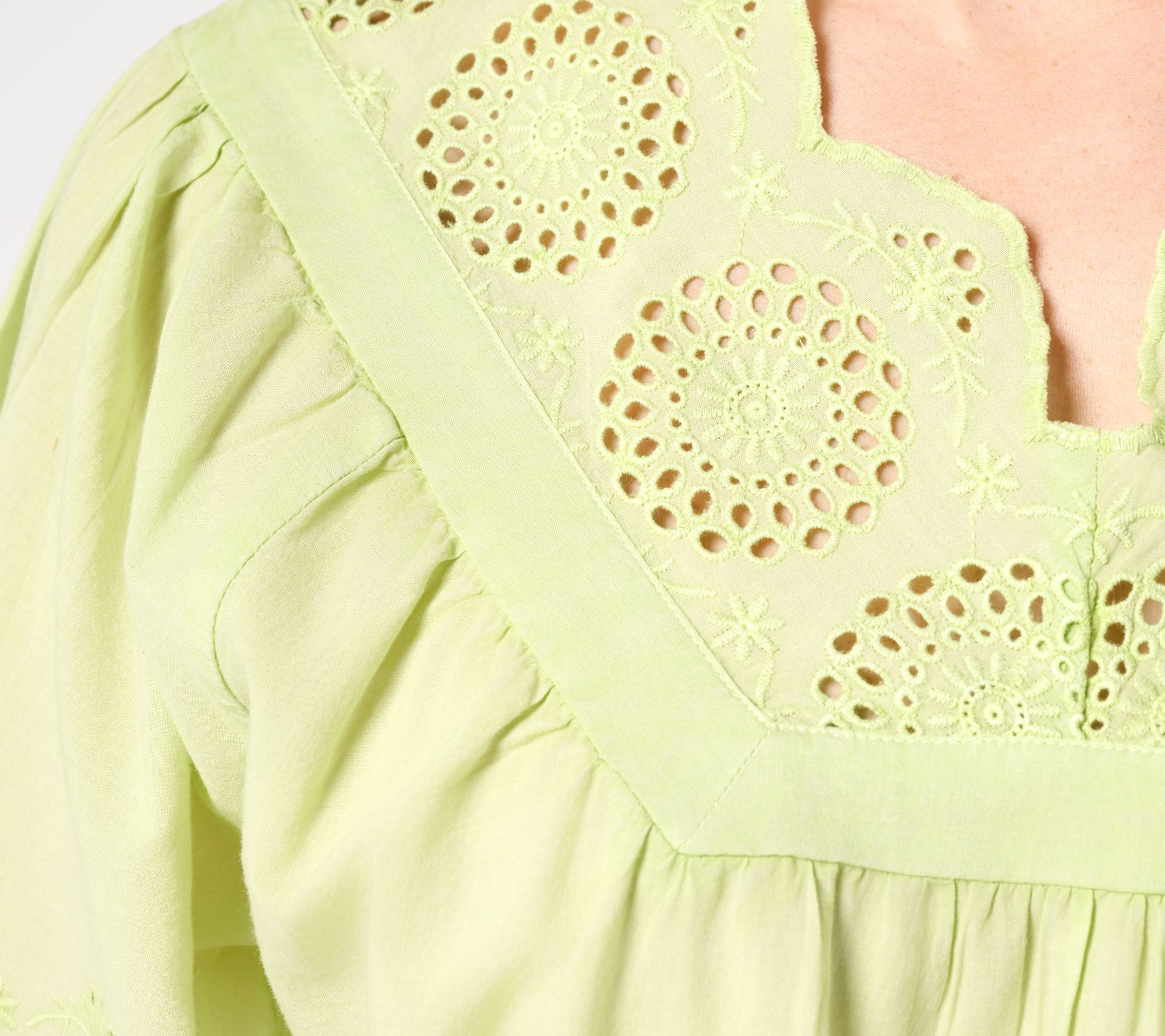 Features: eyelet details; voluminous half-length sleeves; raglan armholes; shirred front bib; scalloped V-neckline, sleeve, and bottom hem