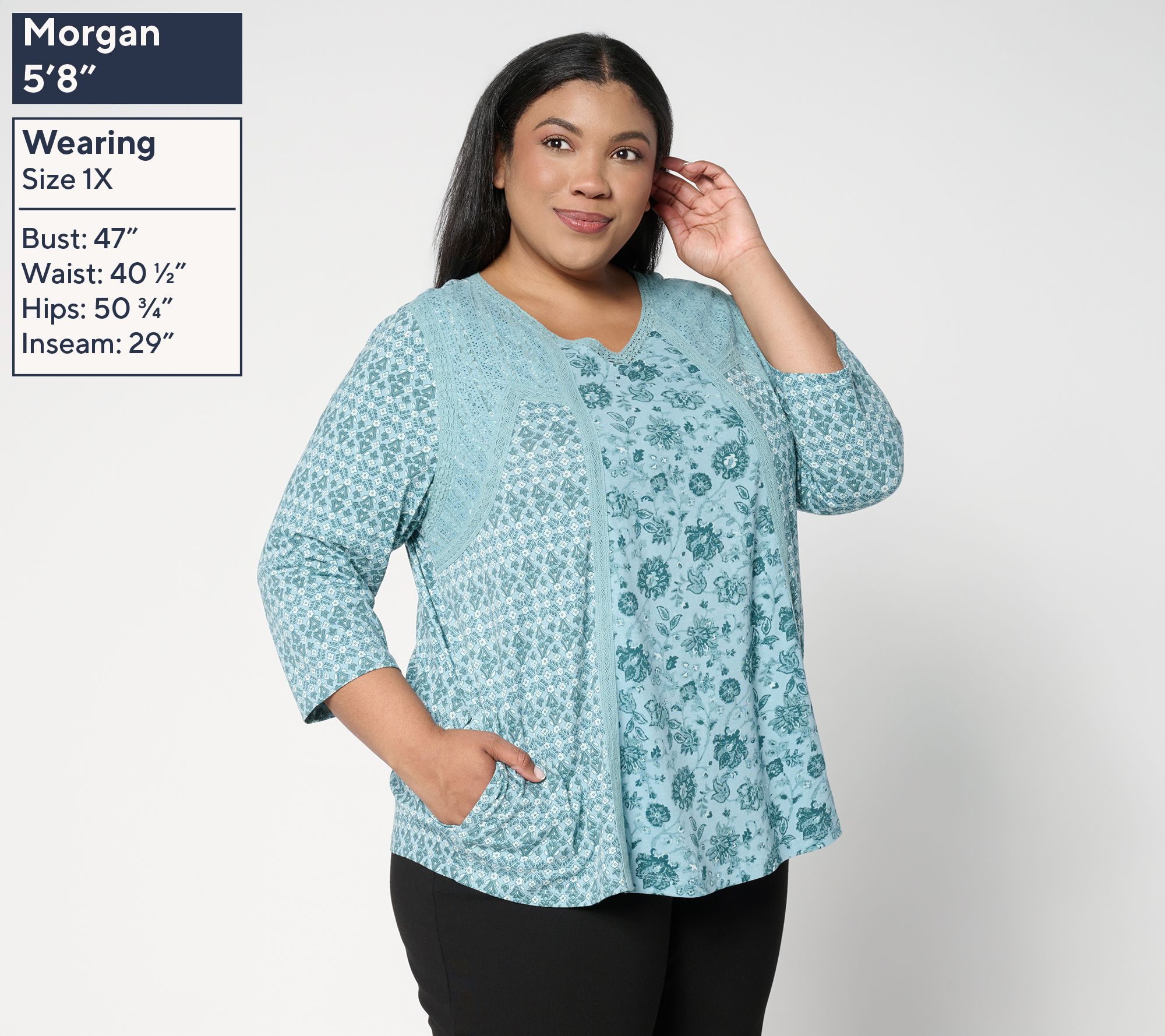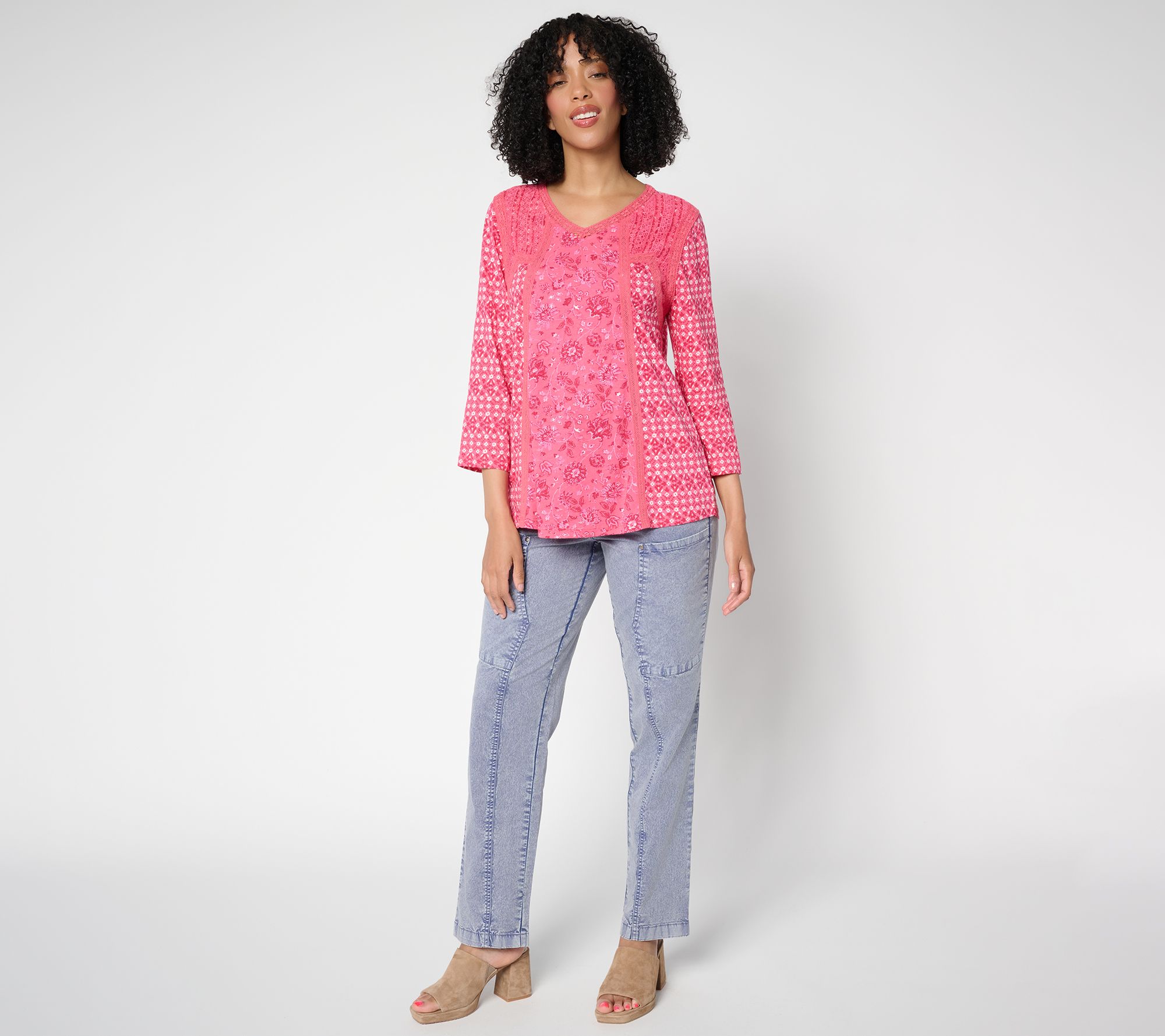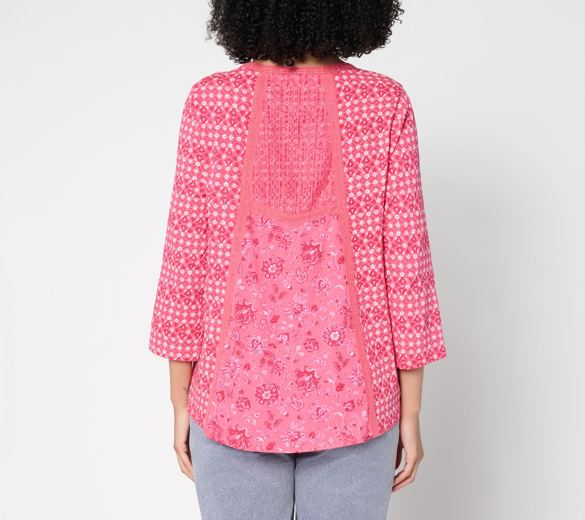Mix up your look with this printed pieced top from LOGO, designed for all-day comfort and standout style. The cotton body teams up with mesh and lace touches, while 3/4-length sleeves make it easy to wear on its own or layered under your favorite jacket. From LOGO Lavish by Lori Goldstein®.