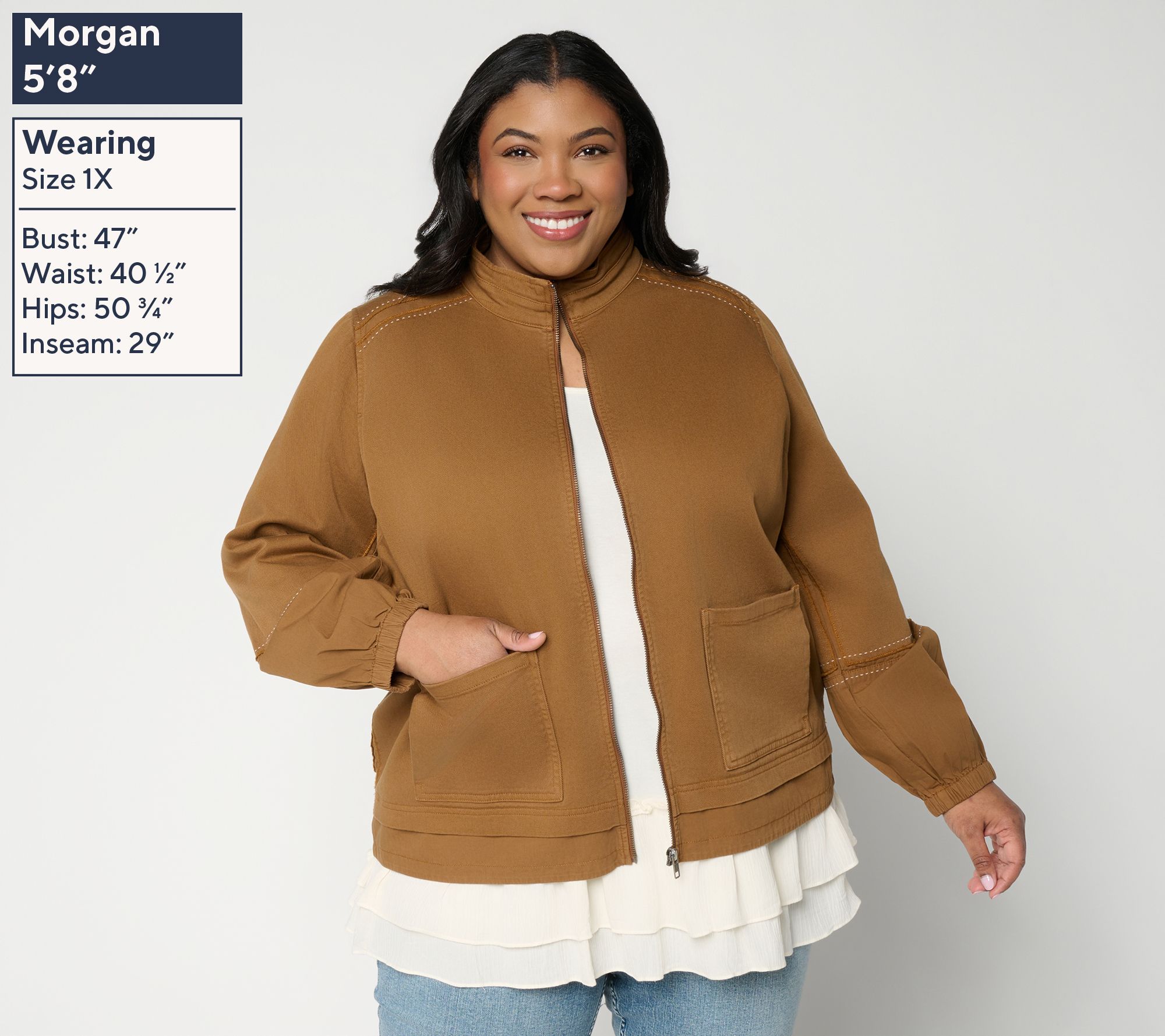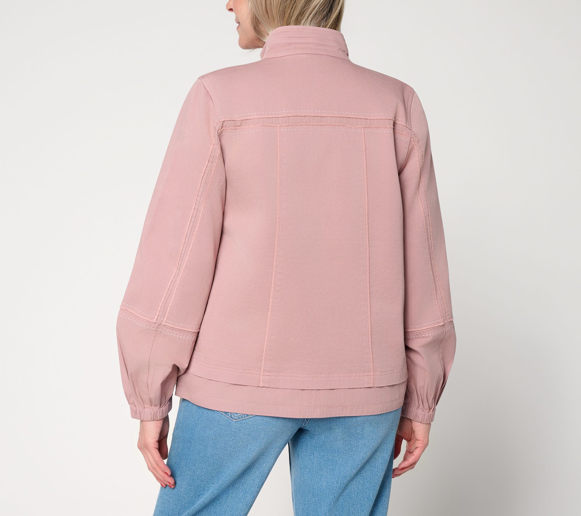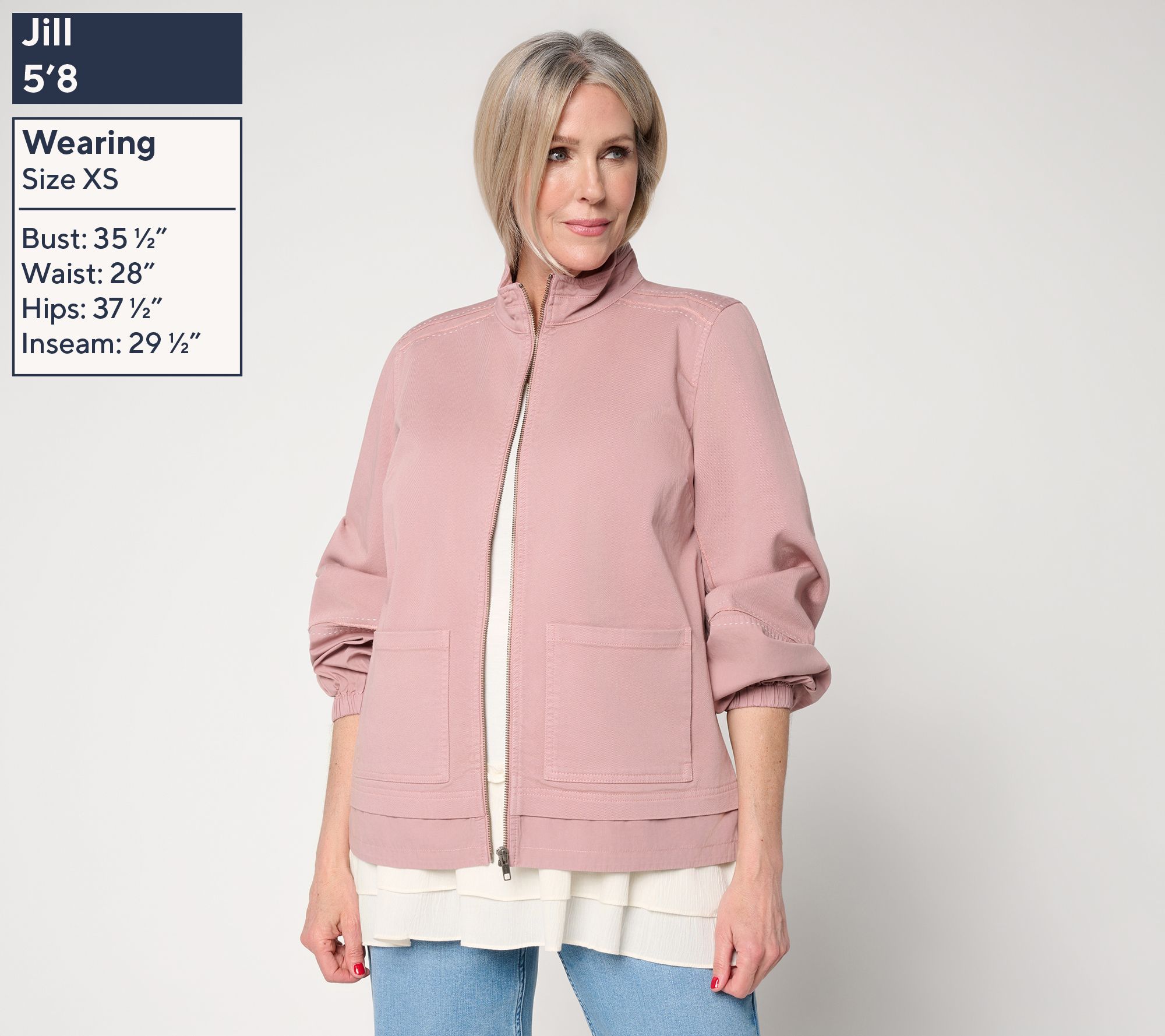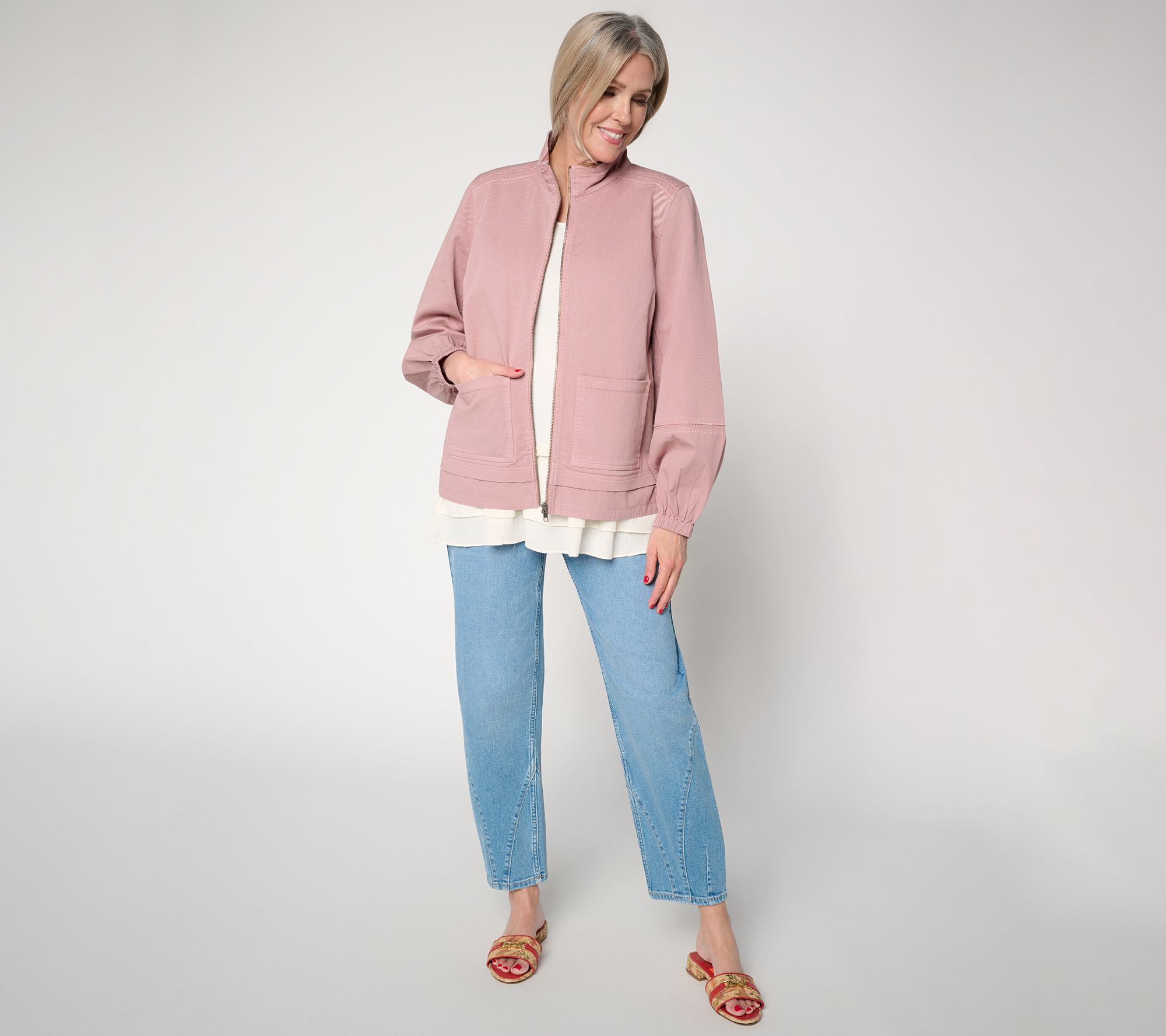 This mixed-media zip-front jacket is an effortless layer for adding a modern twist to your outfit while you meet the day's demands. Thoughtful seam details, a comfortable semi-fitted shape, and handy front pockets mean style and function are woven into every wear. From LOGO Lavish by Lori Goldstein®.