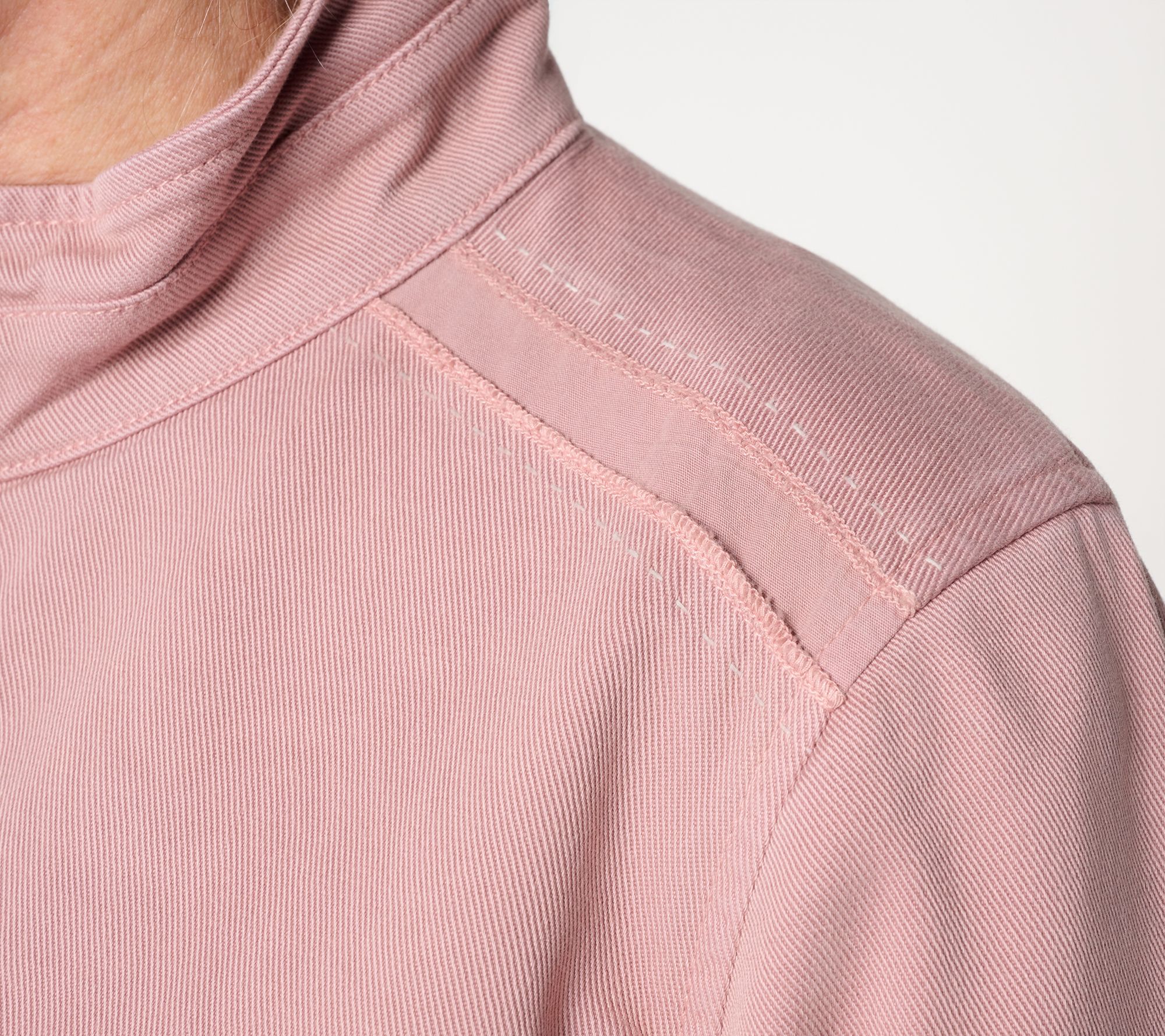 • Features: long sleeves, set-in armhole, self collar, front pockets, mix media seam
