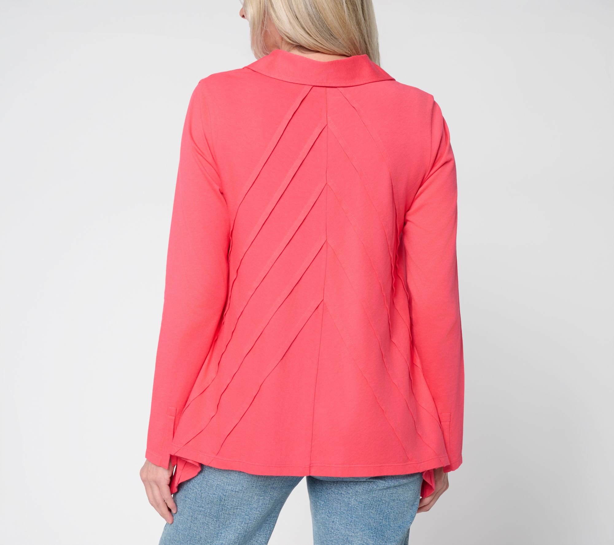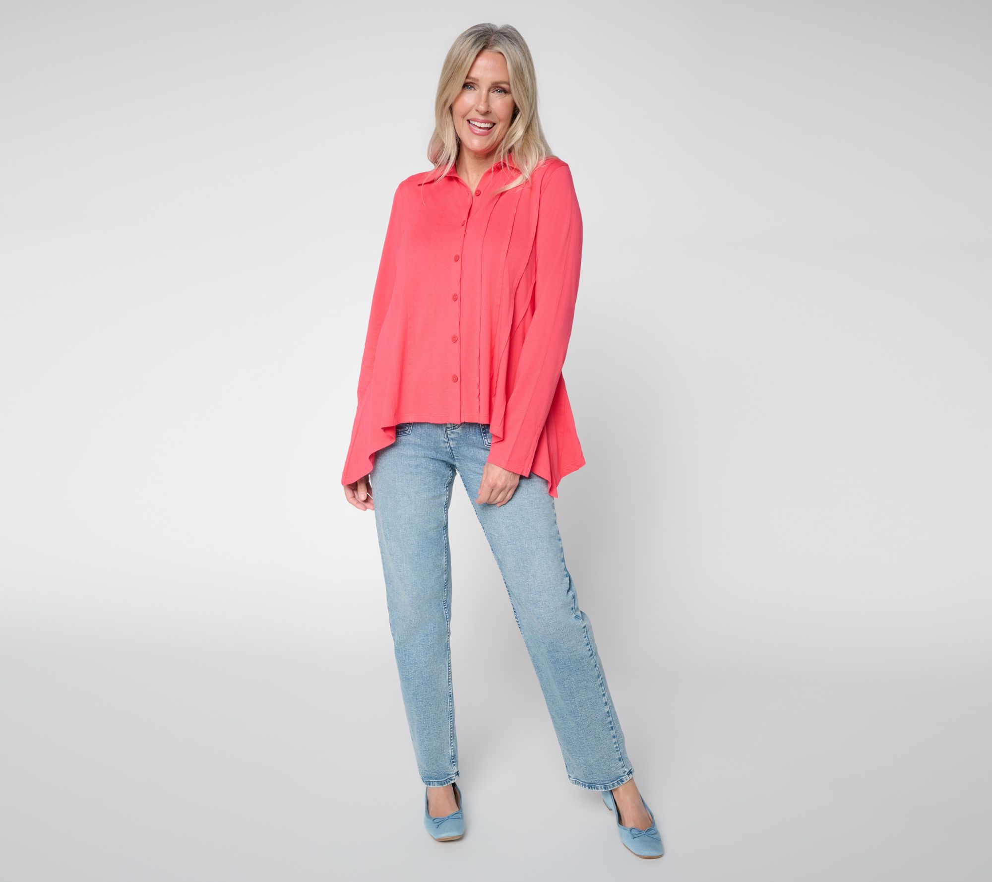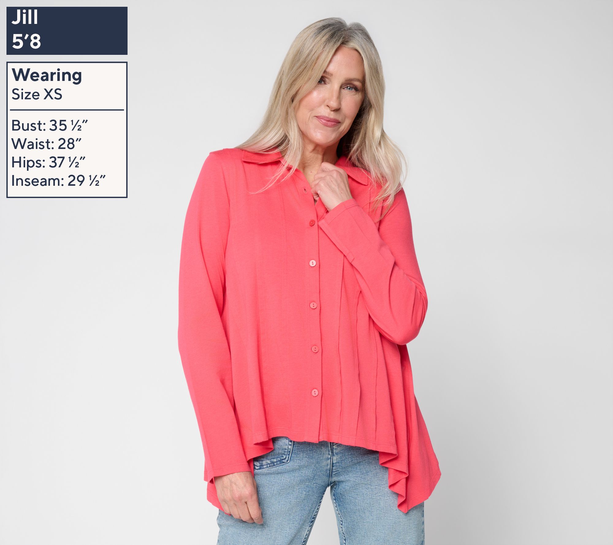 Shake up your weekday wardrobe with this long-sleeve shirt, styled in soft knit with eye-catching pintuck details and a shark-bite hem that pairs beautifully with jeans or slim pants. Designed with a smart collar and button placket, it transitions effortlessly from a creative workspace to relaxed evenings out. From LOGO Lavish by Lori Goldstein®.