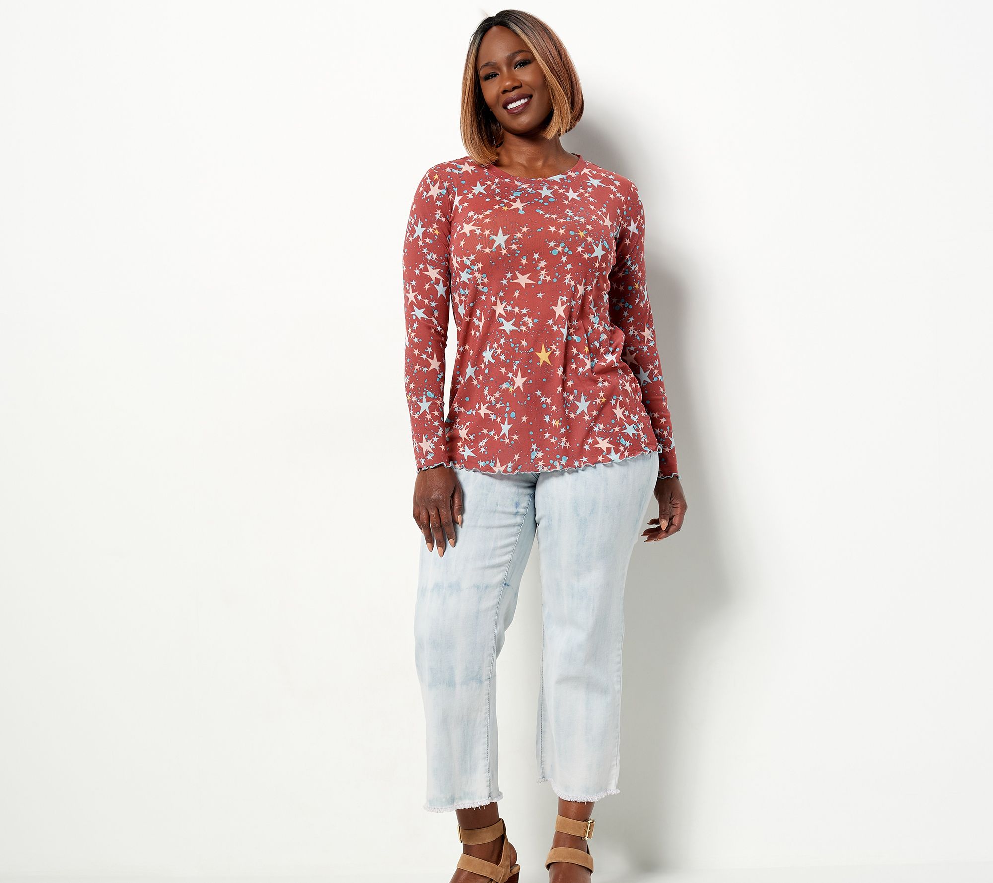 The sheer mesh. Cozy feel. Classic crew neckline. And, of course, the celestial print. But to make it really shine like the night sky? It needs you, of course! Pair it with faded denim and chunky-soled shoes for out-of-this-world style. From LOGO by Lori Goldstein®.