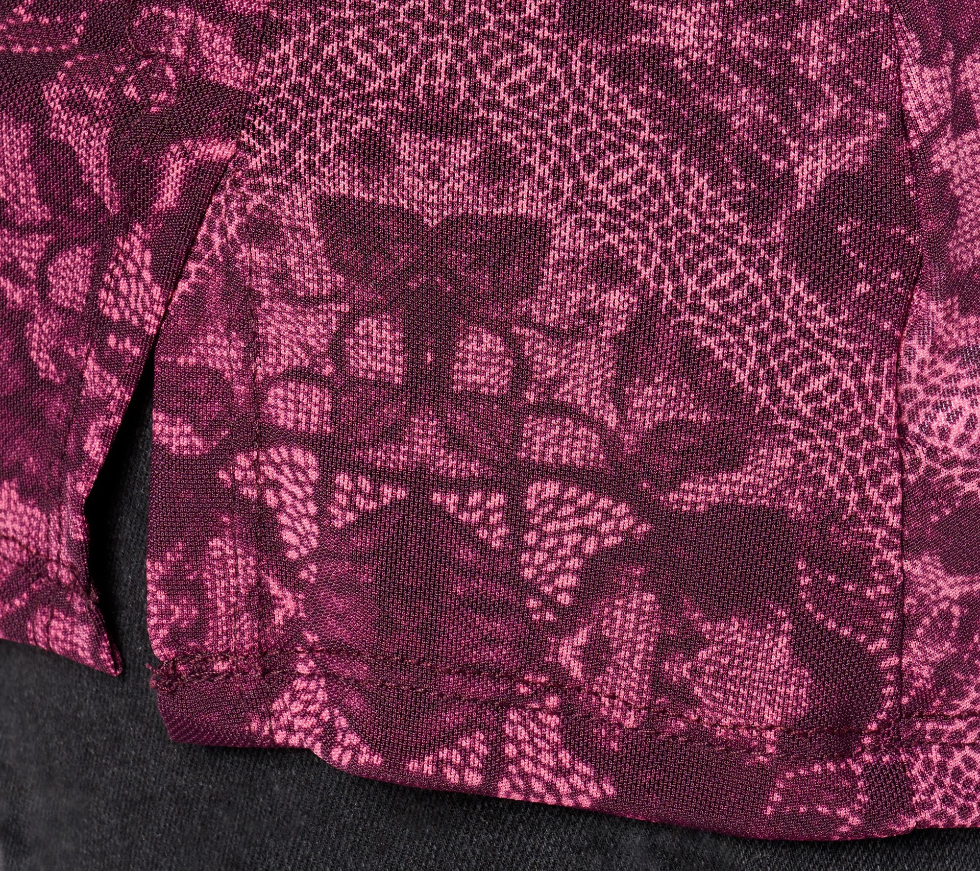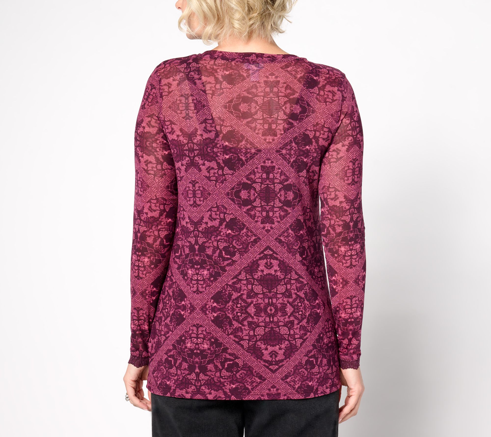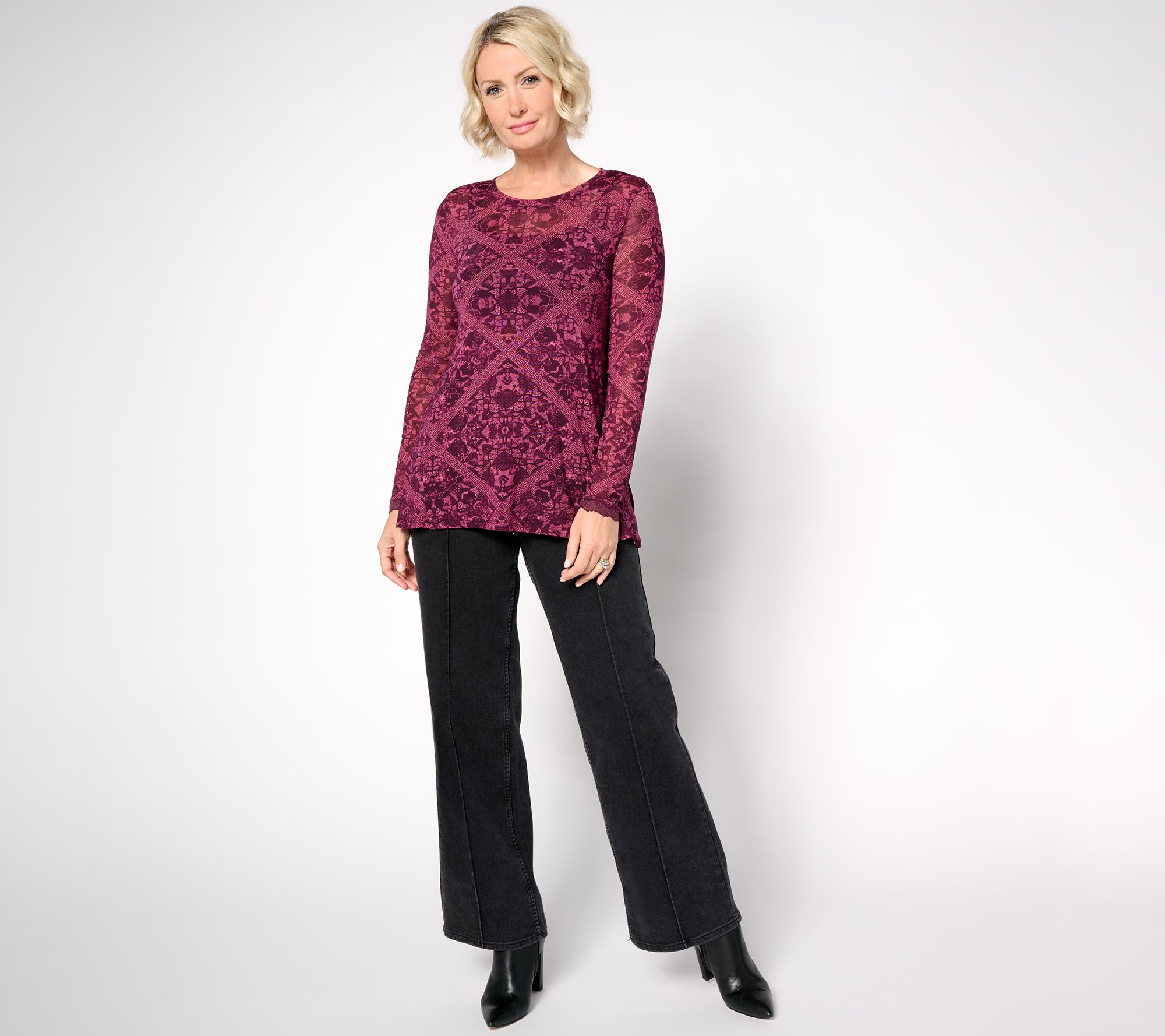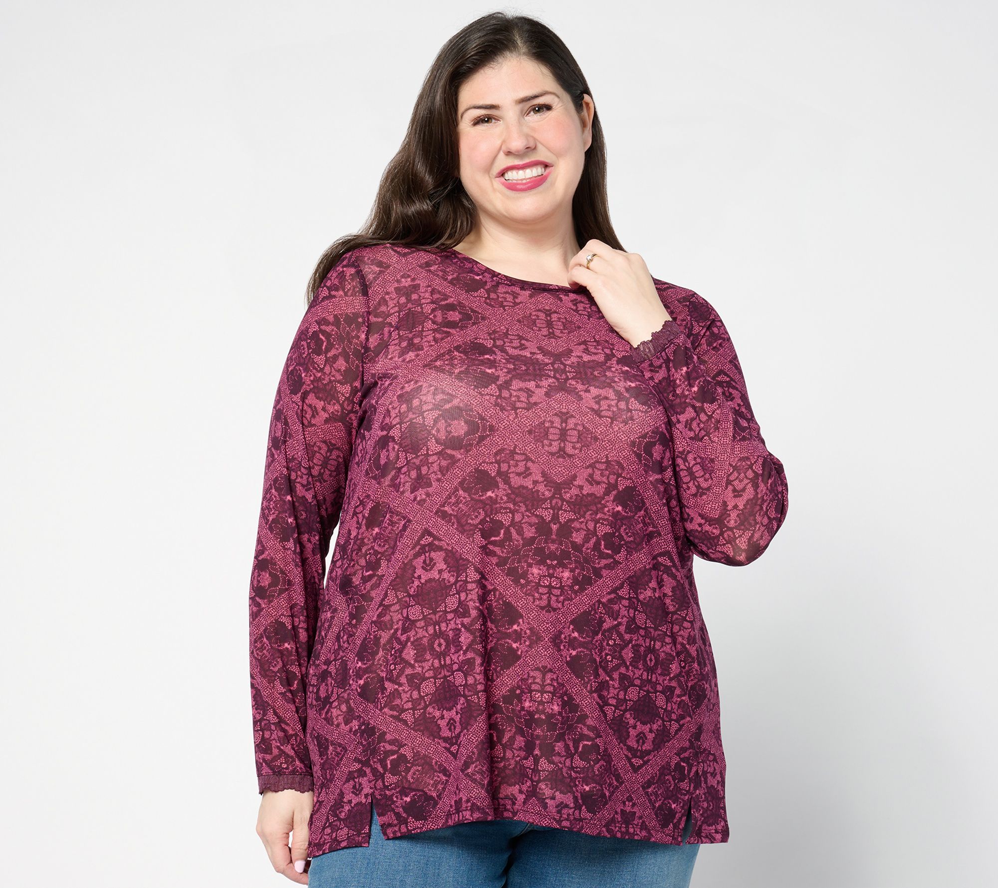 Layer your look effortlessly with the LOGO Layers by Lori Goldstein crew neck printed mesh top. This semi-fitted top boast long sleeves, a printed design, front angled seams, and cut-away slits at the bottom front, making it a stylish staple in any wardrobe. From LOGO Layers by Lori Goldstein.