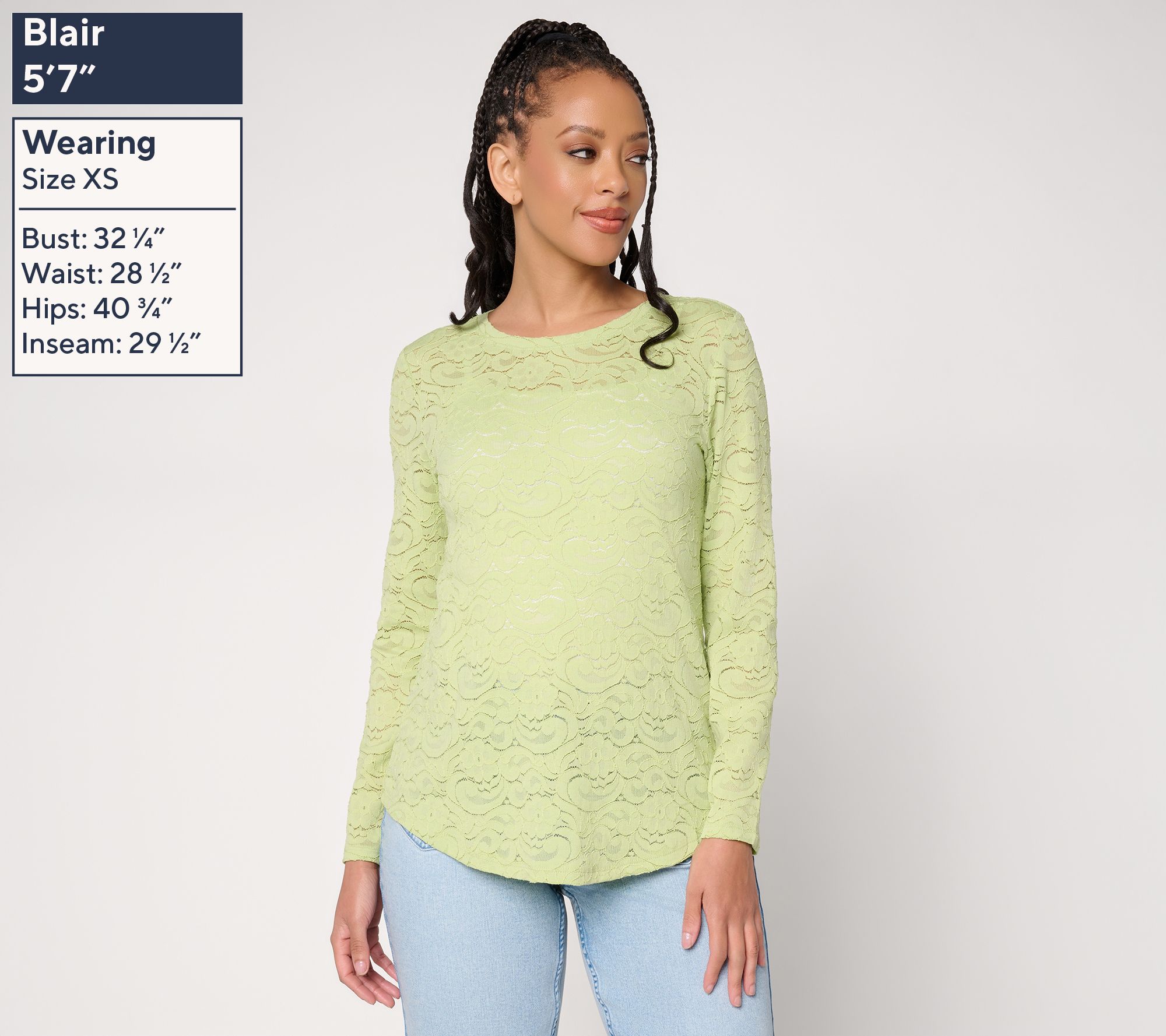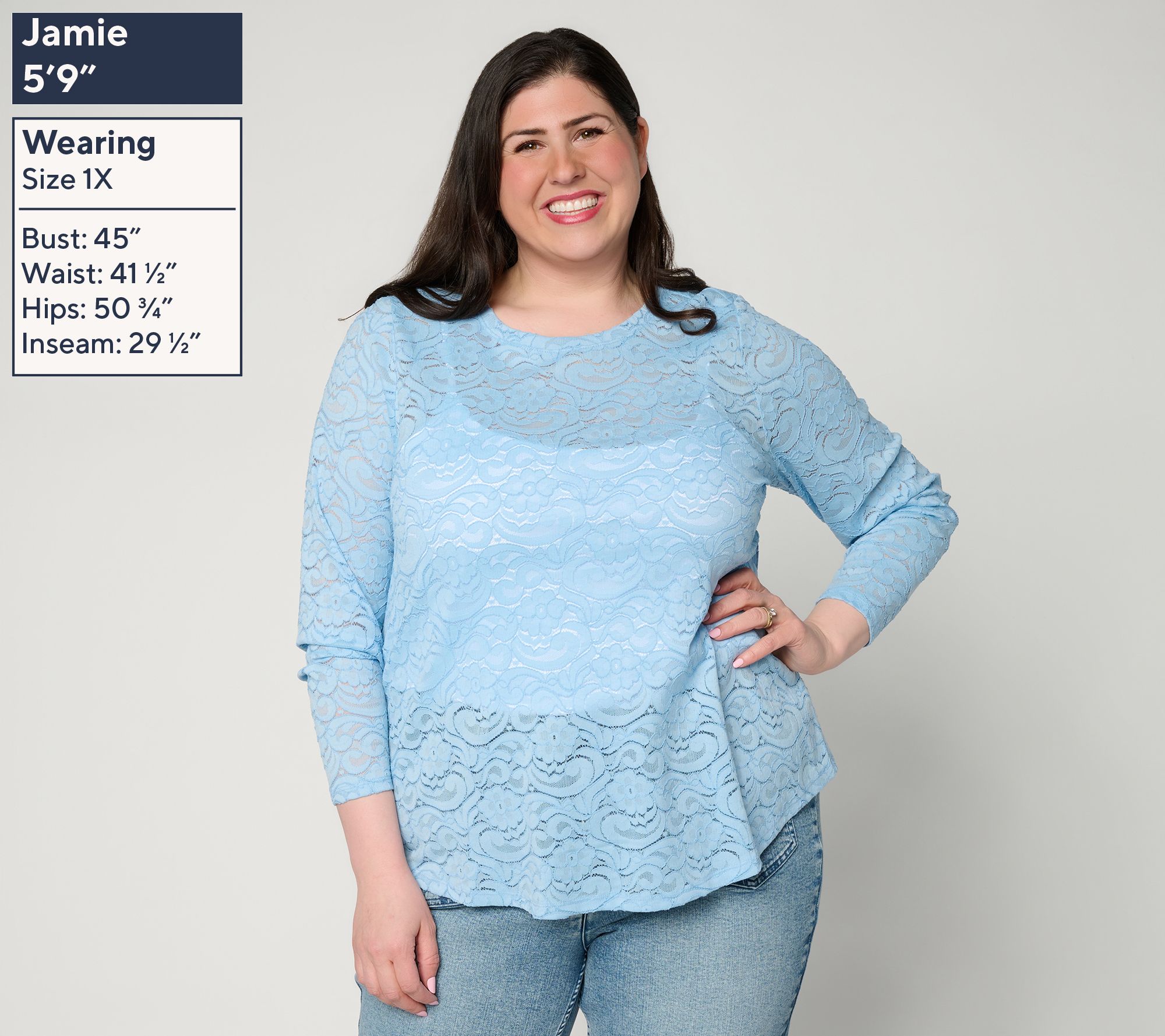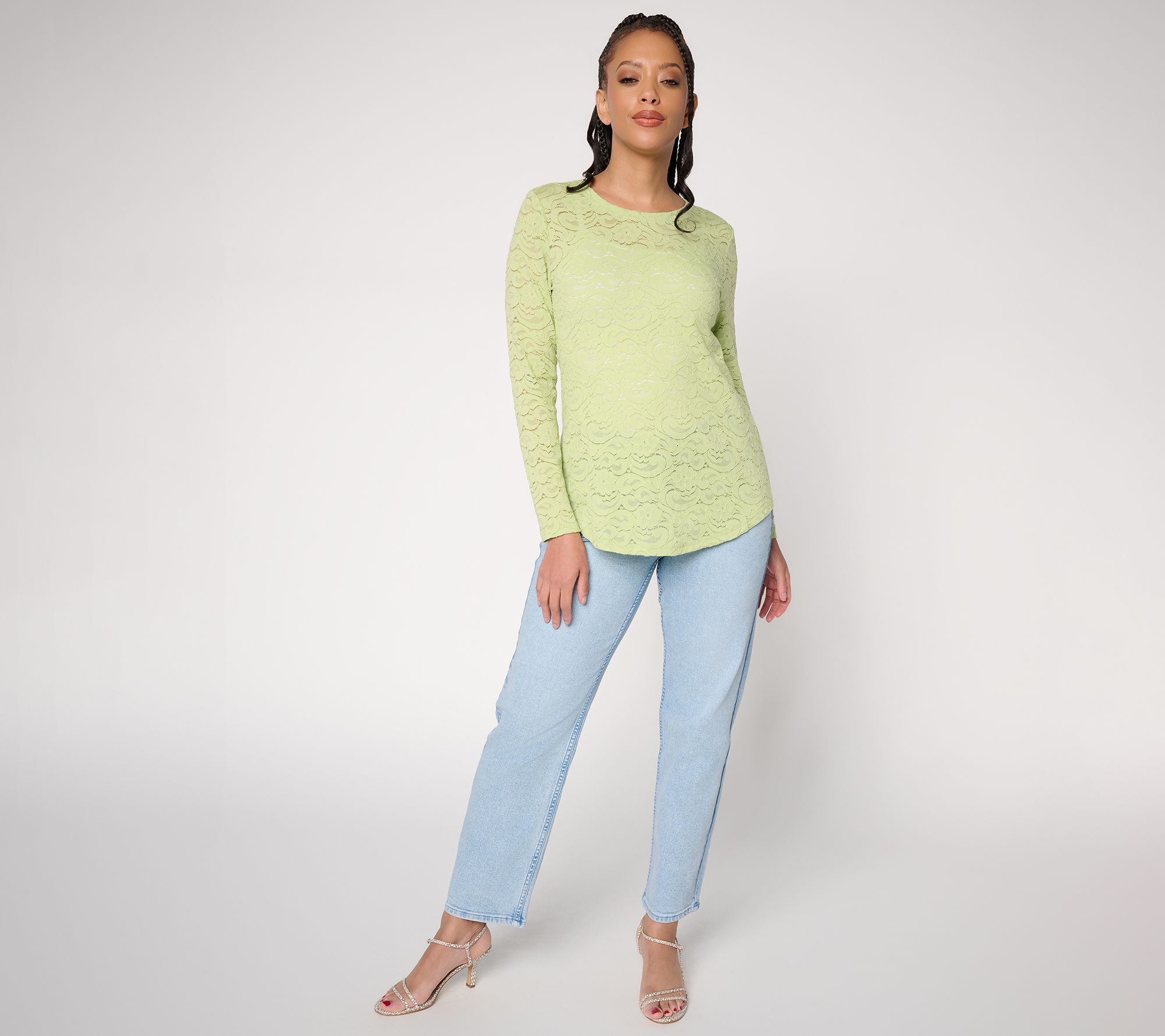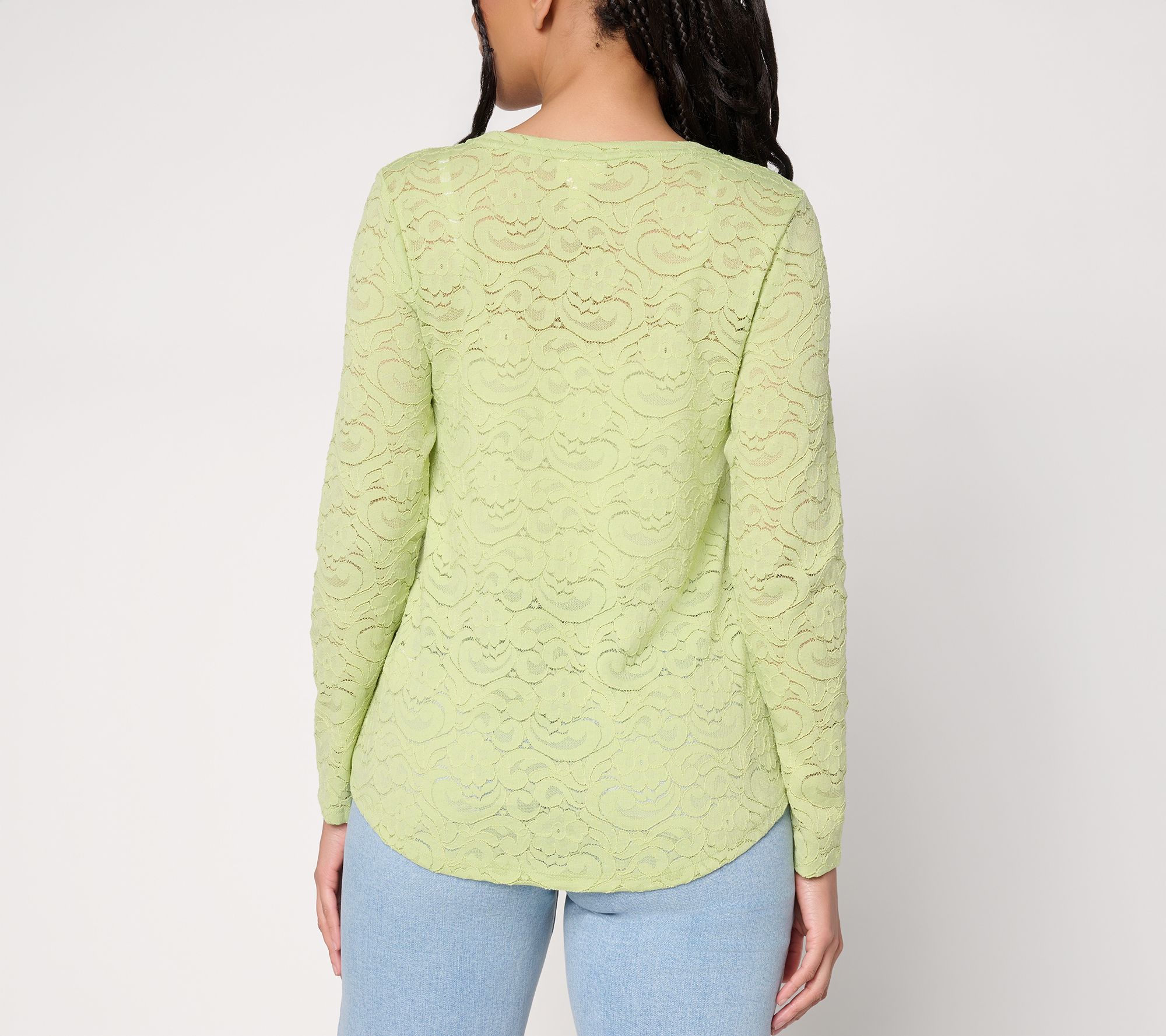 Layering up for cooler days or adding elegant texture to your look is easy with this long-sleeve top. Floral lace brings a touch of romance, while the curved hem drapes beautifully over jeans or trousers. Light, stretchy comfort makes it a smart pick for dinner, brunch, or date night. From LOGO Layers by Lori Goldstein.