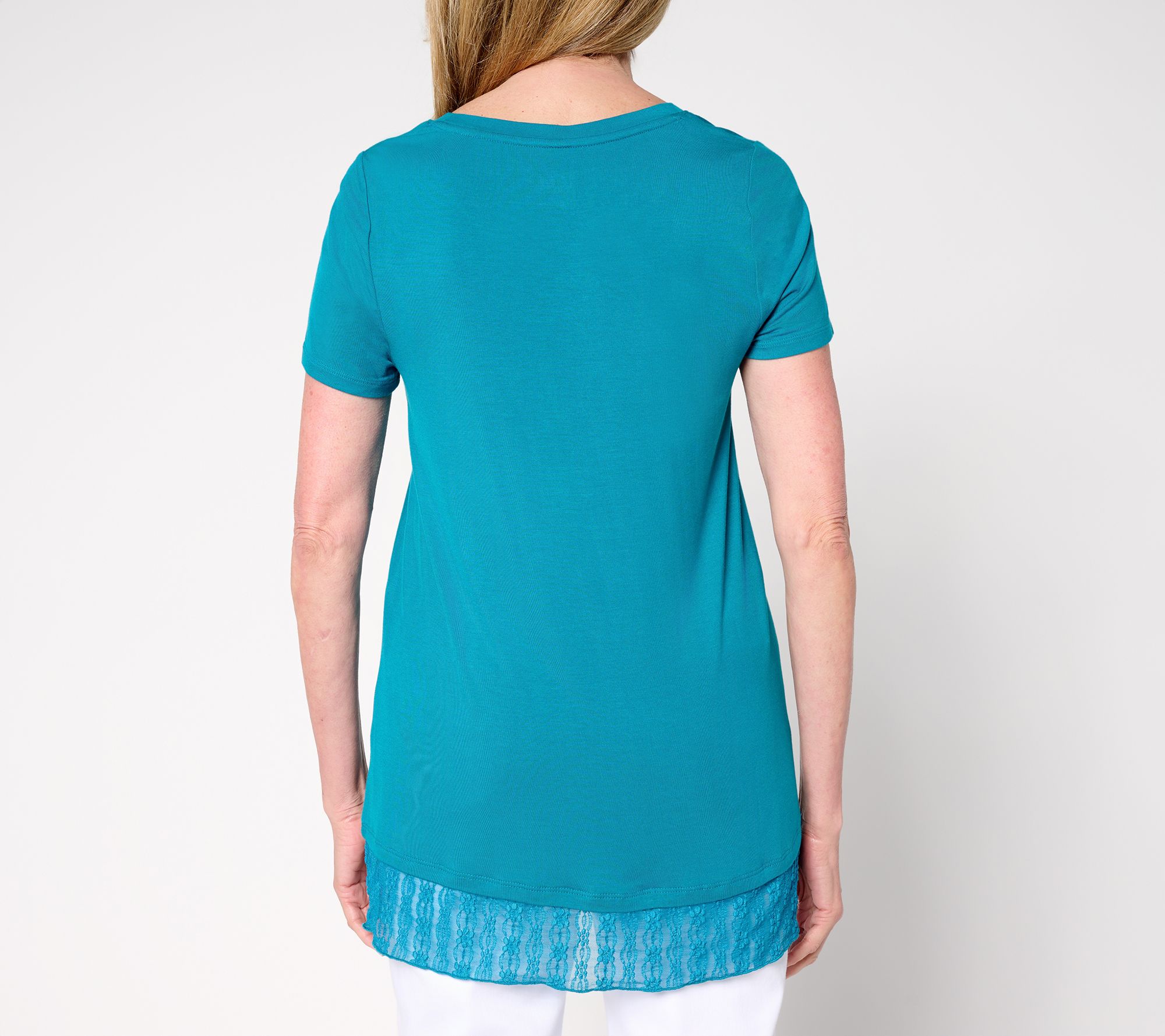 Lace along the hem brings a romantic twist to this short-sleeve top, effortlessly blending feminine detail with day-to-day comfort. The A-line silhouette flares gently at the bottom, making it a breezy pick for everything from brunch plans to afternoon errands. Pair yours with cropped pants or denim for an easy outfit upgrade. From LOGO by Lori Goldstein®.