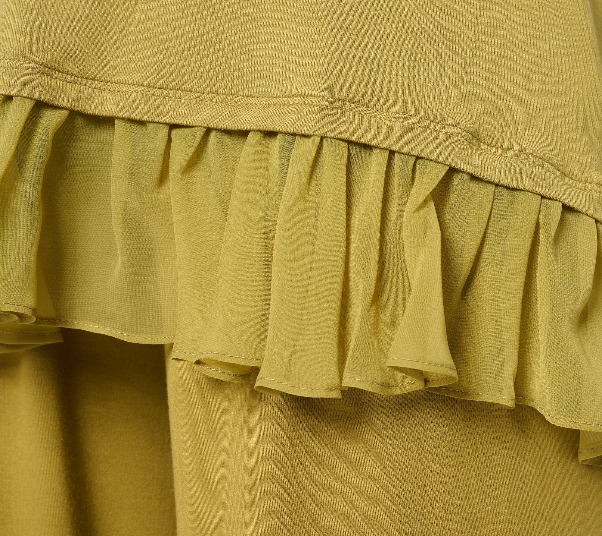 Fabrication: knit body, chiffon ruffle hi-low hem
