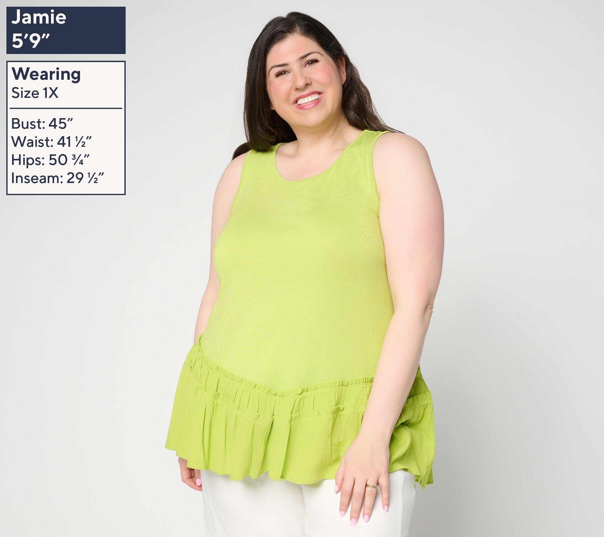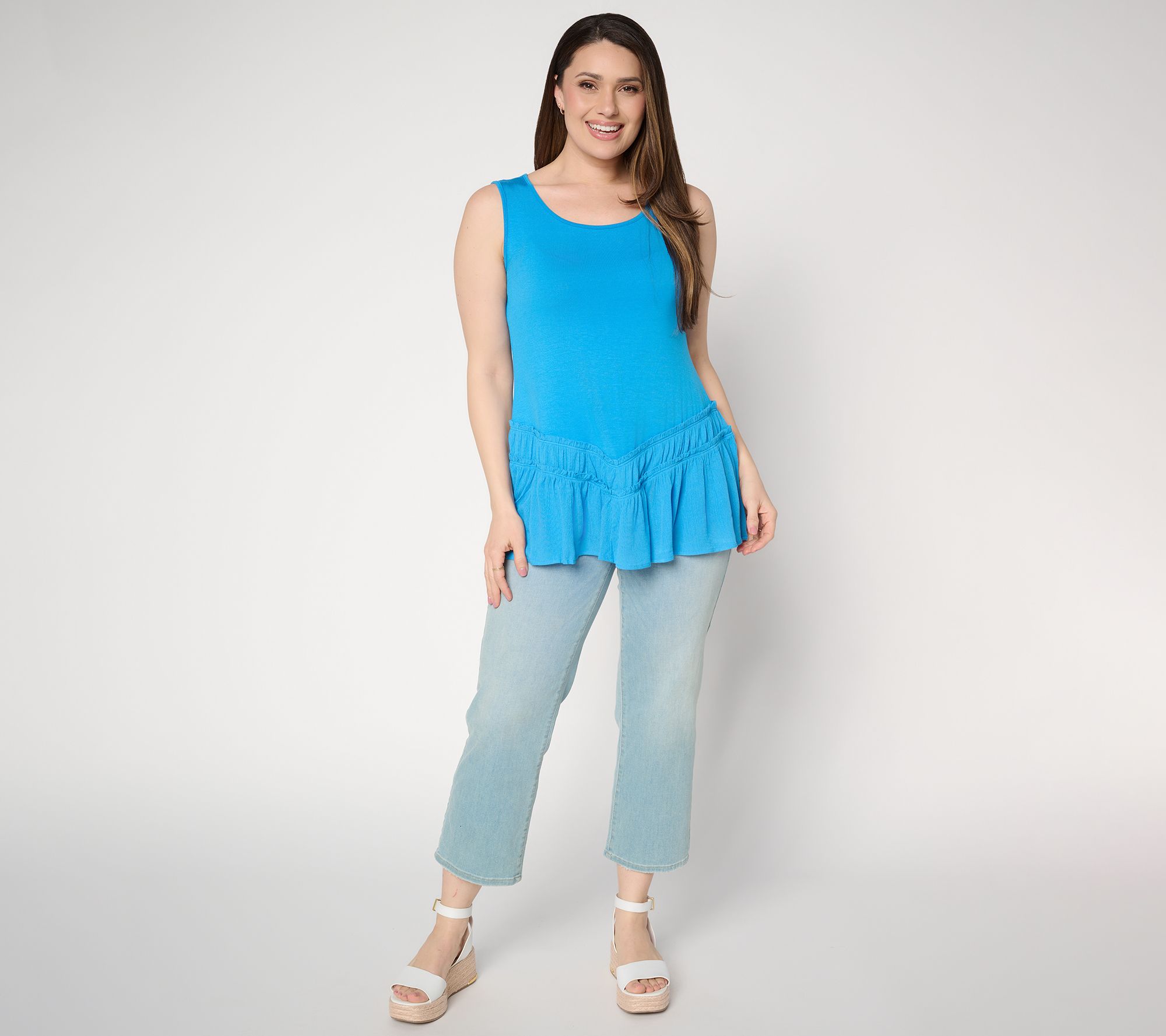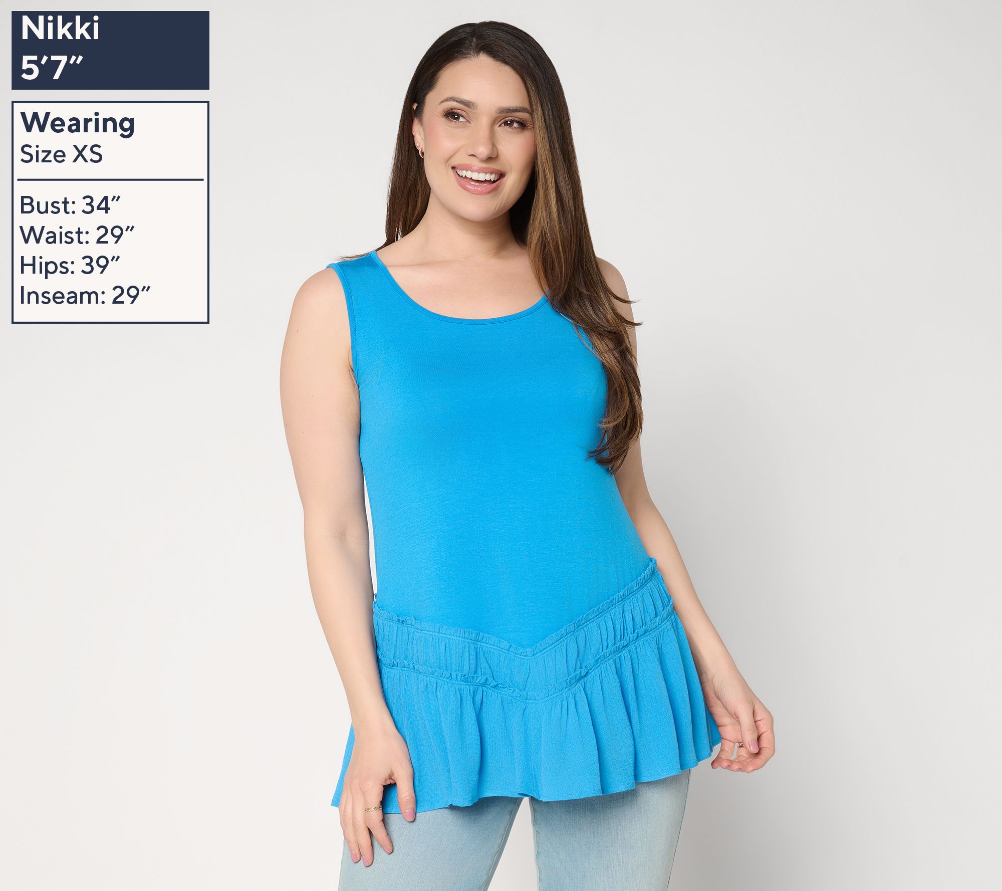 A tank top with a tiered crinkle gauze hem steps up everyday looks with a playful sense of style, perfect for layering under your favorite cardigan or pairing with cropped jeans for laid-back plans. The comfortable semi-fitted shape flatters without clinging, making it easy to dress up or down from daily errands to weekend get-togethers. From LOGO Layers by Lori Goldstein®.