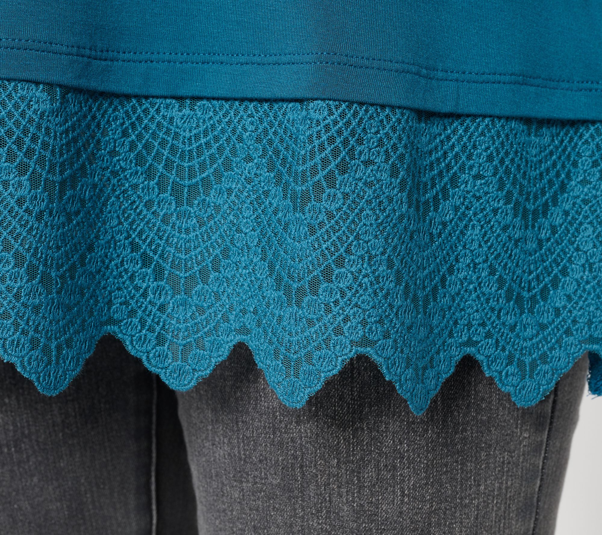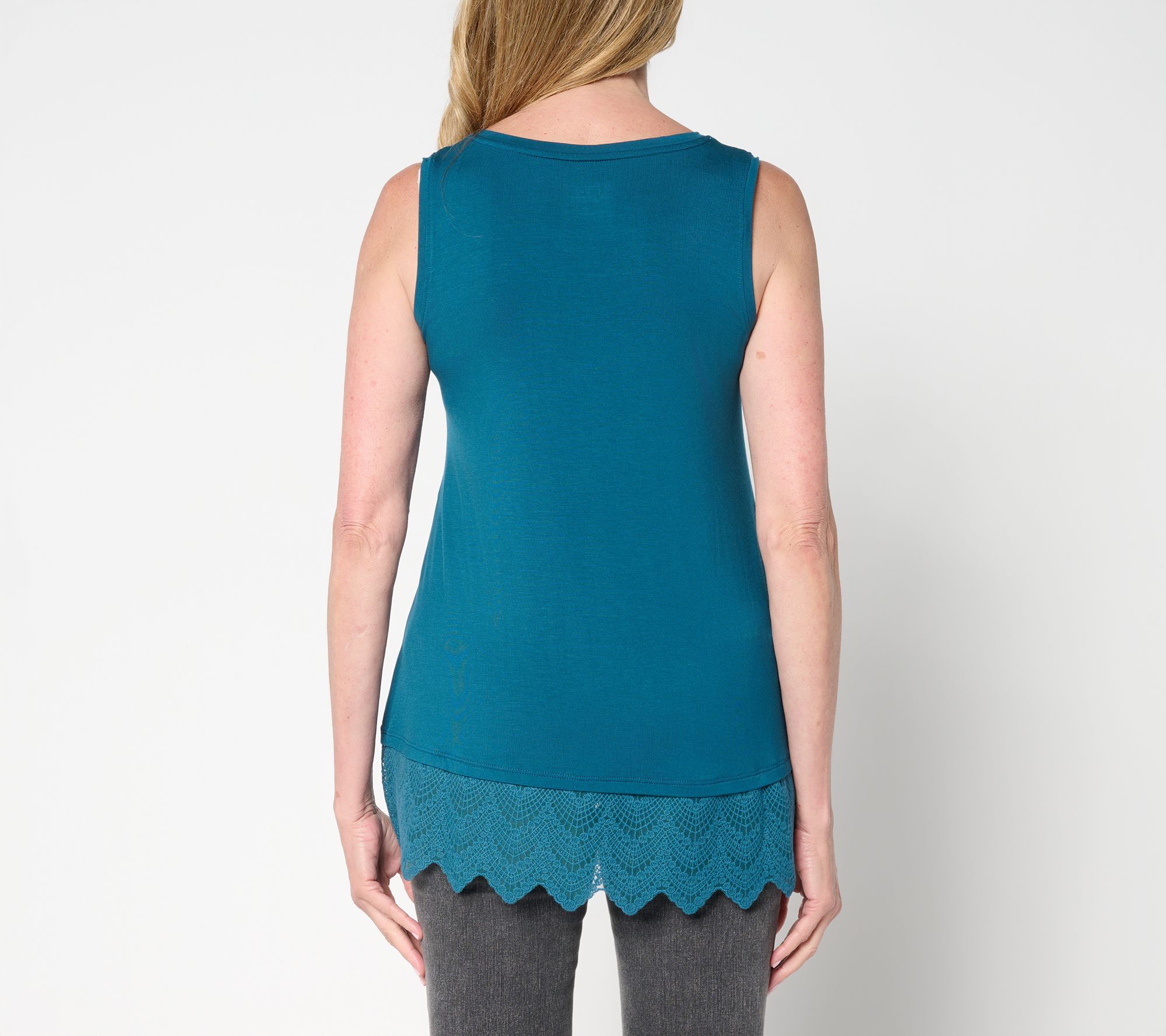 A touch of lace goes a long way to liven up your outfit, and this knit tank brings an elegant finish with embroidered lace trimming the hem. Its semi-fitted shape creates easy lines whether you wear it solo or as a base layer under a favorite cardigan. Reach for this top to add an extra dash of detail to both casual denim or tailored layers. From LOGO Layers by Lori Goldstein®.
