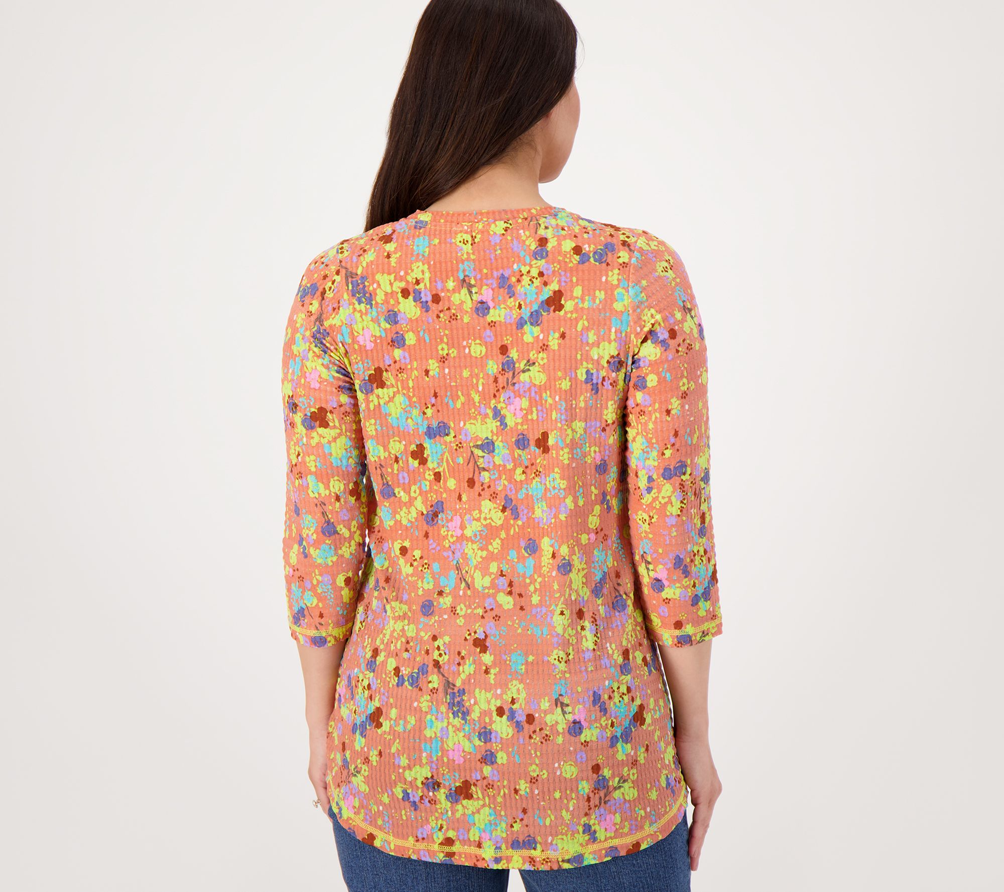 • Features: print, 3/4-length sleeves, crew neckline, tonal coverstitch