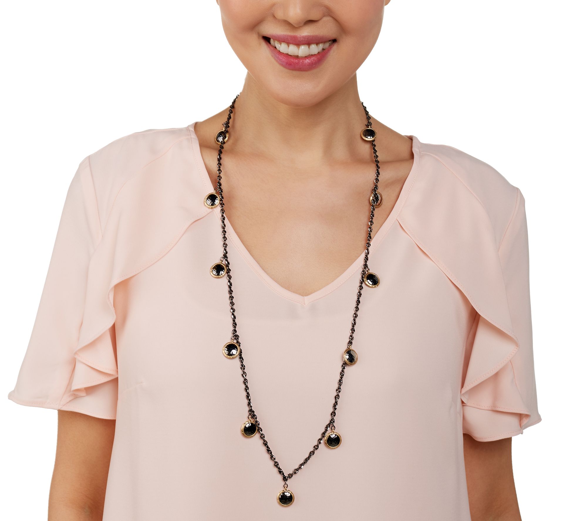 Rich in style, this long gunmetal necklace features stations of antiqued silvertone and gunmetal coins with antiqued goldtone borders. From LOGO Links by Lori Goldstein.