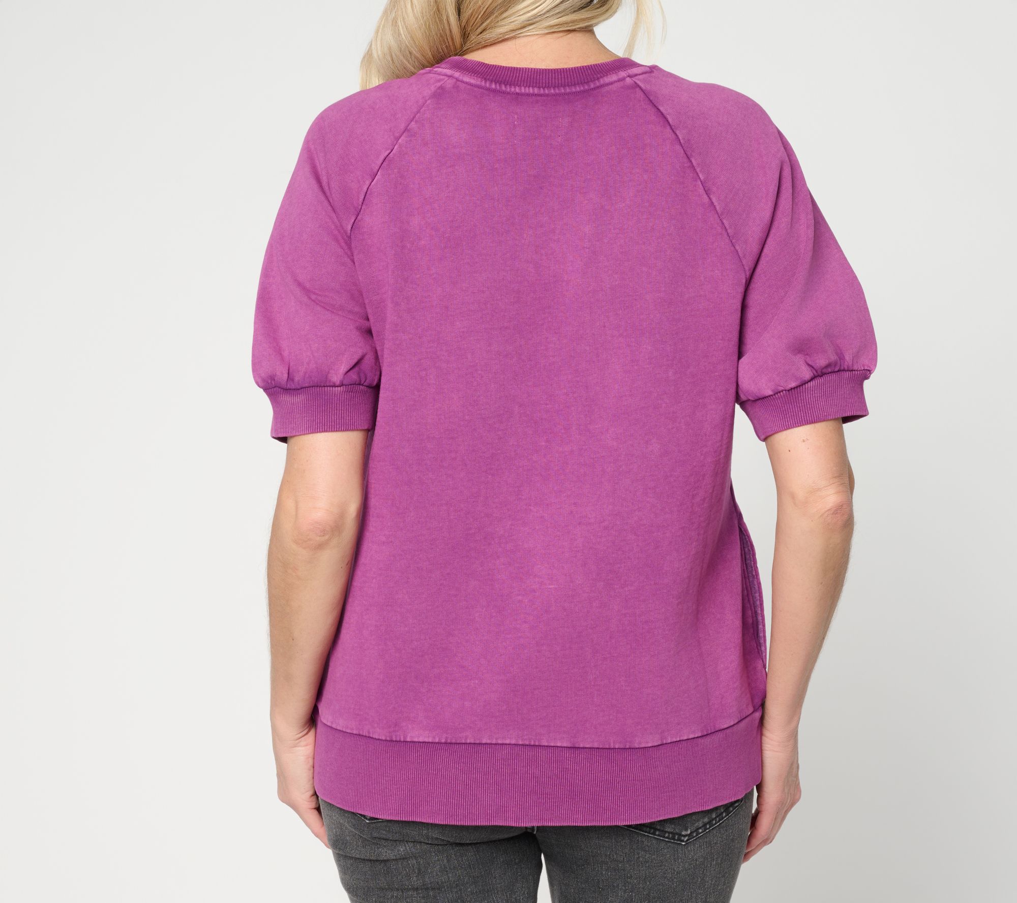 Casual outings and downtime at home get a stylish update with this women's short-sleeve sweatshirt. Overdye detailing and raglan sleeves add a modern edge, making it easy to pair with your favorite jeans or joggers for a laid-back look with a touch of character. From LOGO Lounge by Lori Goldstein.