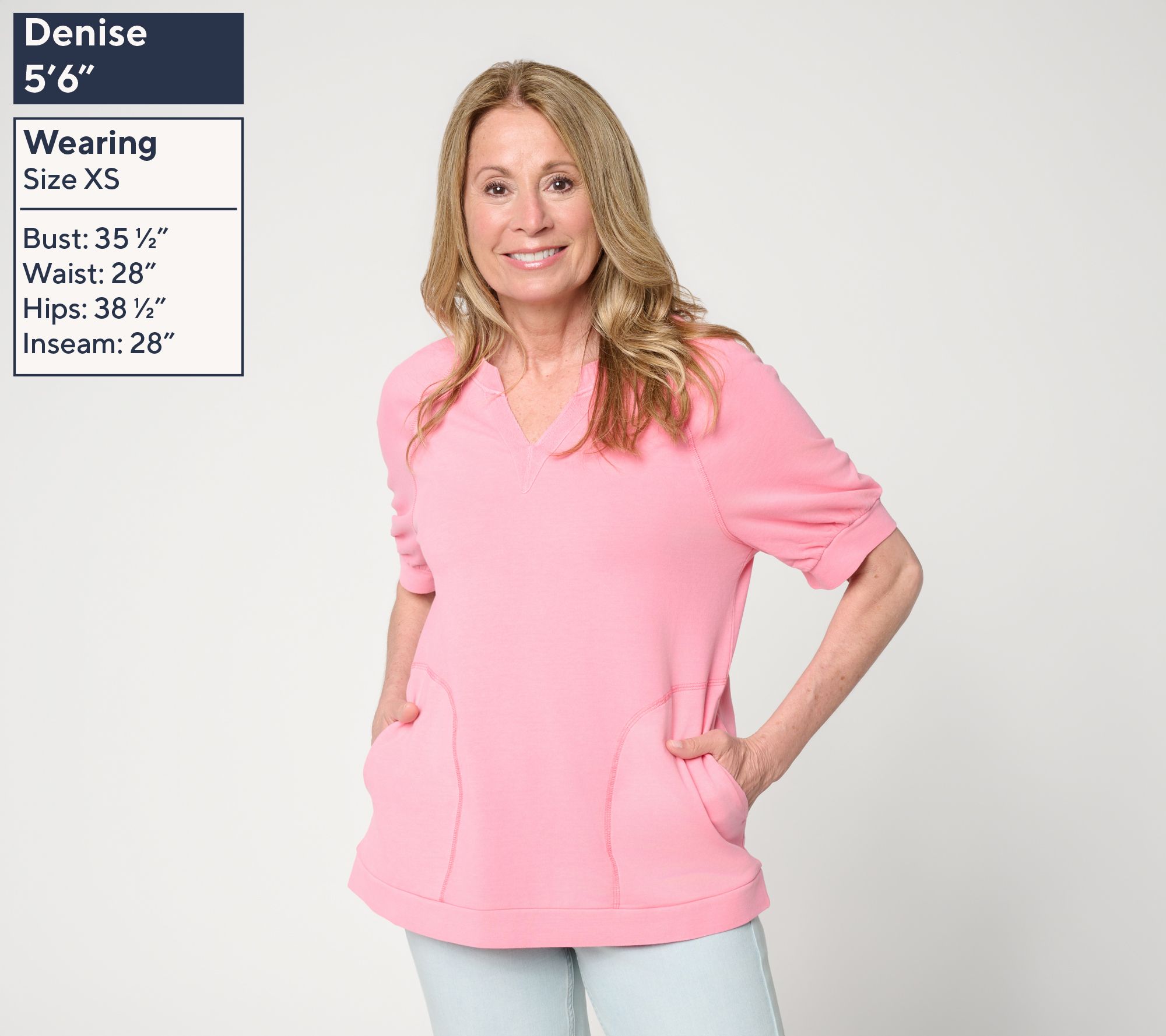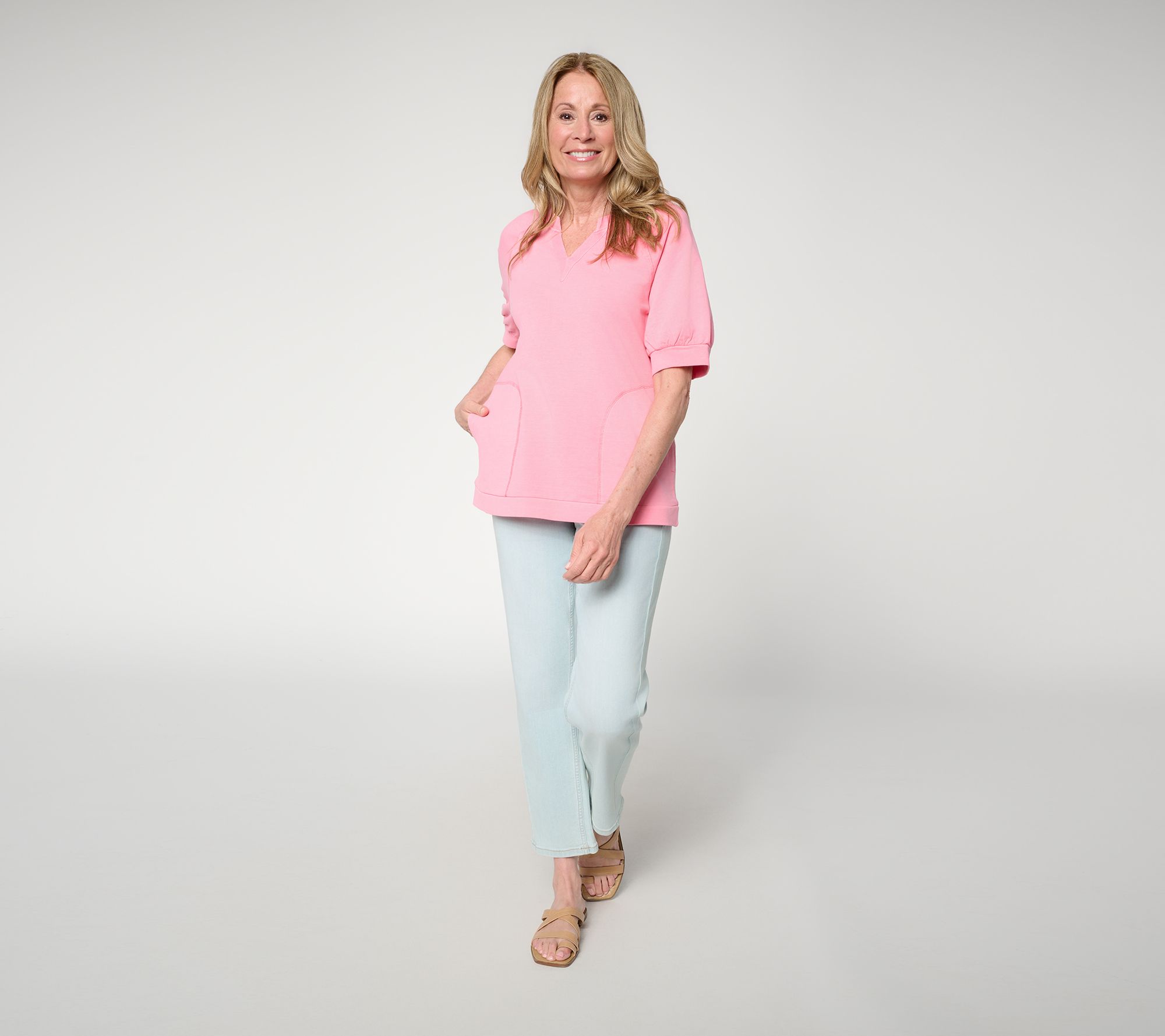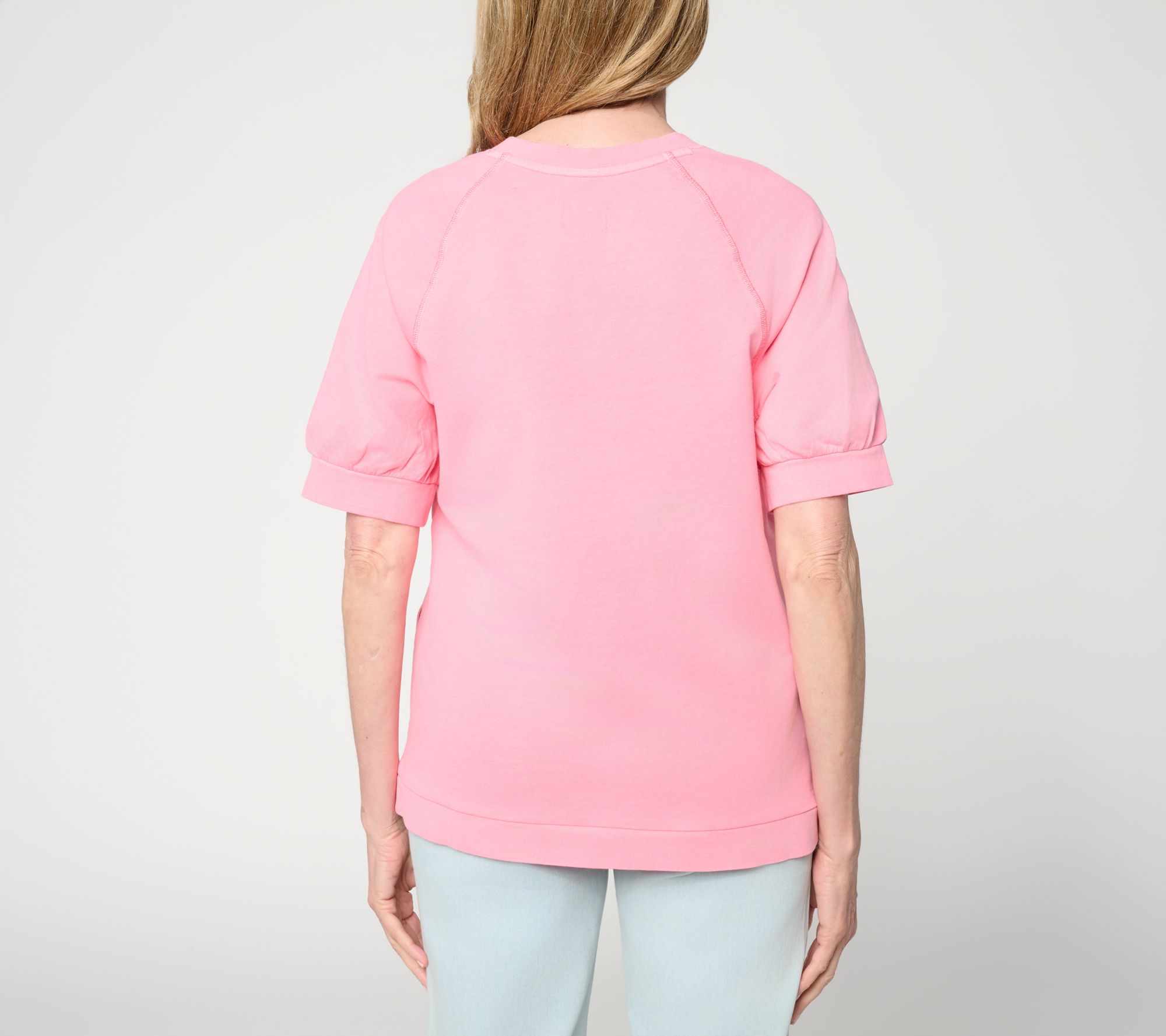 Shhh. Yes, it's a sweatshirt, but let's keep that our little secret. Greet your weekends in comfort and style sporting this LOGO find -- whether it's a grocery run or grabbing coffee with the gals. The soft cotton-rich blend makes it easy to throw on for a morning stroll or movie night -- but it's the split neckline and shirred, cuffed sleeves that deliver a little more detail than your typical easygoing sweatshirt. From LOGO Lounge by Lori Goldstein®.