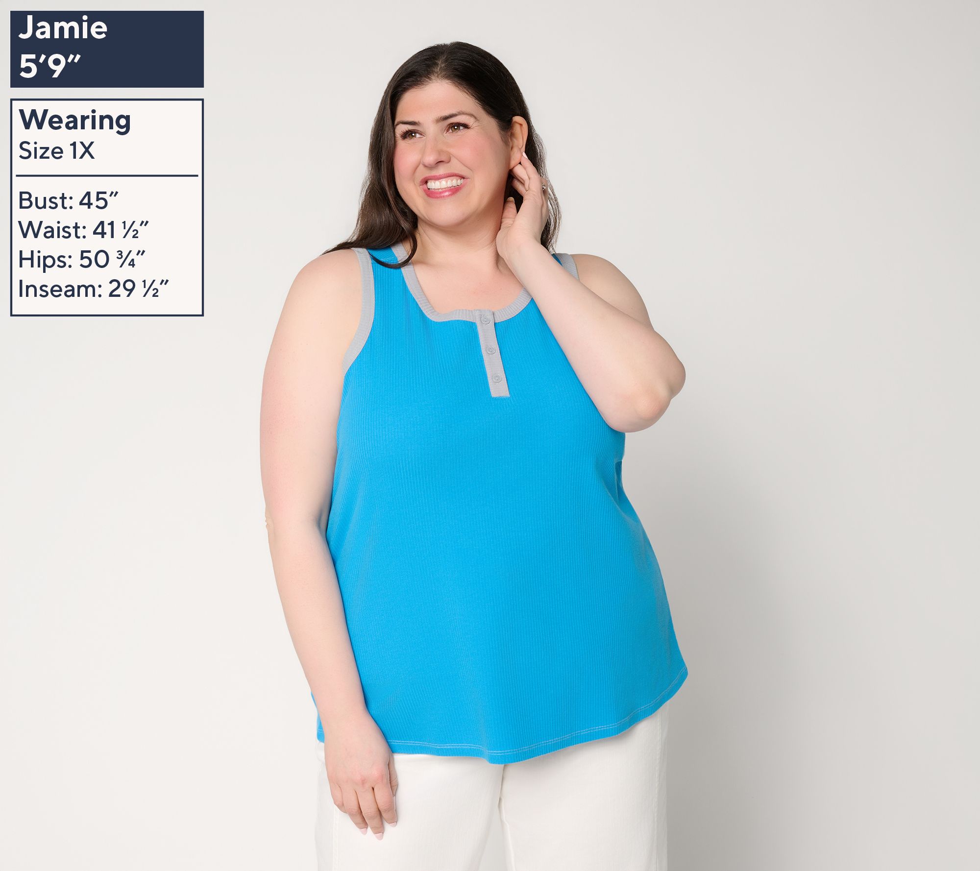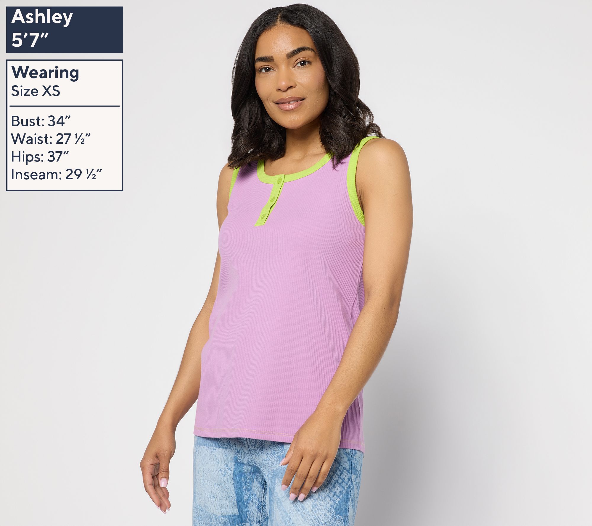 Add a pop of personality to your summer wardrobe with this ribbed tank top. The contrast trim and classic crewneck with placket detail give you a versatile piece that pairs effortlessly with shorts or layered under a cardigan for evening outings. Styled for comfort with a sleeveless silhouette, this top transitions seamlessly from day to night. From LOGO Principles by Lori Goldstein.