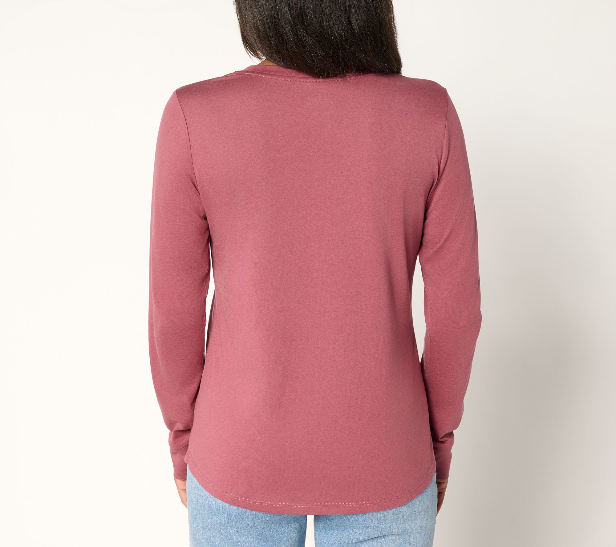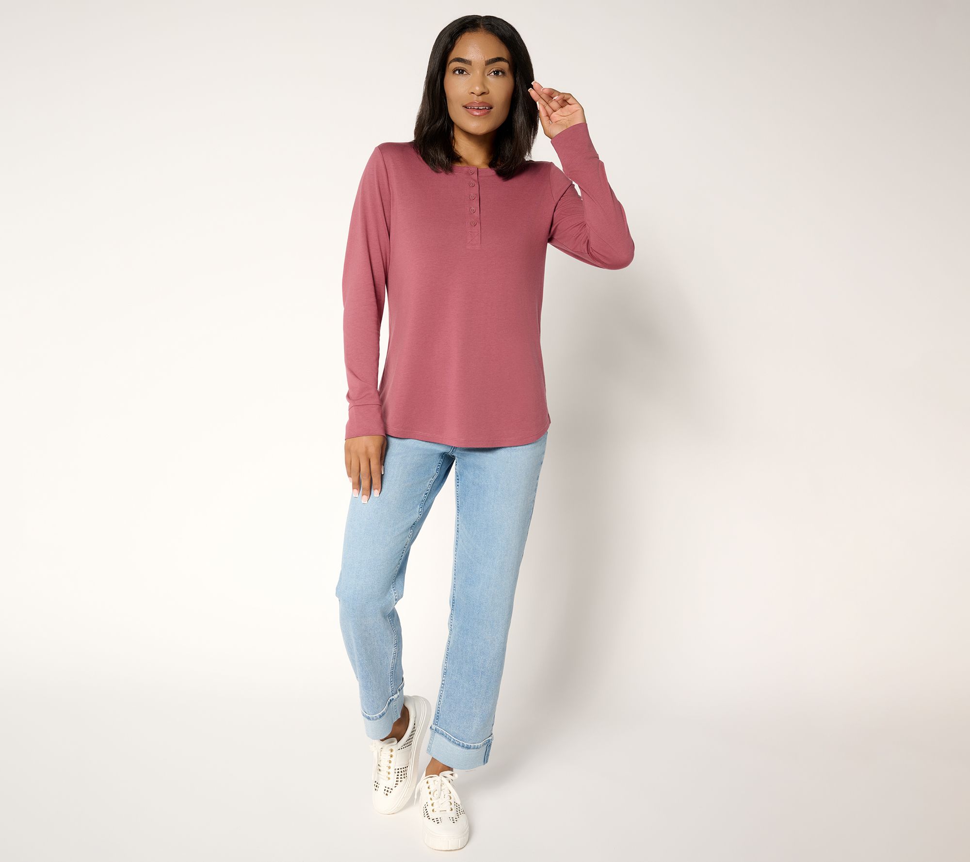 This henley hits it out of the park! Cotton-rich with plenty of drapey modal, the LOGO wardrobe winner offers a soft hand feel that instantly elevates this borrowed-from-the-boys button-up. From LOGO Principles by Lori Goldstein®.