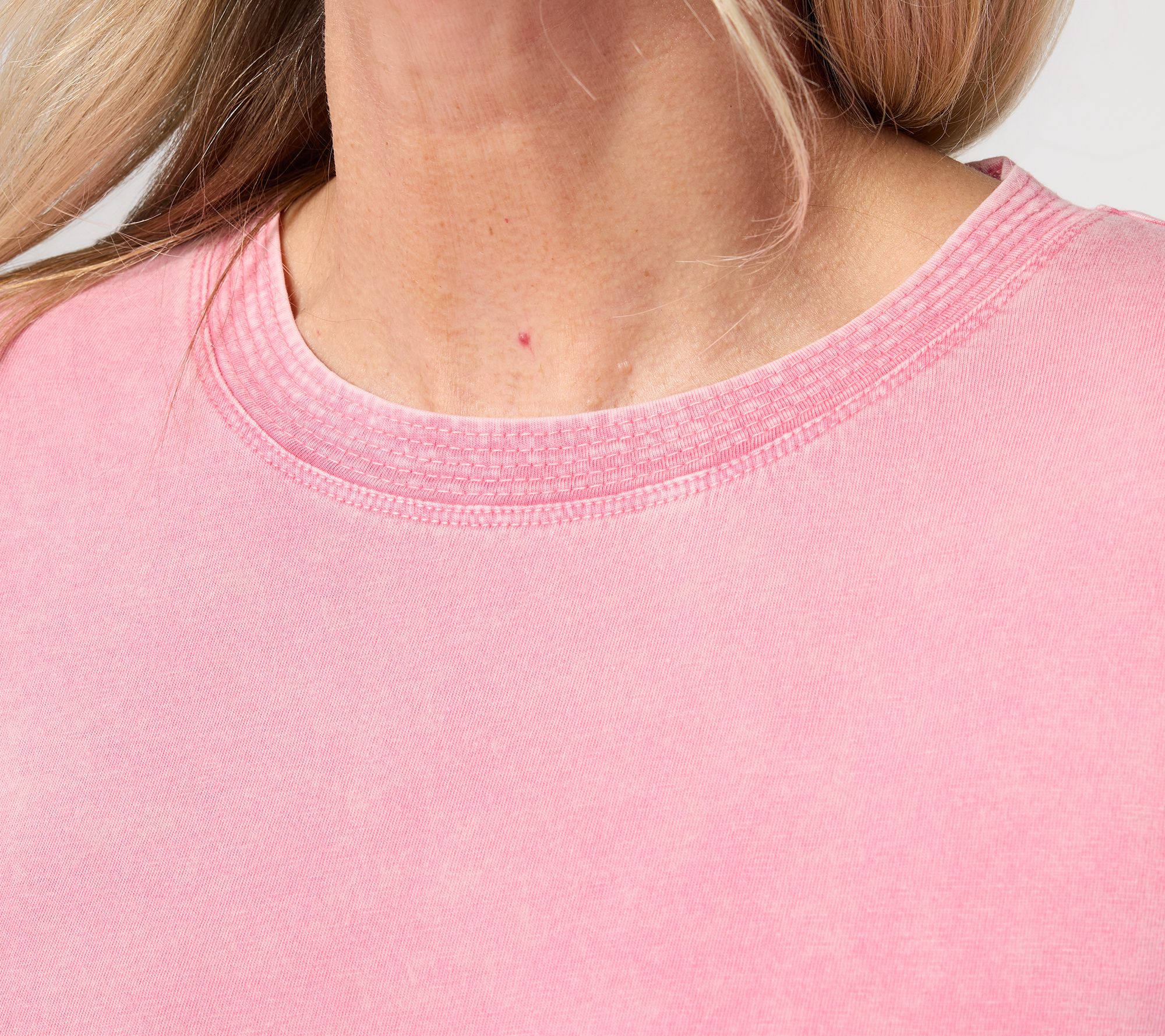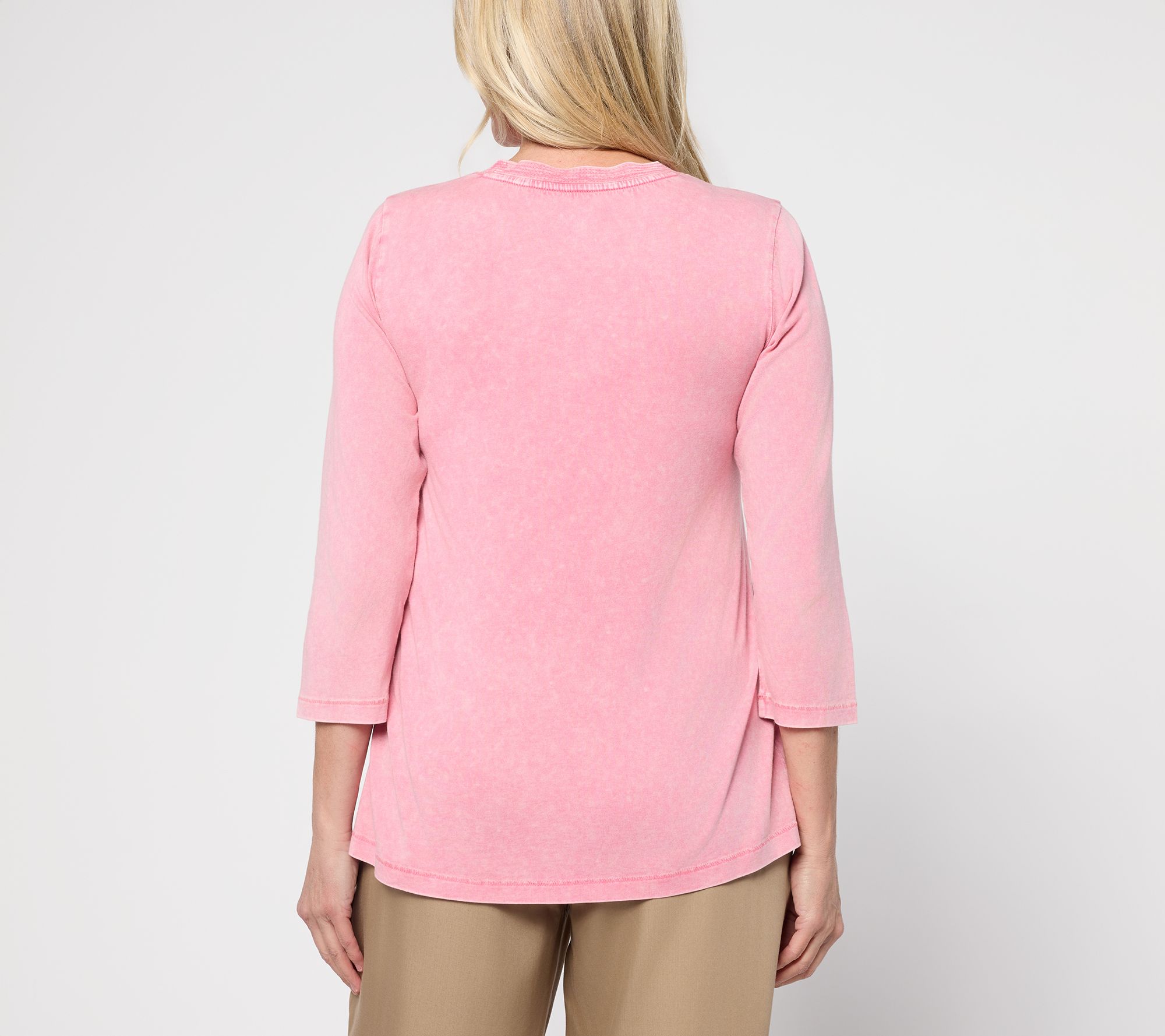 • Features: sun-faded wash, trapunto stitch detailing at neckline with raw edge, 3/4-length sleeves, crew neckline