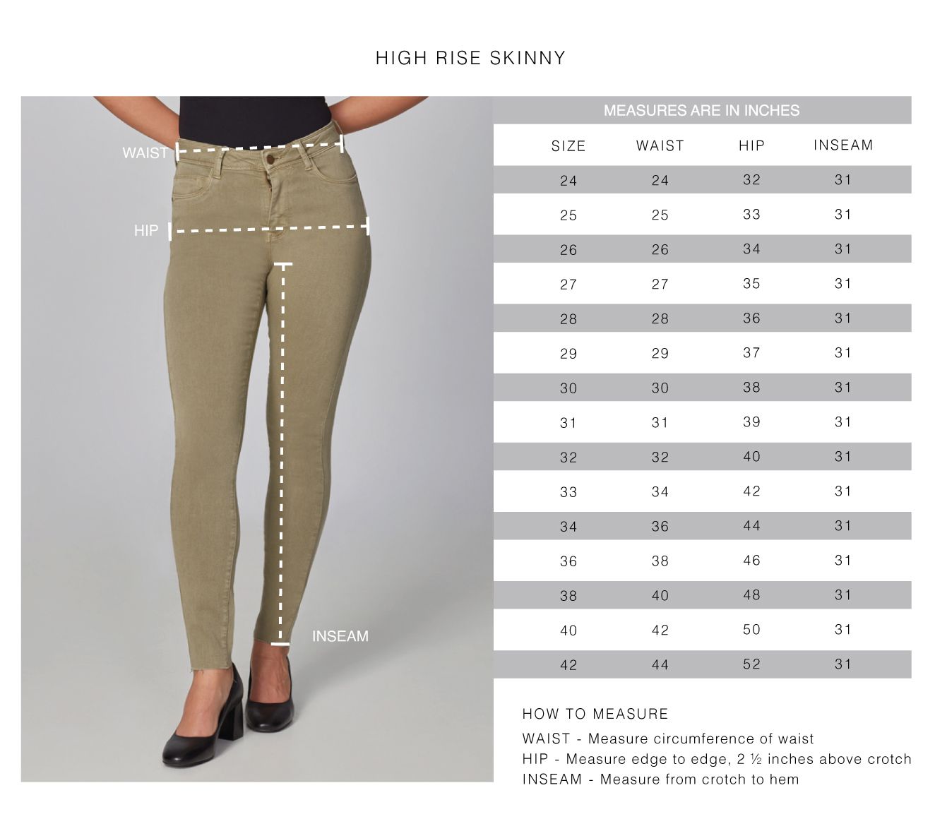 • Leg Shape: slim leg; fits close to the body through the entire leg