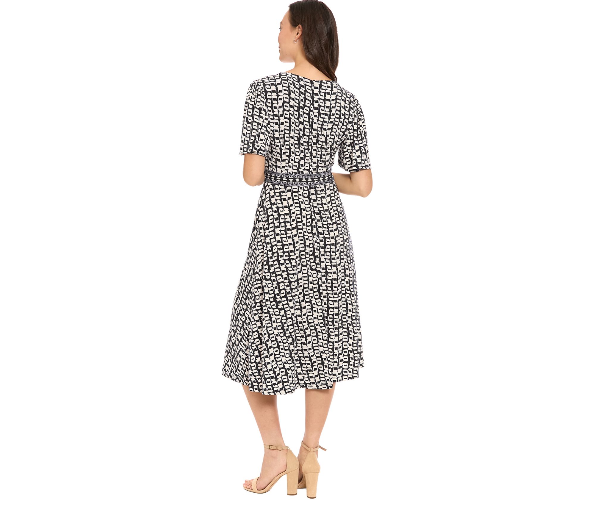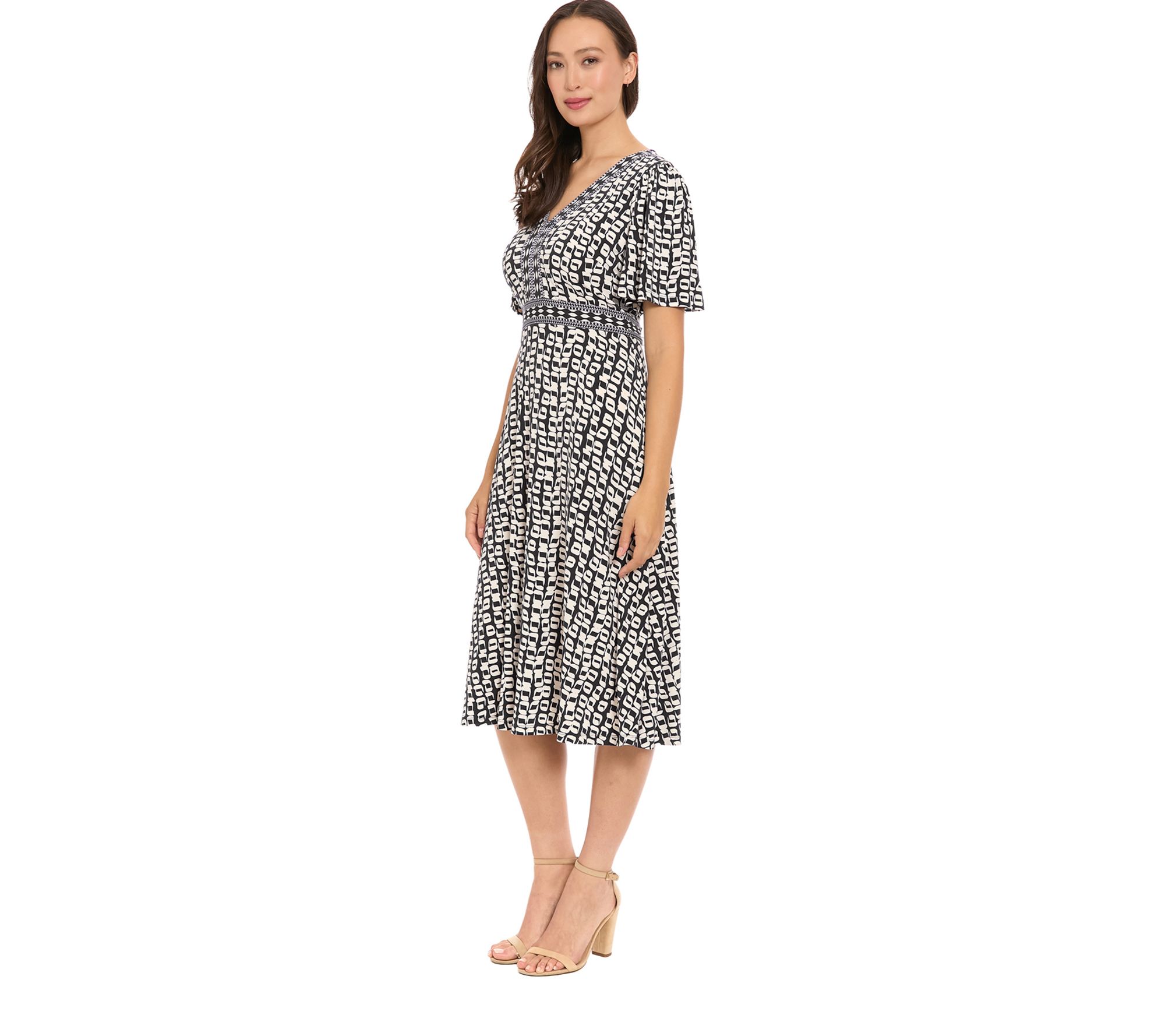 Add a dose of charm to your every day with this flutter flare dress, designed with an elegant framed V-neck for a touch of polish. Whether heading out for coffee with friends or breezing through brunch dates, the easy-flowing silhouette offers flattering comfort with a hint of playful movement. From London Times.