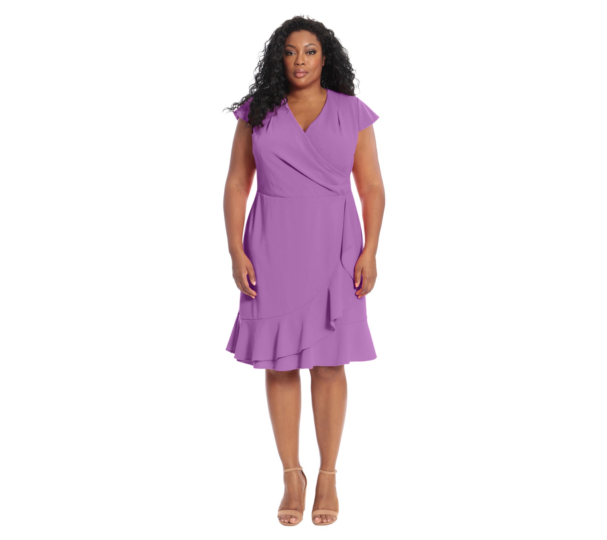 London Times Knee Length Ruffle Faux Wrap Dress-Plus