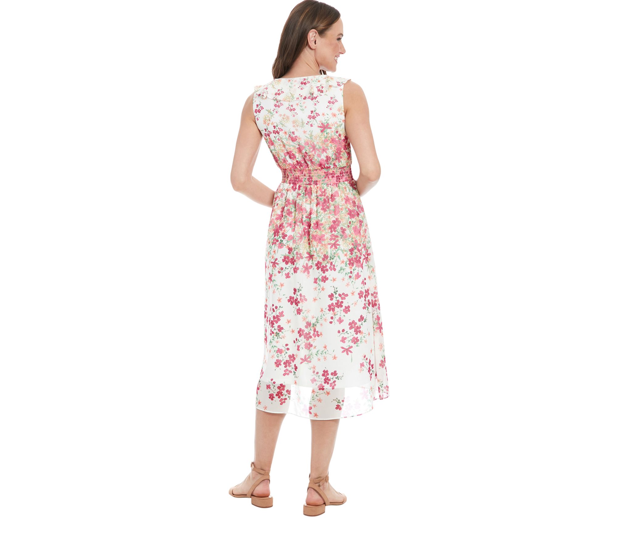 • Features: allover floral print, V-neckline, sleeveless, hi-low midi length