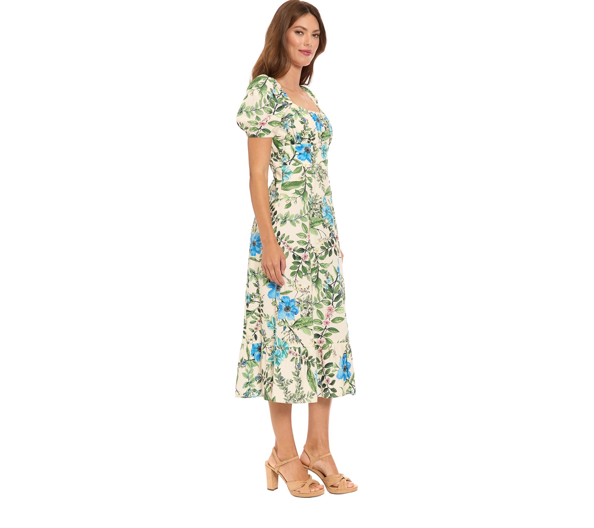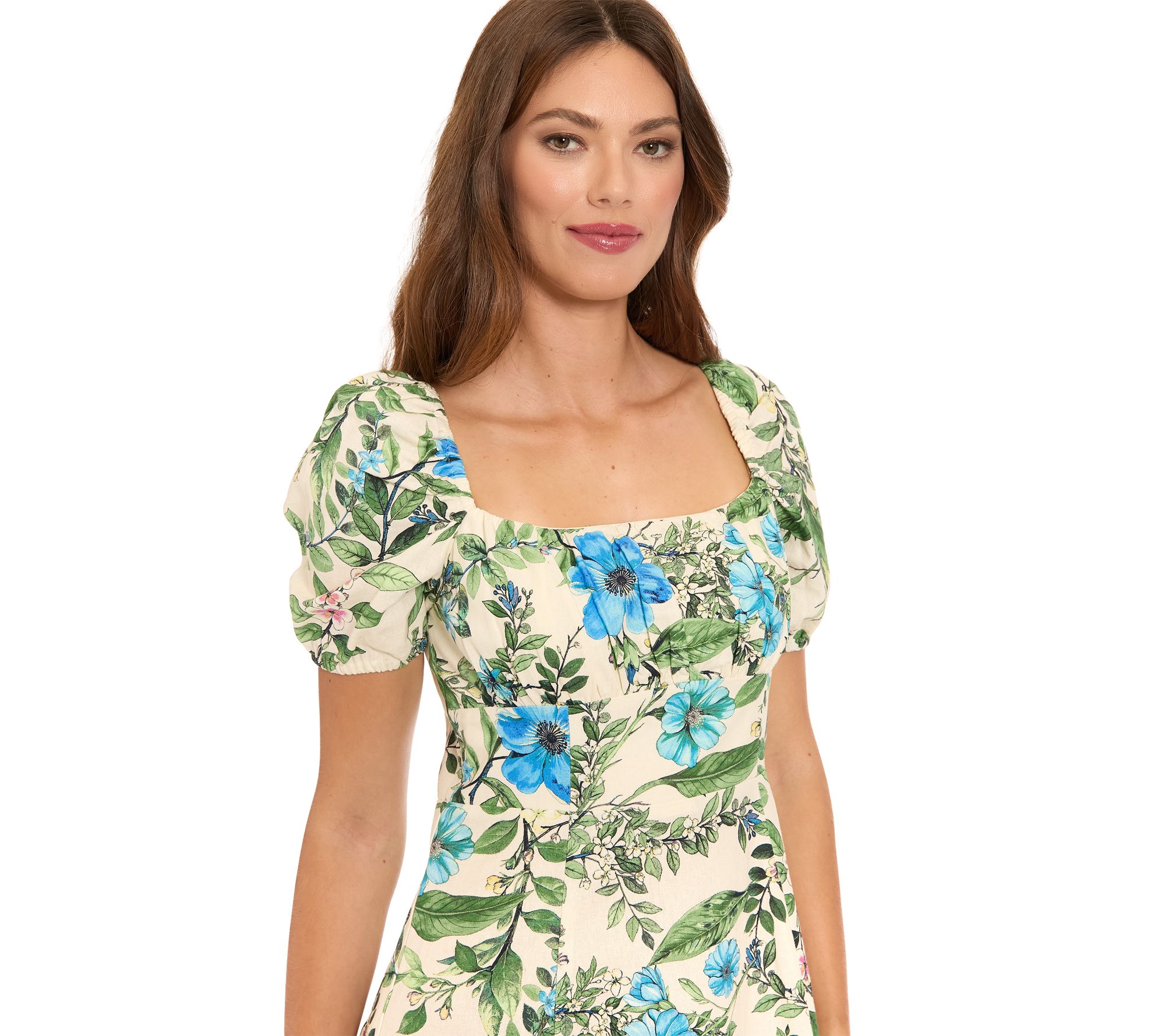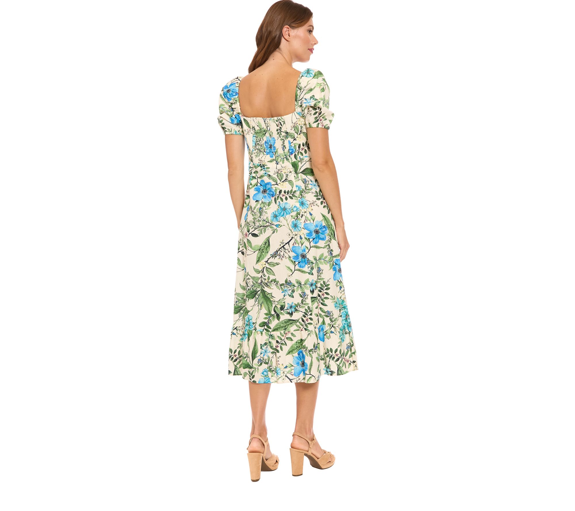 • Features: floral print, puff sleeves, square neckline, empire waist, smocked bodice, midi length