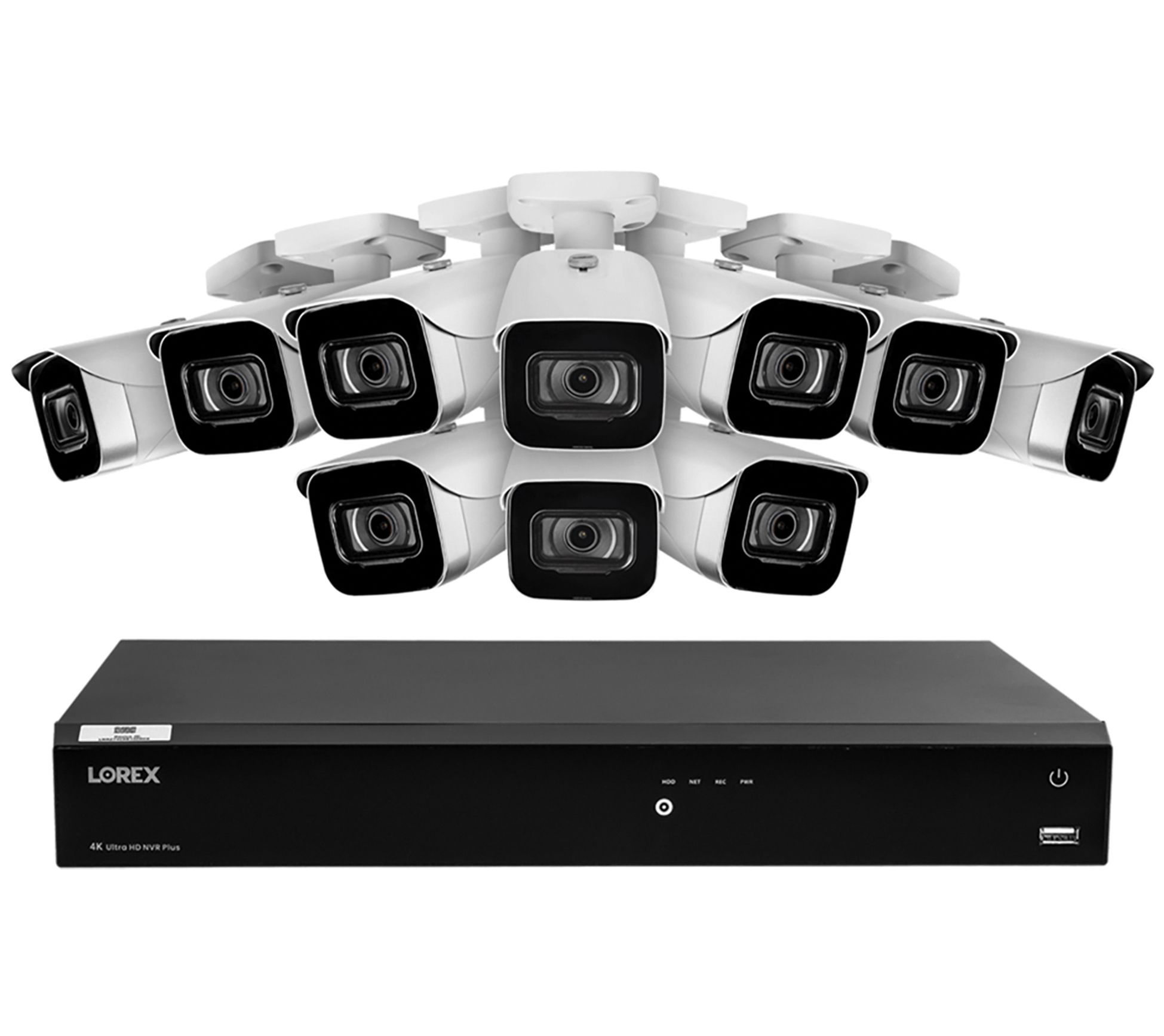 • Includes network video recorder, power adapter, USB mouse, Ethernet cable, HDMI cable, 10 4K IP security cameras, 10 mounting kits, and 10 100' Cat5e cables