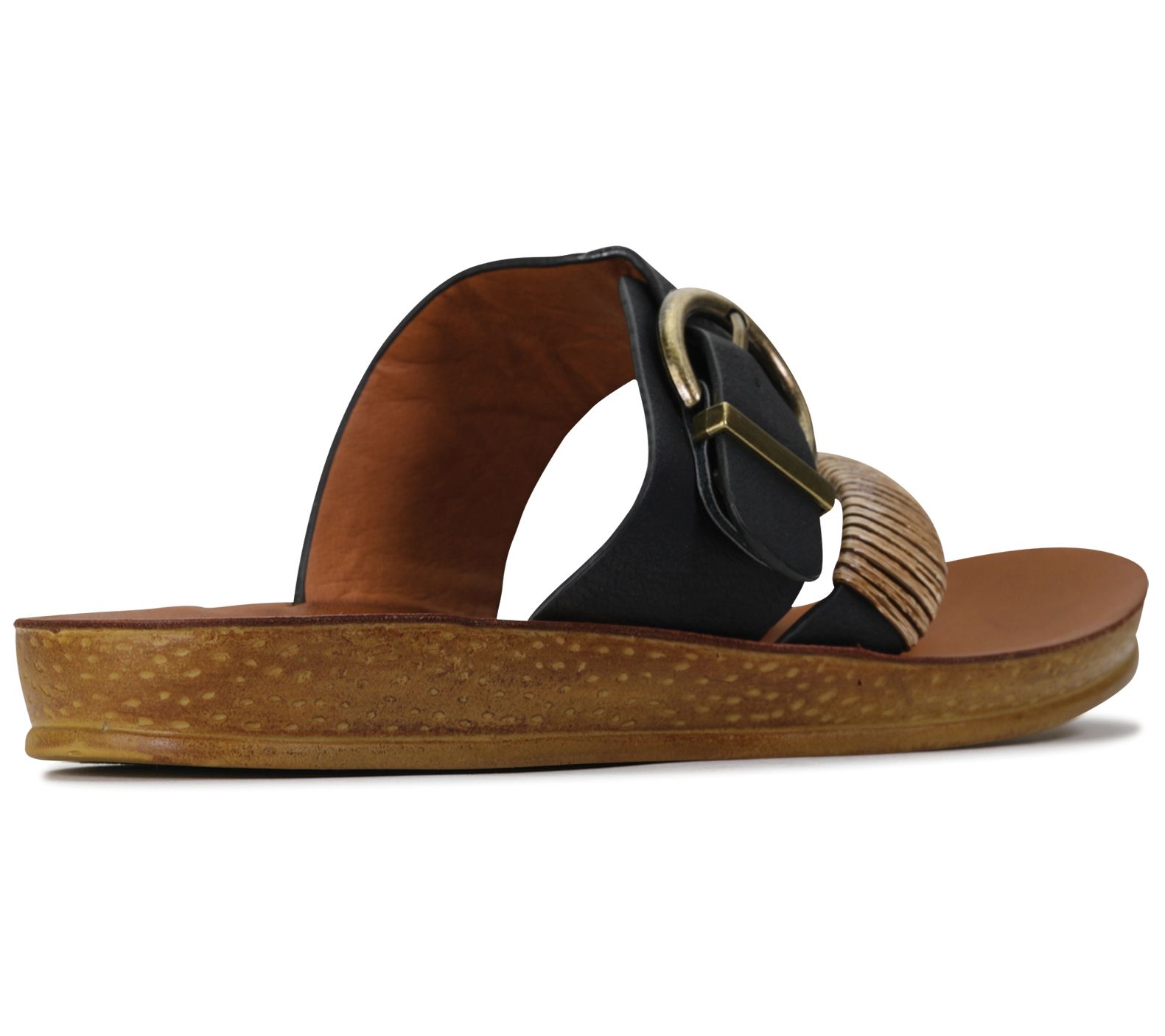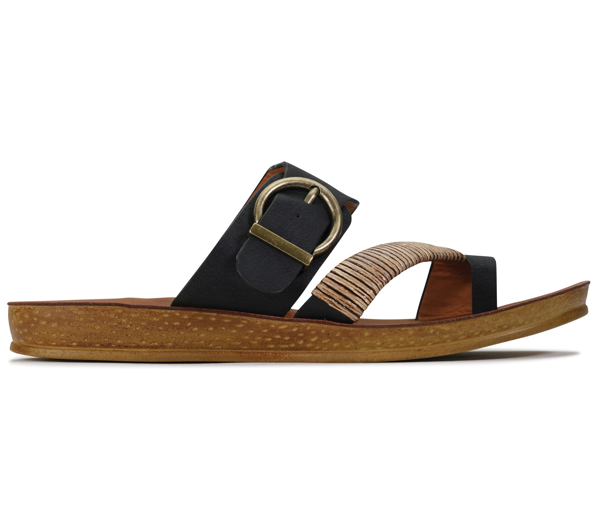 Faux leather straps, round buckle closure, woven bamboo toe wrap, rounded open toe