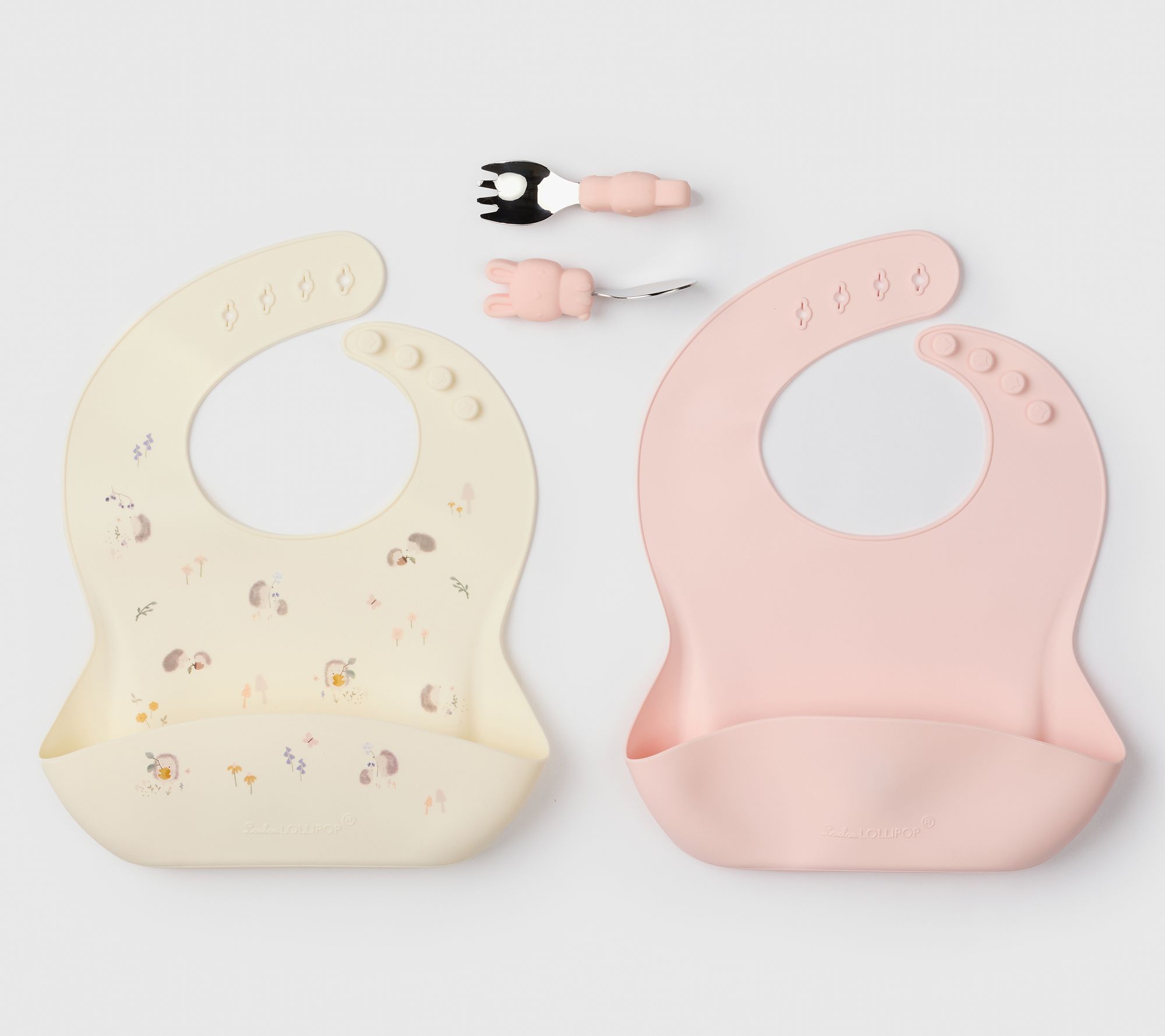 Mealtime becomes a delightful adventure with this adorable and functional feeding set. Featuring two silicone bibs and a learning utensil set, each utensil has a playful animal-shaped handle designed for easy grip. Little hands will love mastering scooping and self-feeding skills with these fun tools. The bibs are smooth and comfortable, ensuring a stress-free dining experience. From Loulou Lollipop.