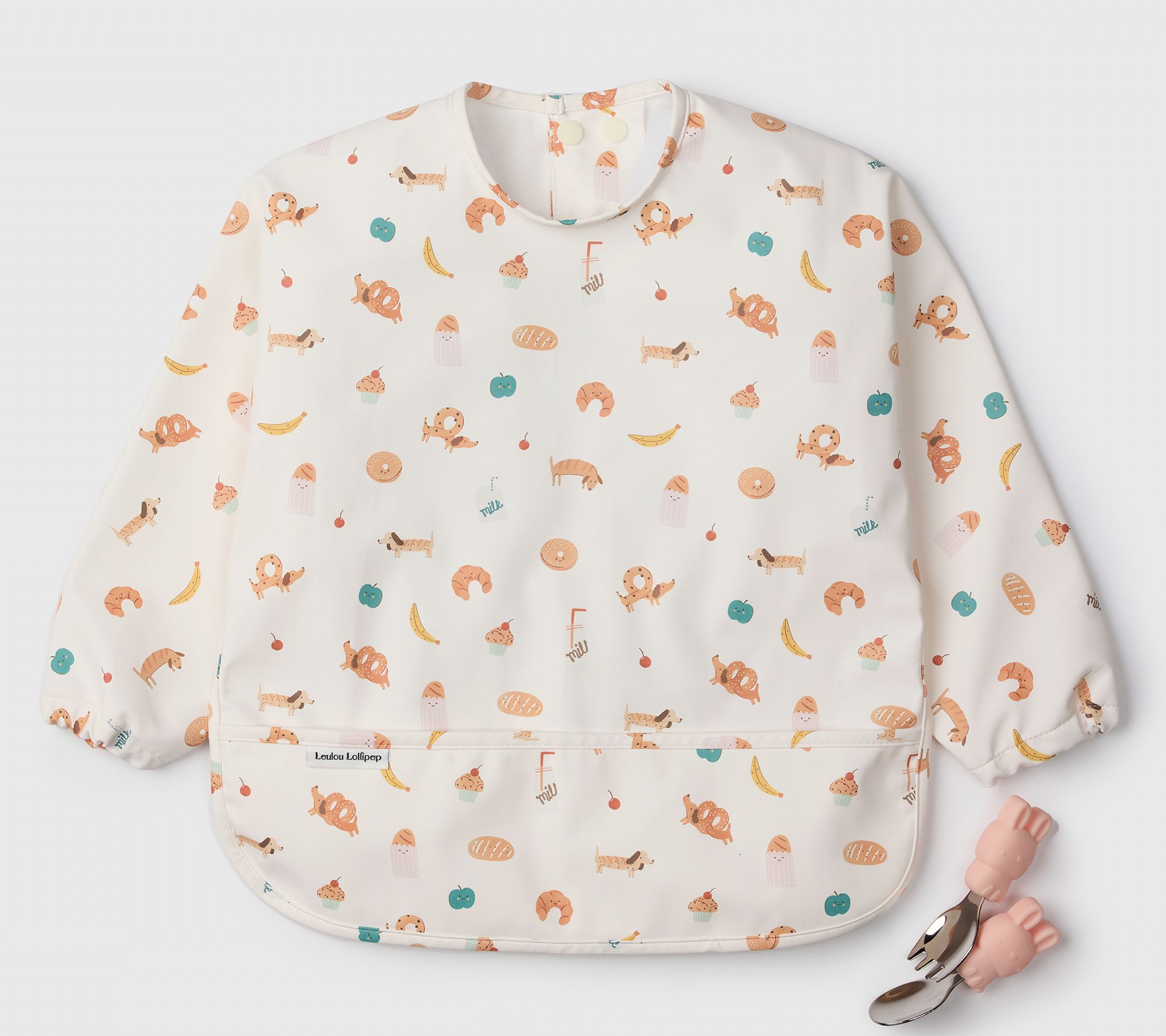 Enjoy mealtime with the adorable Loulou Lollipop long sleeve bib and learning utensil set. Featuring a delightful French breakfast print and cute bunny-themed utensils, this set offers full-sleeve protection and easy grip utensils perfect for little hands learning to self-feed. The lightweight, water-resistant bib makes clean-up a breeze. From Loulou Lollipop.