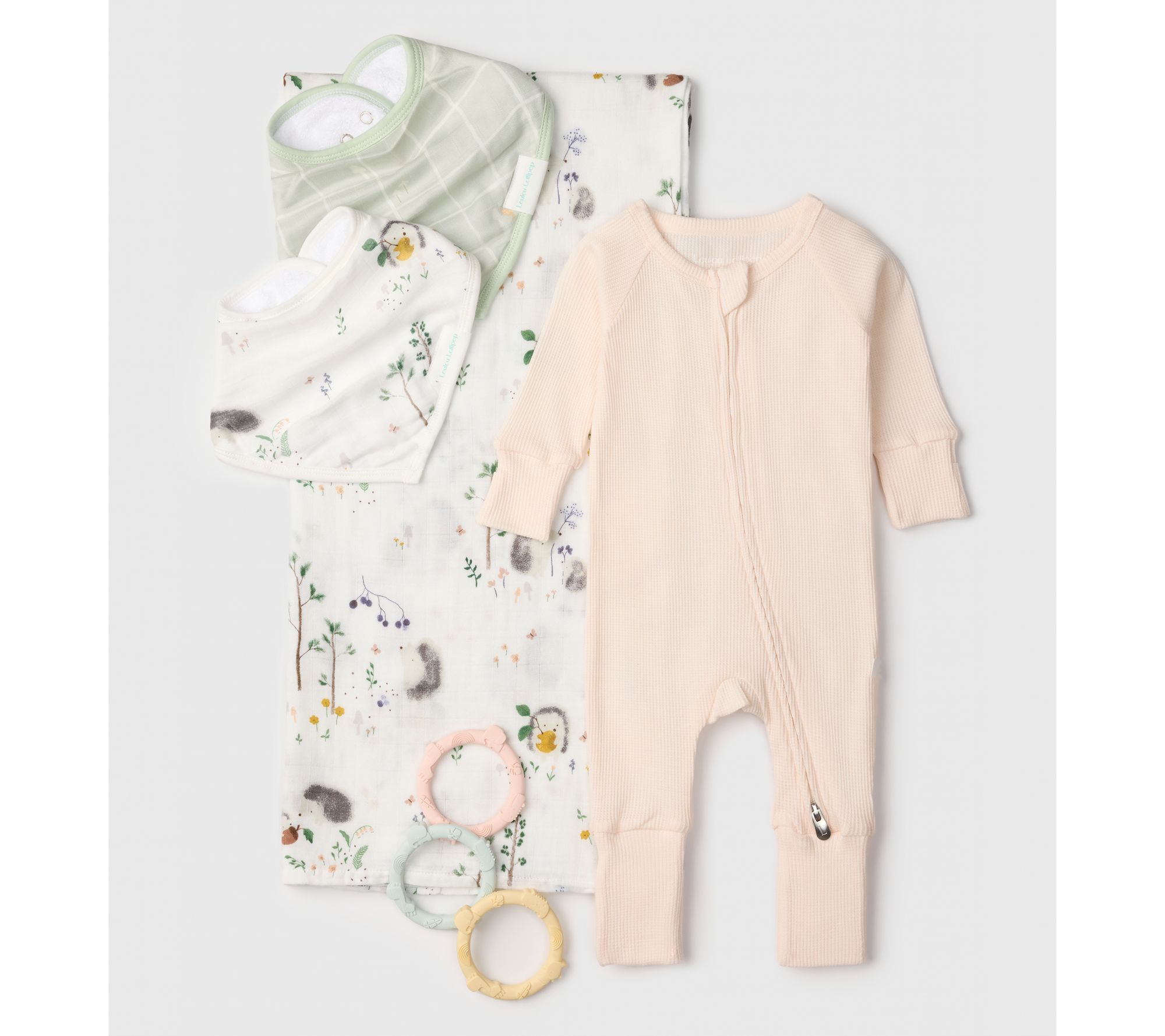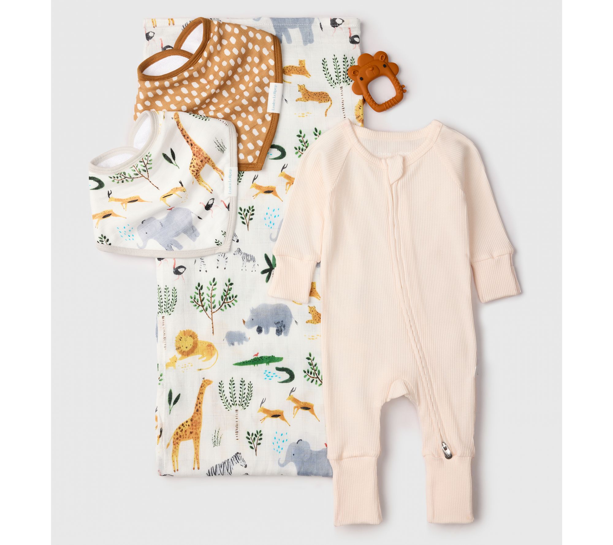• Includes swaddle, zip-up sleeper, bandana bib, and silicone teething toy