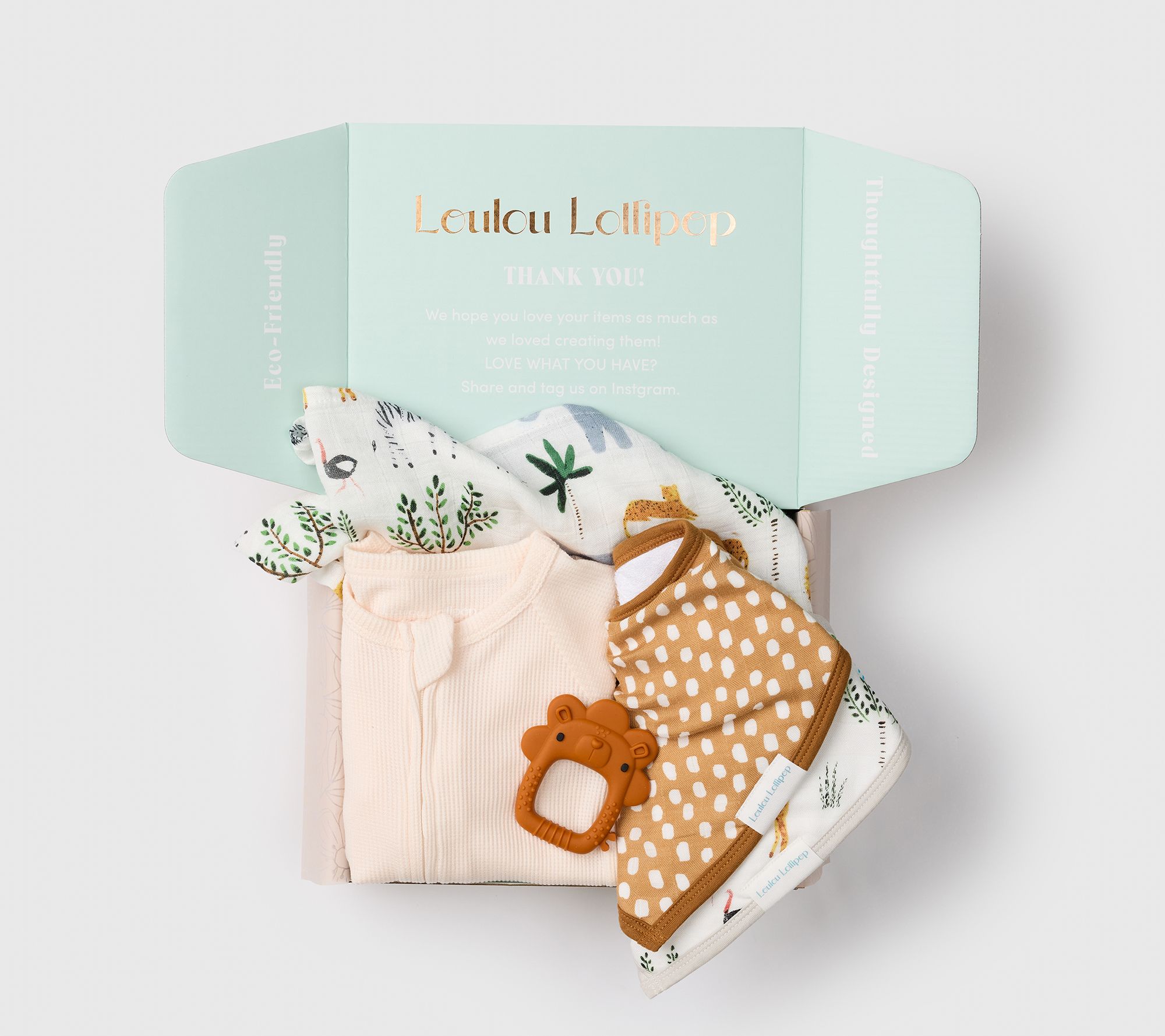 Greet the newest family member with this cuddly and charming newborn bundle. Featuring a soft sleeper, cozy swaddle, and matching bandana bib, this set ensures your little one stays snug and stylish. The included teething toy is perfect for soothing those gums and keeping tiny hands occupied. From Loulou Lollipop.