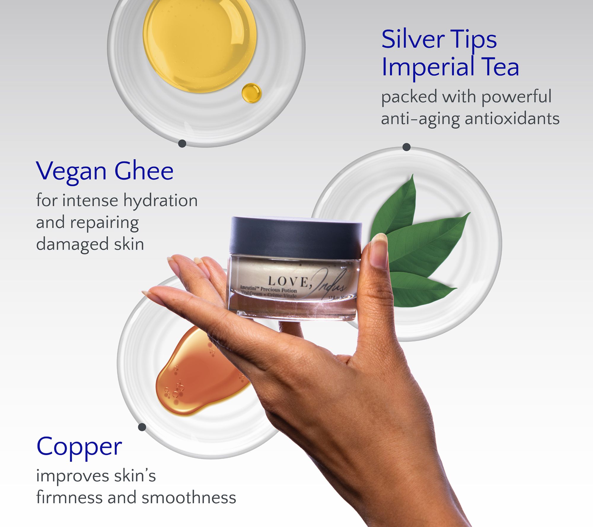 Amrutini Precious Potion is a soft, luscious moisturizer designed to support moisturization in four different ways. First, humectants like glycerin and copper help draw moisture to the skin. It's also formulated with a lamellar emulsion (containing cholesterol) to help effectively deliver moisture to the skin. Emollients such as squalane and oils (apricot oil and plant-based ghee) help seal in hydration and prevent moisture loss. And it contains Matrixyl 3000 Free which has been shown to help improve the appearance of fine lines and wrinkles.