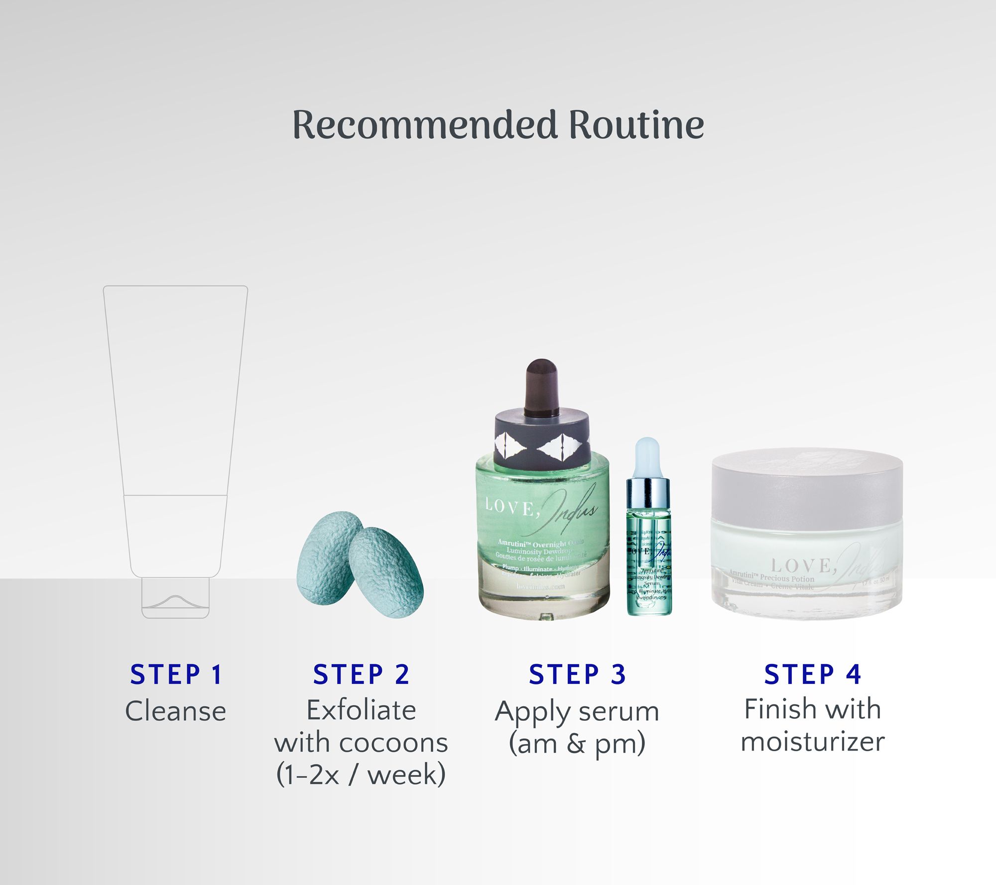 How do I use it: Soak a cocoon in warm water for a few seconds until slightly softened. Using the cocoon on your finger, gently exfoliate your freshly washed face in circular motions. Follow up by applying two or three drops of serum and gently pat it into your skin until fully absorbed. For best results, exfoliate once or twice a week with the cocoons. Use the serum daily -- both day and night.