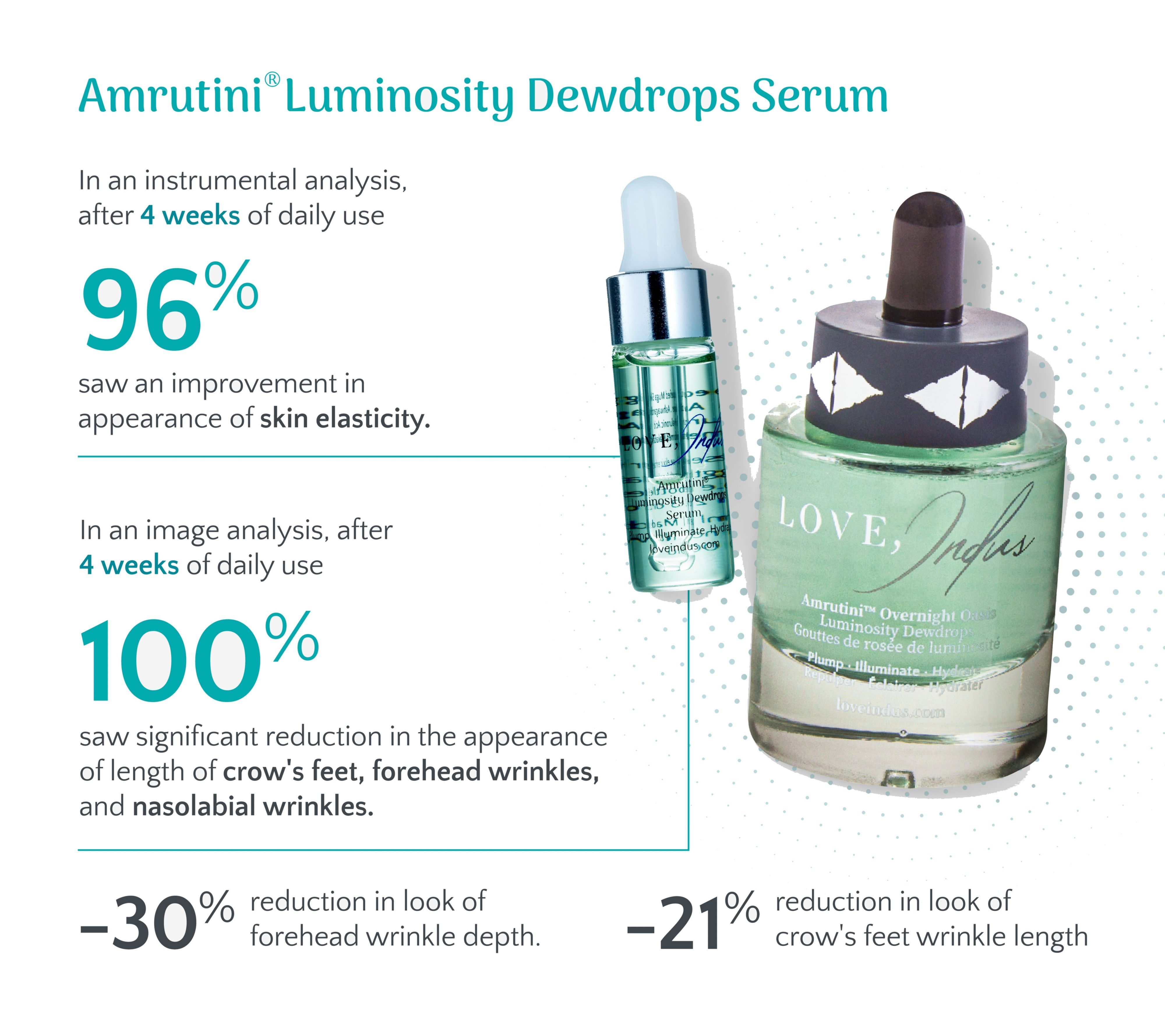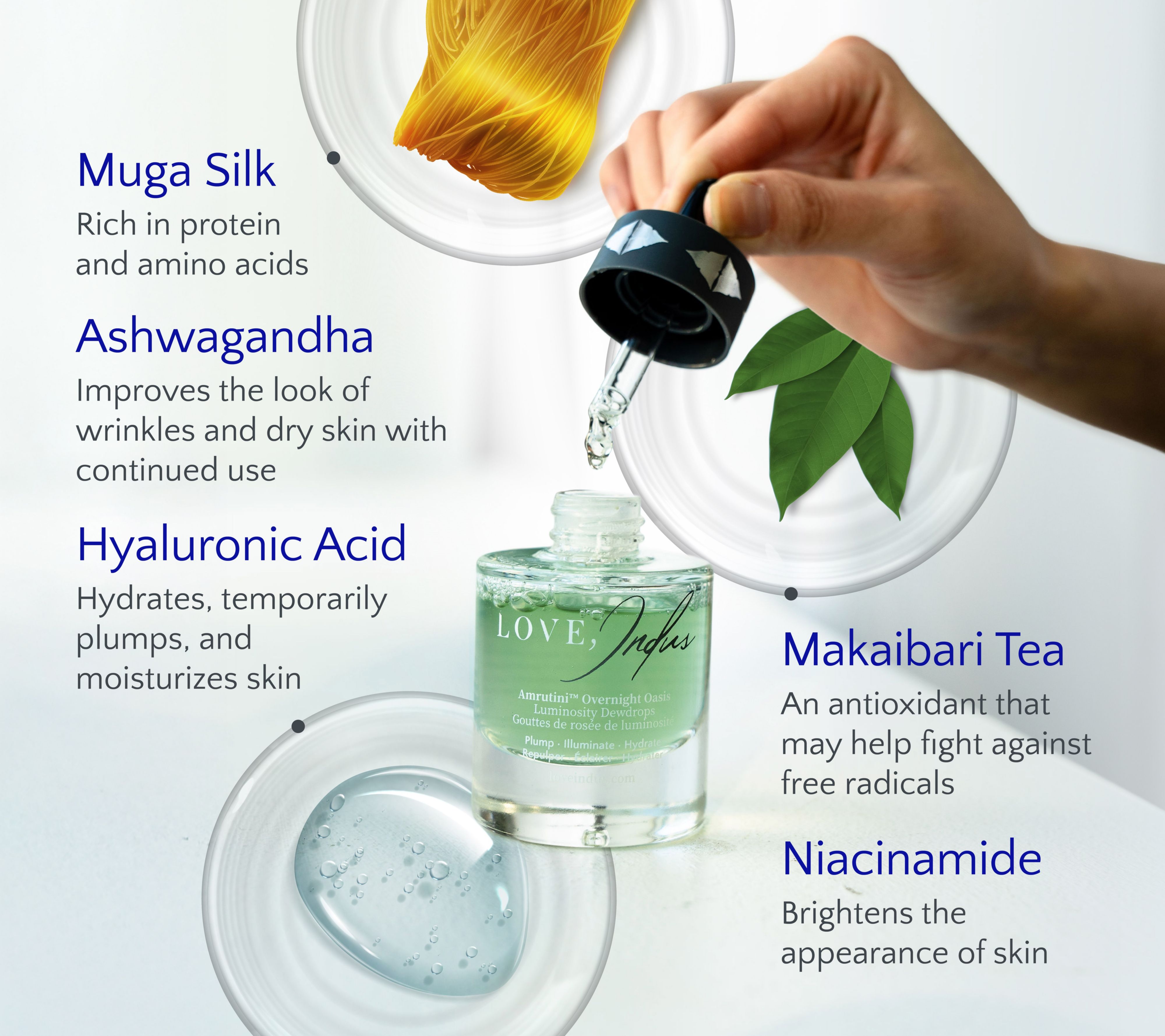 Amrutini Luminosity Dewdrops Serum is a protein-rich formula that enhances skin elasticity and radiance while reducing the look of fine lines and wrinkles. The blend of ingredients and modern technology is crafted with muga silk (rich in protein and amino acids), makaibari tea (an antioxidant that may help fight against free radicals), ashwagandha (improves the look of wrinkles and dry skin with continued use), hyaluronic acid (hydrates, temporarily plumps, and moisturizes skin), and niacinamide (brightens the appearance of skin). The serums also come with copper-encrusted silk cocoons -- an innovative, tool for exfoliation.