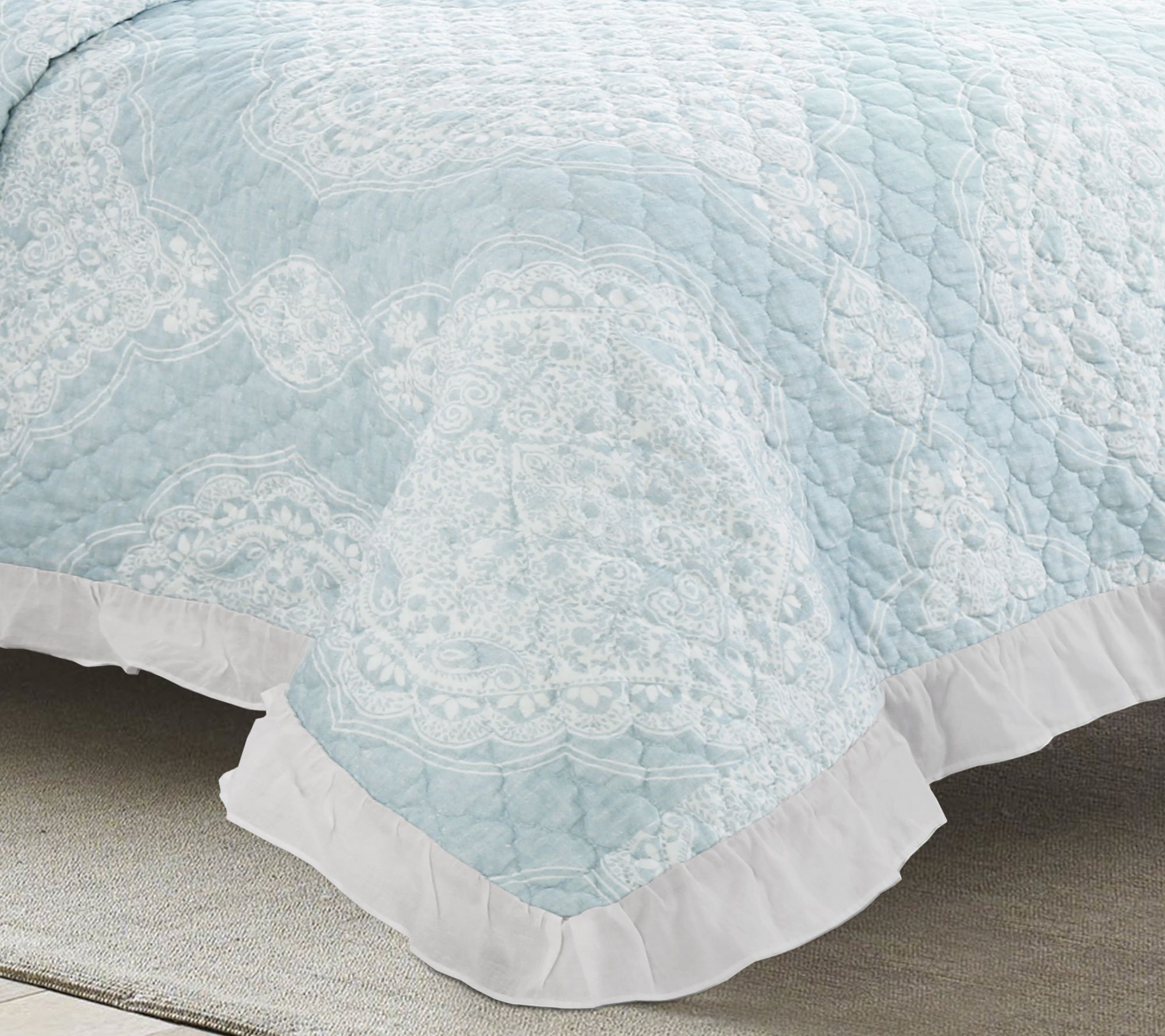 • Ruffle trim on three sides of bedspread and all sides of shams