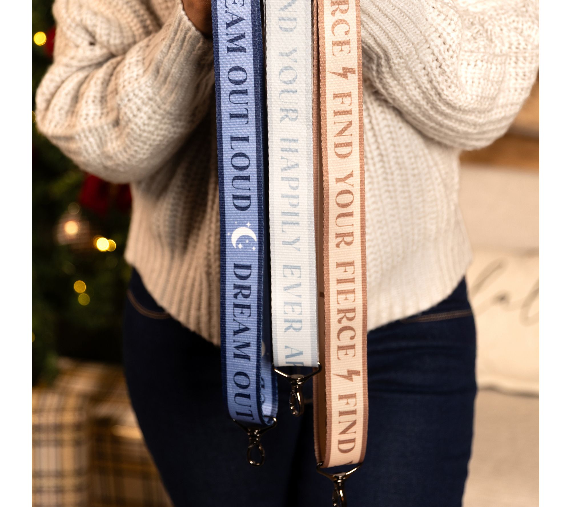 Outfit your favorite bag for any mood or adventure with this webbed inspirational strap. Uplifting phrases and a modern design instantly update your everyday tote, while the adjustable length and smooth-rotating gunmetal clasps make it easy to swap or style for every outing. From Lug.