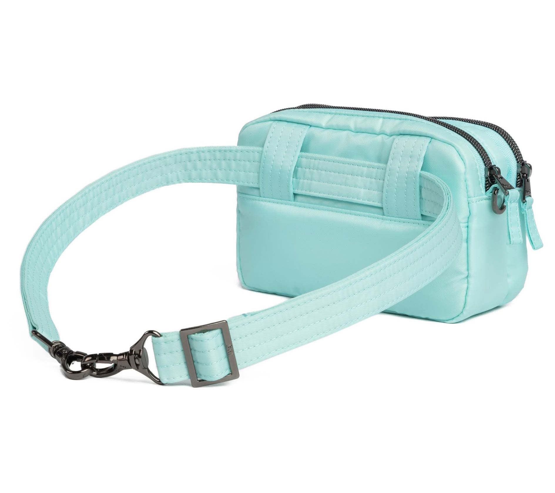 Water-repellent construction, two zipper compartments, charm bar, belt loops for wear as a belt bag, adjustable/removable crossbody strap