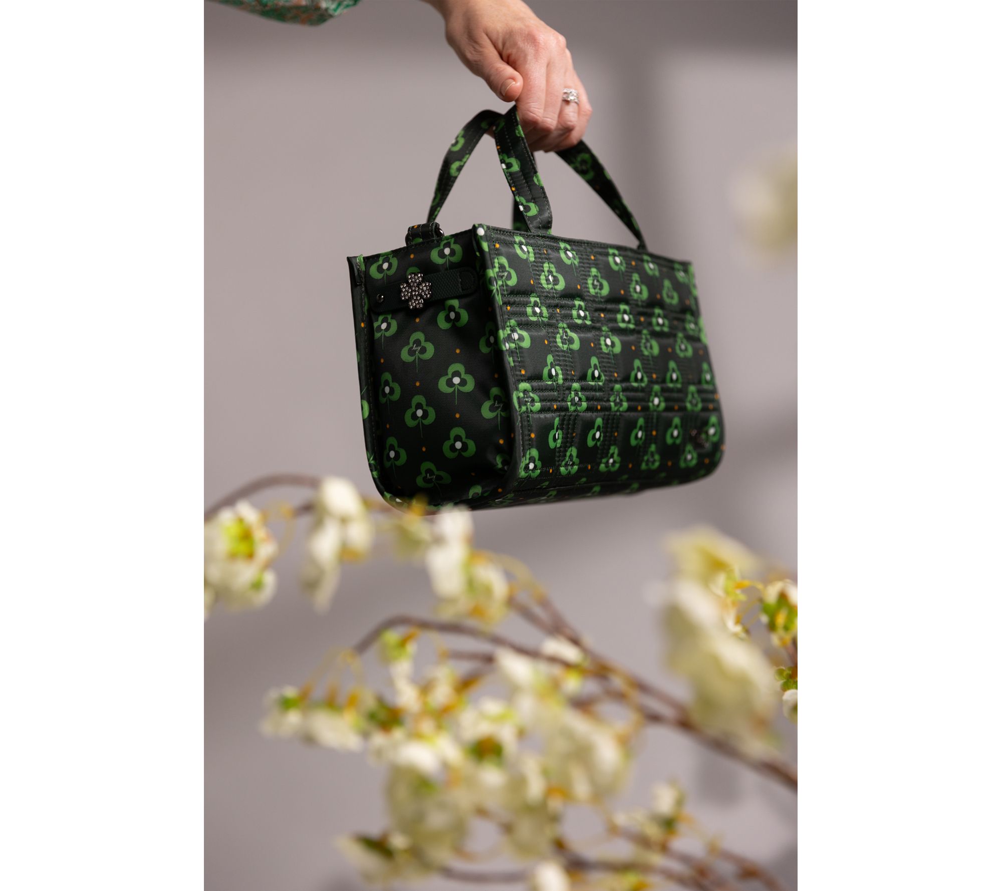 Water-repellent shell, quilted body, east/west silhouette, side charm bar, two medium-size D-rings, top handles, two magnetic soft-lined pockets, main zip closure, two XL zippers with large-hole pullers, back zip pocket, adjustable/removable crossbody strap, gunmetal hardware, floating logo